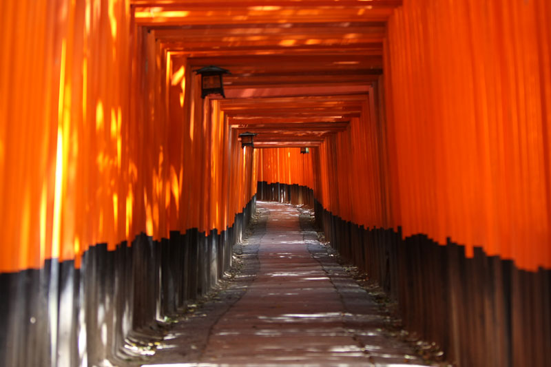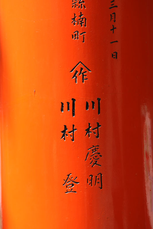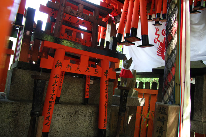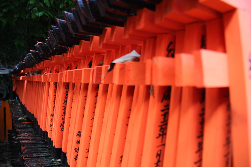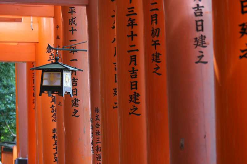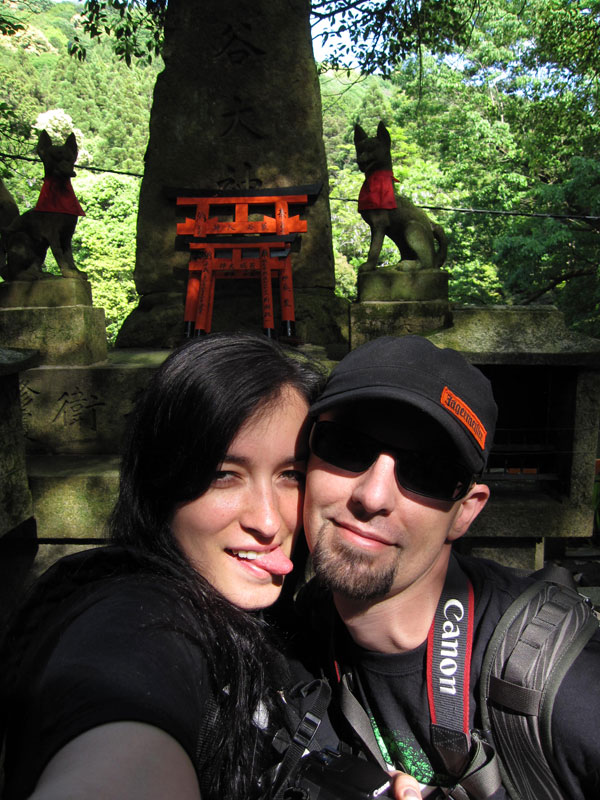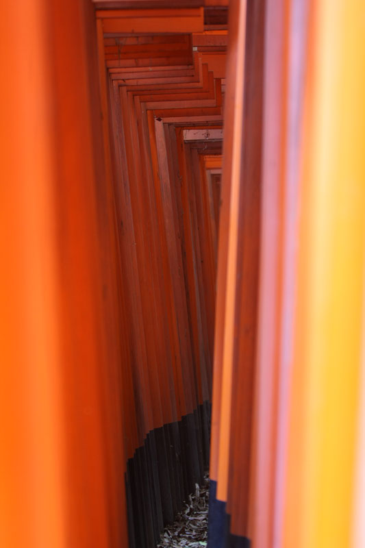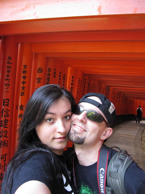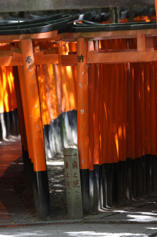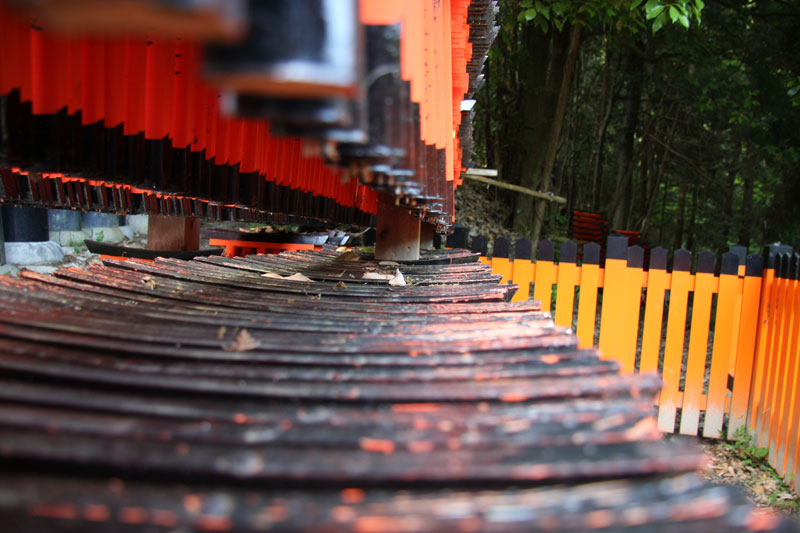 Un petit coup de bus, direction la gare de Kyoto pour faire 2 stations en train et aller voir le Fushimi inari-taysia qui a pour particularité d’avoir plusieurs centaines (milliers?) de toris. Le coin est vraiment super chouette, relativement ignoré par les touristes, le chemin couvert de toris serpente dans un petit bois ombragé. La balade fait 4 kilomètres, nous en feront un tiers, ce qui compte tenu de la topographie du terrain est déjà respectable. En haut d’une côte, je m’installe tranquille pour faire une photo puis je change d’angle pour voir si je ne peux pas faire mieux. Un touriste s’empresse de me copier et se fout devant moi, sans gêne, je le regarde en lui faisant comprendre qu’il n’est pas tout seul et là il me sort « bah quoi? t’es pas content? » « Oui j’ai un con dans mon panorama » Ha oui je suis français et je te comprends, c’est moche hein… les français je ne les aime déjà pas en France mais alors à l’étranger quand ils se comportent de la sorte… pas étonnant qu’on se traîne une réputation de mauvais coucheur mal élevé et désagréable. Oui aujourd’hui je suis en mode « j’aime pas les touristes même si j’en suis un ».