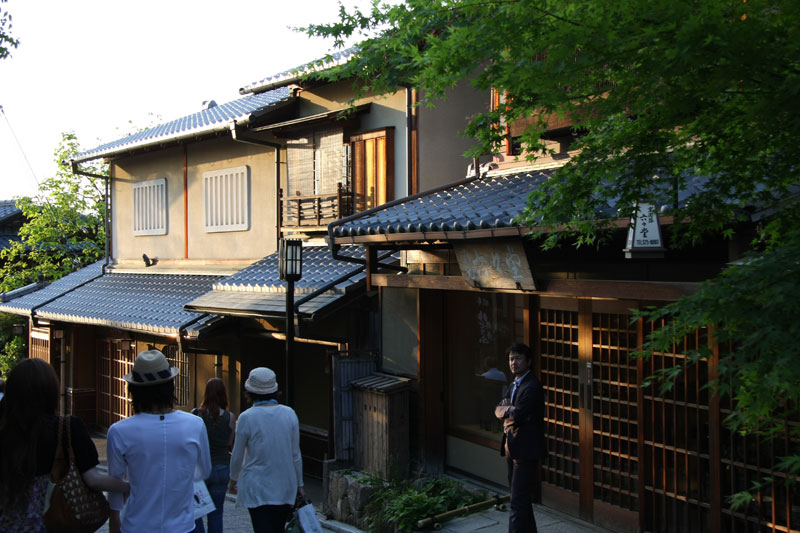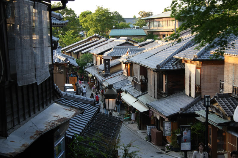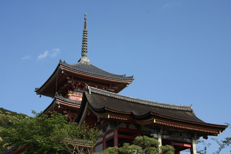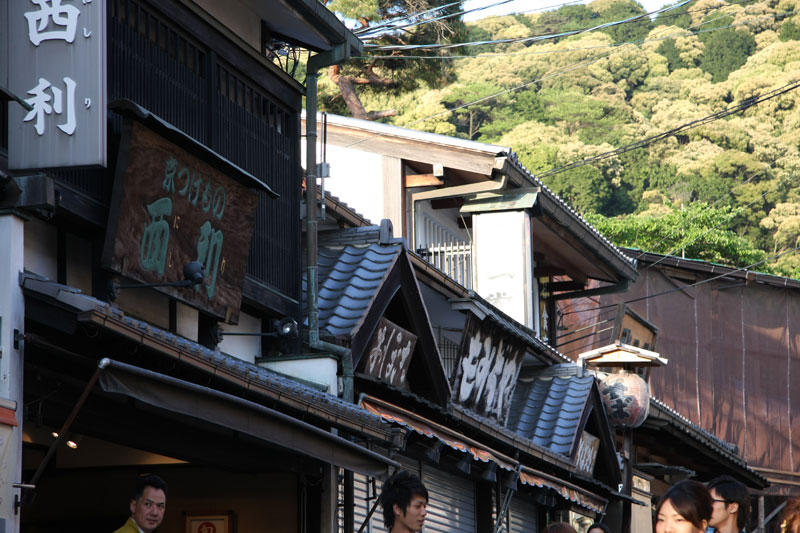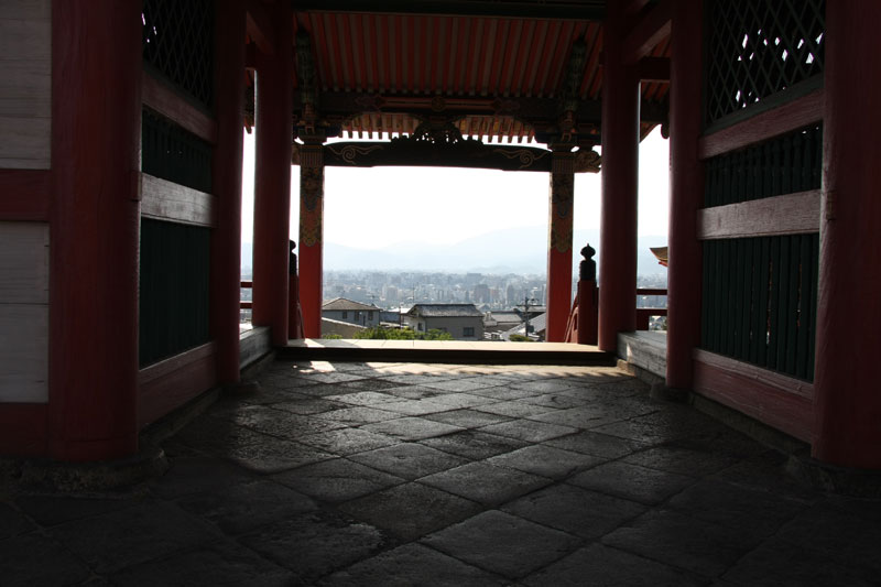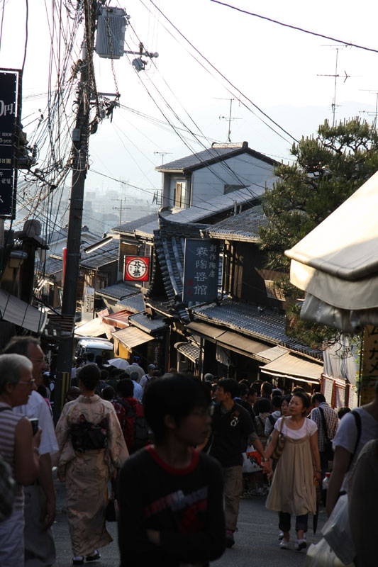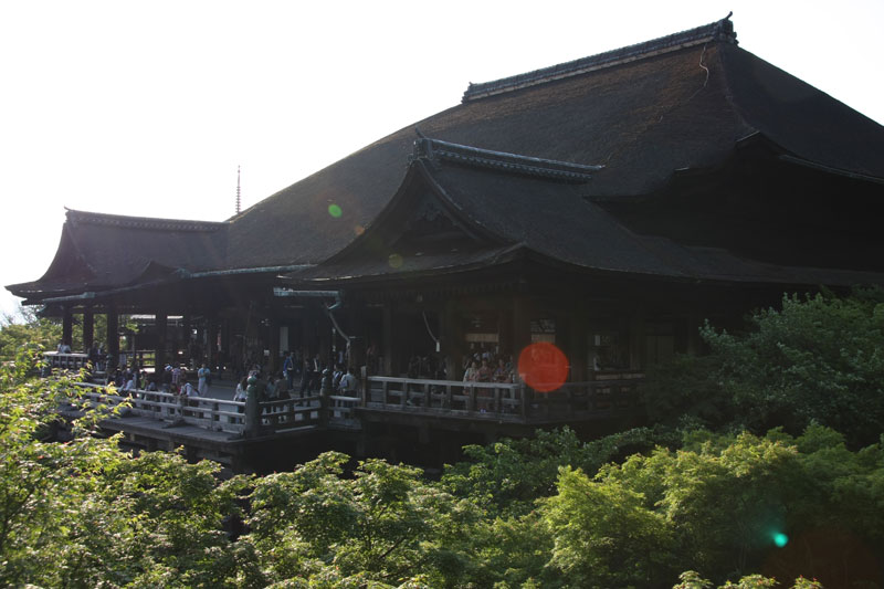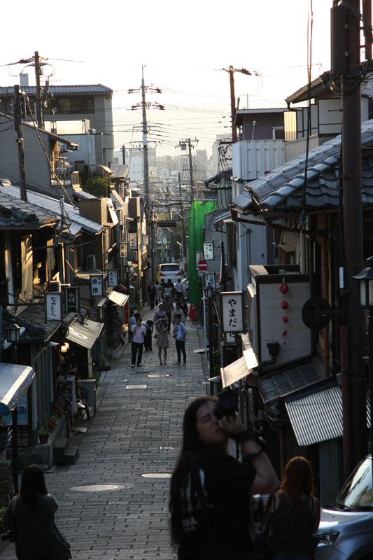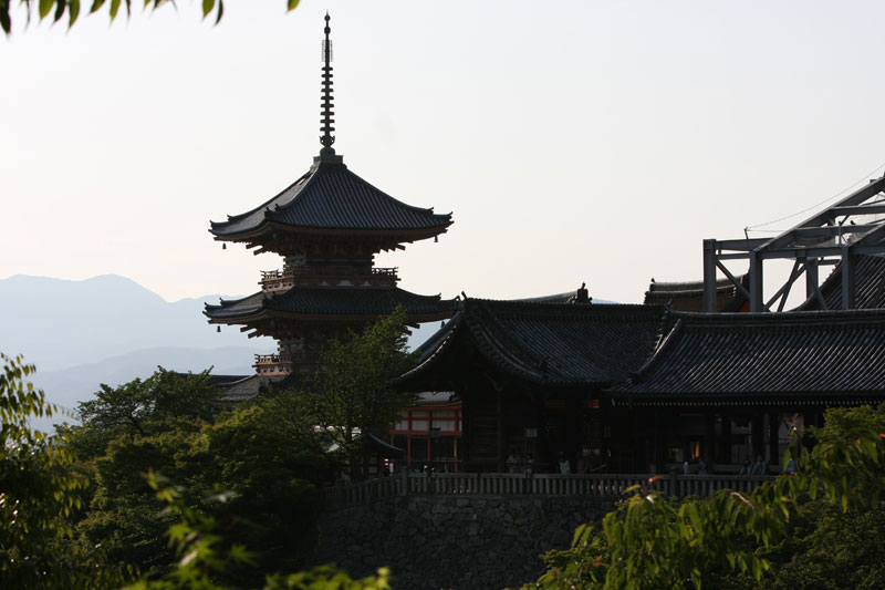 Une fois notre petite balade forestière du jour terminée, décision est prise de filer au Kyomizu pour profiter du soleil couchant. Le Kyomizu est bâti sur pilotis sur les hauteurs de Kyoto, la vue y est imprenable et au soleil couchant c’est juste « ZE panorama ». Sauf que nous ne sommes pas les seuls à avoir eu cette idée et ça grouille encore de monde, du coup j’avoue ne pas avoir vraiment profiter de la visite alors que j’adore cet endroit. Le petit bémol est qu’une partie du temple est en travaux – comme énormément d’autres sur Kyoto et Nara – du coup ça gâche un peu les photos. Vous me direz si il n’y a que ça… hein… Retour vers le bus par les ruelles du vieux Kyoto, c’est chouette, il y a peu de monde, le soleil chauffe encore juste ce qu’il faut pour que se soit agréable même si on est archi cuit.