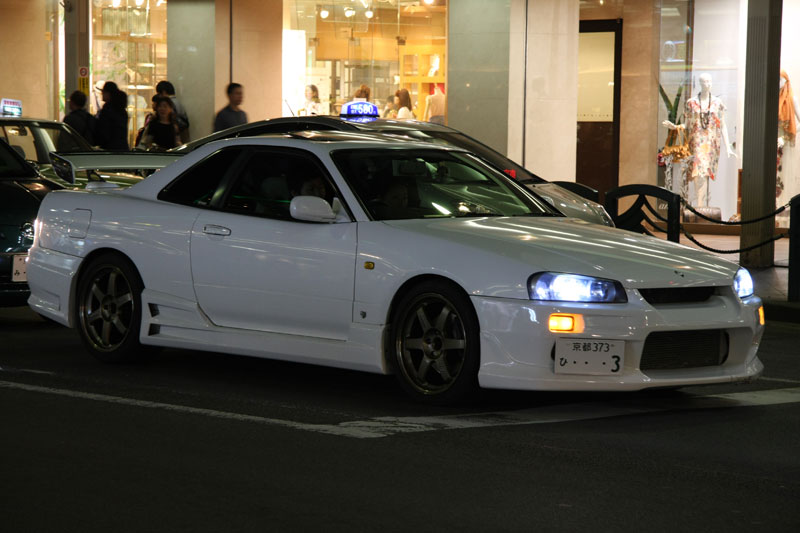 Et pour finir, sachez qu’à Kyoto c’est l’empire de la voiture qui tue! En effet, si à Tokyo j’étais resté sur un maigre bilan (3 Hummers, 2 Ferraris, 1 Lamborghini, 1 Maserati, 1 Nissans GT-R, quelques jaguars et beaucoup de grosses allemandes type Mercedes classe S), ici en une soirée on a fait péter le compteur: 2 Hummers, 1 Bentley Continental GT, 1 Bentley Continental Flying Spur (je n’en avais jamais vu) avec des gentes d’une taille pas possible, une Honda NSX, un superbe scooter au bruit de Harley Davidson avec des néons roses, 1 Porsche Panamera, 1 Porsche 911 Turbo GT3 et un des amours de ma vie: une Nissan Skyline R34.