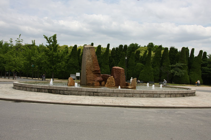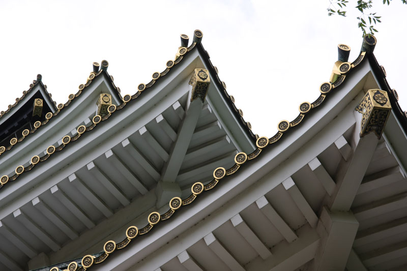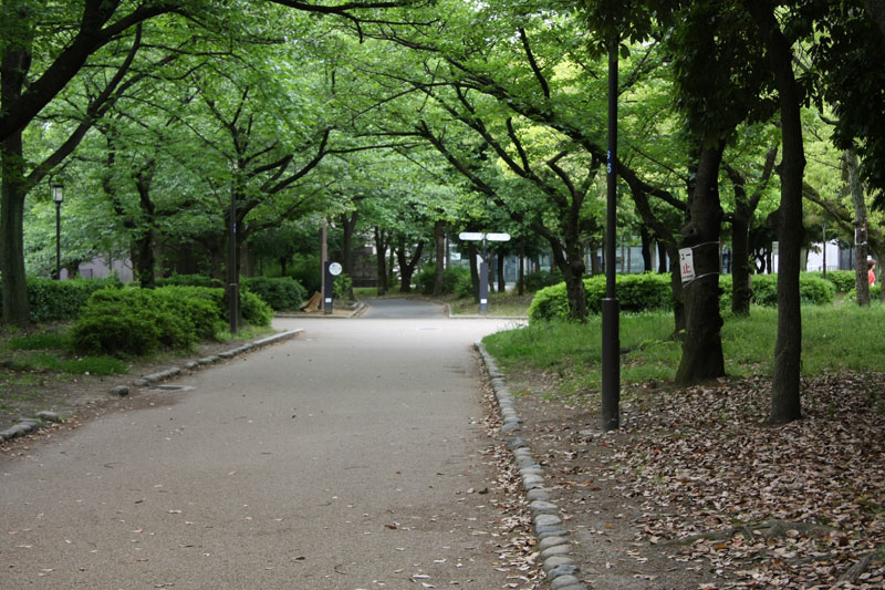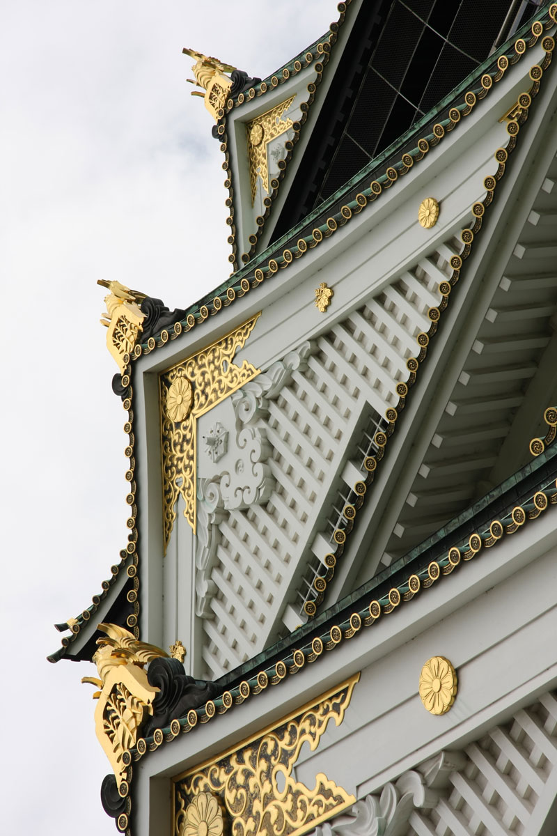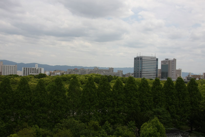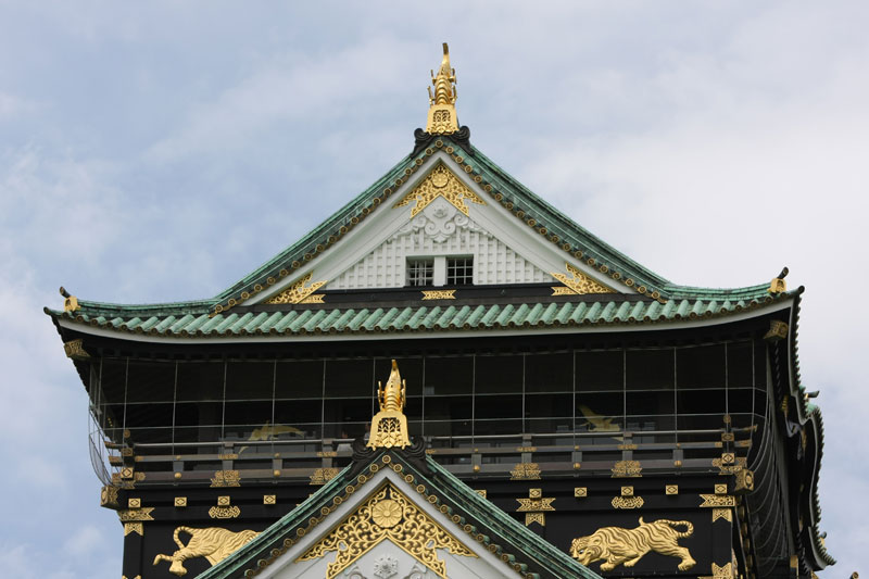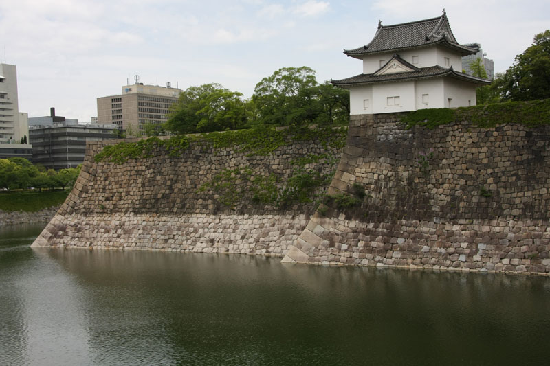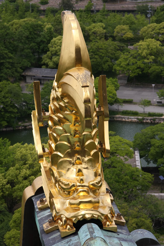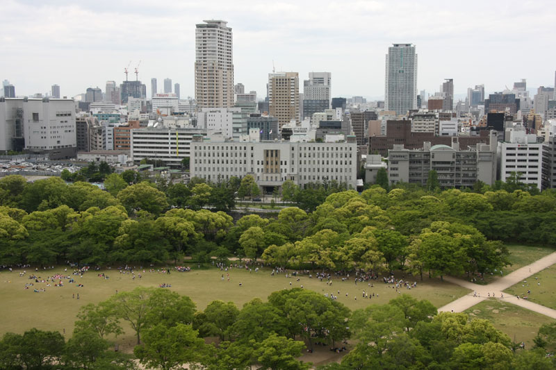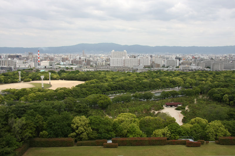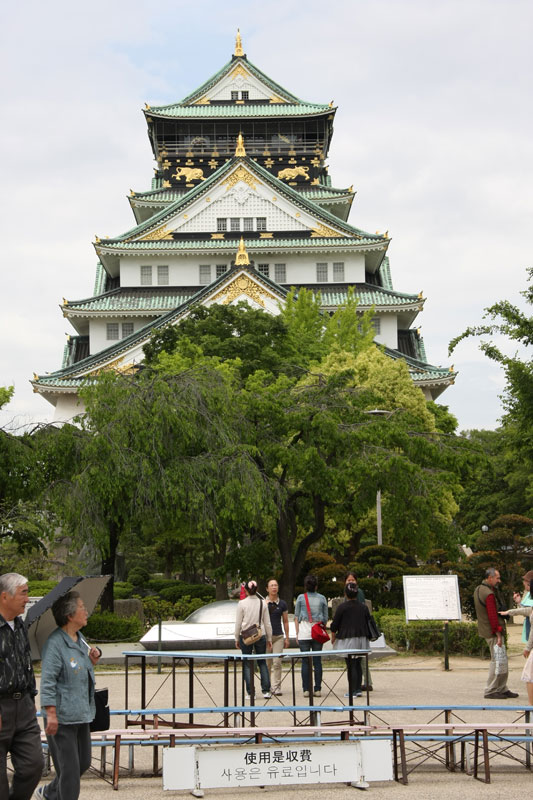 Nous traversons le parc du château sous un grosse chaleur, ça cogne encore ce matin. Le parc du château et le château lui-même sont à l’image de la ville: relativement insipides. Si extérieurement le Osaka Jo présente bien, intérieurement c’est une autre histoire. Rasé pendant la guerre et reconstruit dès la fin de celle-ci, le château est en fait un bête piège à touristes avec un panorama des tours avoisinantes que l’on vend à prix d’or sous couvert de lieu chargé d’histoire. Alors oui, le château a eu un rôle important historiquement parlant sur l’évolution de la région du Kansai au cours des siècles passés mais en plus du petit laïus historique, on aurait aimé voir une reconstitution de l’intérieur du château comme à l’époque et autre chose que des vitrines dans des étages en béton. Sachant qu’en plus, le château d’Himeji n’est qu’à 40 minutes de là en shinkansen et qu’il est d’une toute autre classe, ça fait mal au moral de voir celui-là. Le hic c’est qu’Himeji est en travaux jusqu’en 2011 donc forcément, on fait avec les moyens du bord.