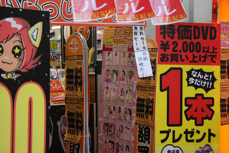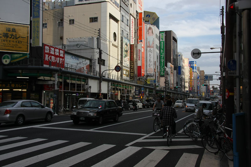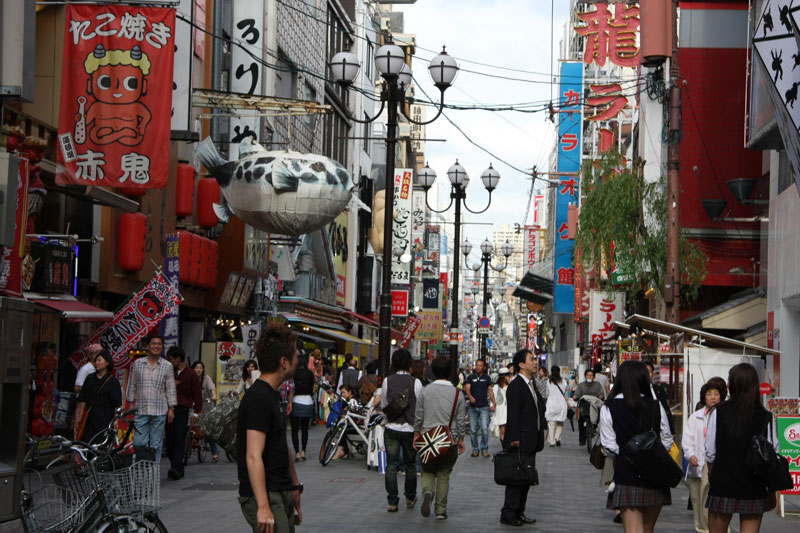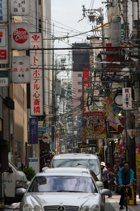 Direction ensuite Dotonbori pour un petit trek dans un des quartiers les plus réputés de la ville pour son animation. Ha ça oui c’est vivant, c’est même un joyeux foutoir de boutiques aux enseignes délirantes, à la musique qui crie sur les pas de porte quand ce n’est pas un gus avec un porte voix. Bref c’est le souk. Nous déambulons là-dedans en direction de Den Den Town, équivalent local d’Akihabara à Tokyo. La différence étant que Den Den a encore ce qui faisait il y a peu le charme d’Akiba: des petites boutiques vendant des ordis ou des écrans ou dieu sait quoi et où tout est en vrac. On passe d’un vendeur de téléphone d’occasion à une boutique de DVD cochons puis à un magasin de consoles. Il y a les dernières nouveautés hardware pour se faire un PC de compétition, des magasins de goodies et figurines en tout genre: bref le pied.