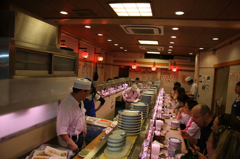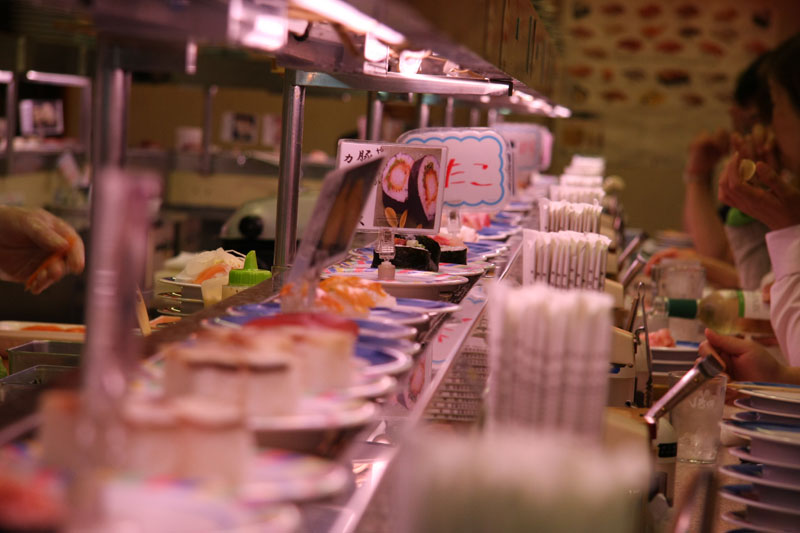 Malgré quelques trajets en métro (qui coûte un bras d’ailleurs), la majorité des déplacements se sera faite à pied. Nous sommes donc tous complètement épuisés et c’est avec soulagement que j’ai posé mes fesses dans le shinkansen du retour. Nous sommes allés nous finir notre journée au sushi tournant (je vous ai déjà dis combien j’aimais leur saumon?) et là, je suis littéralement en train de me liquéfier. Il fait une chaleur infernale malgré la douche, la clim et la pluie dehors.