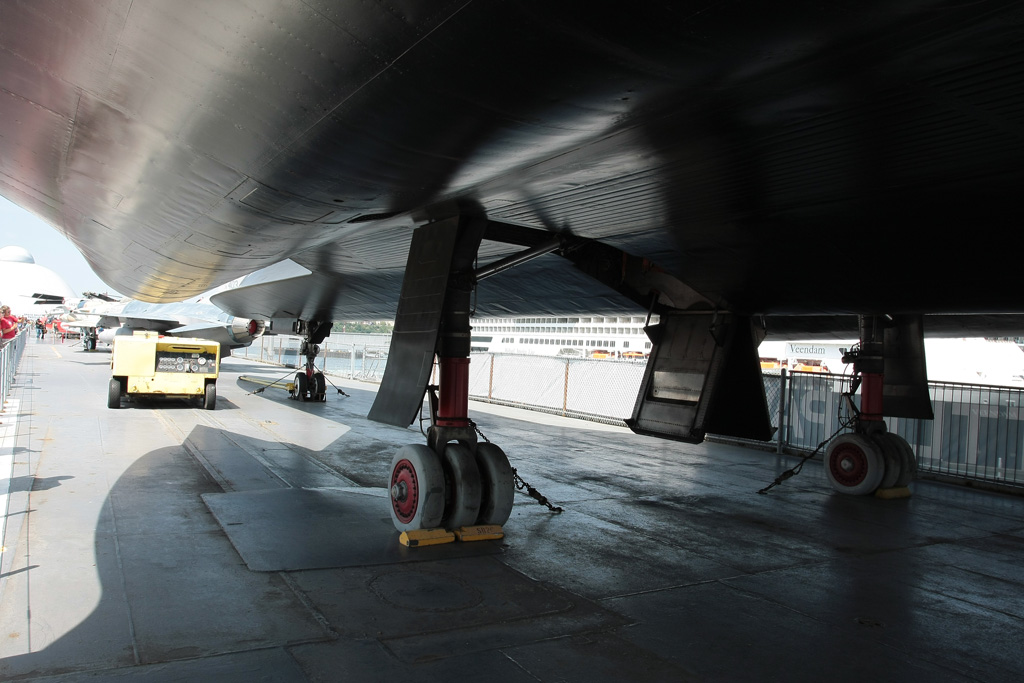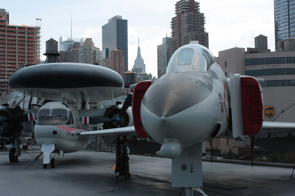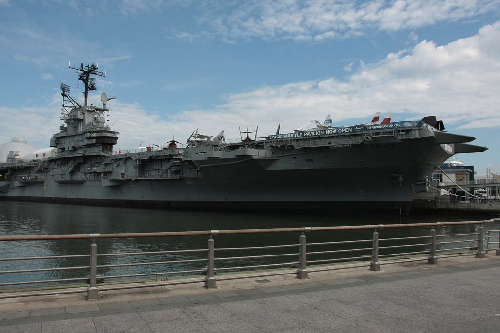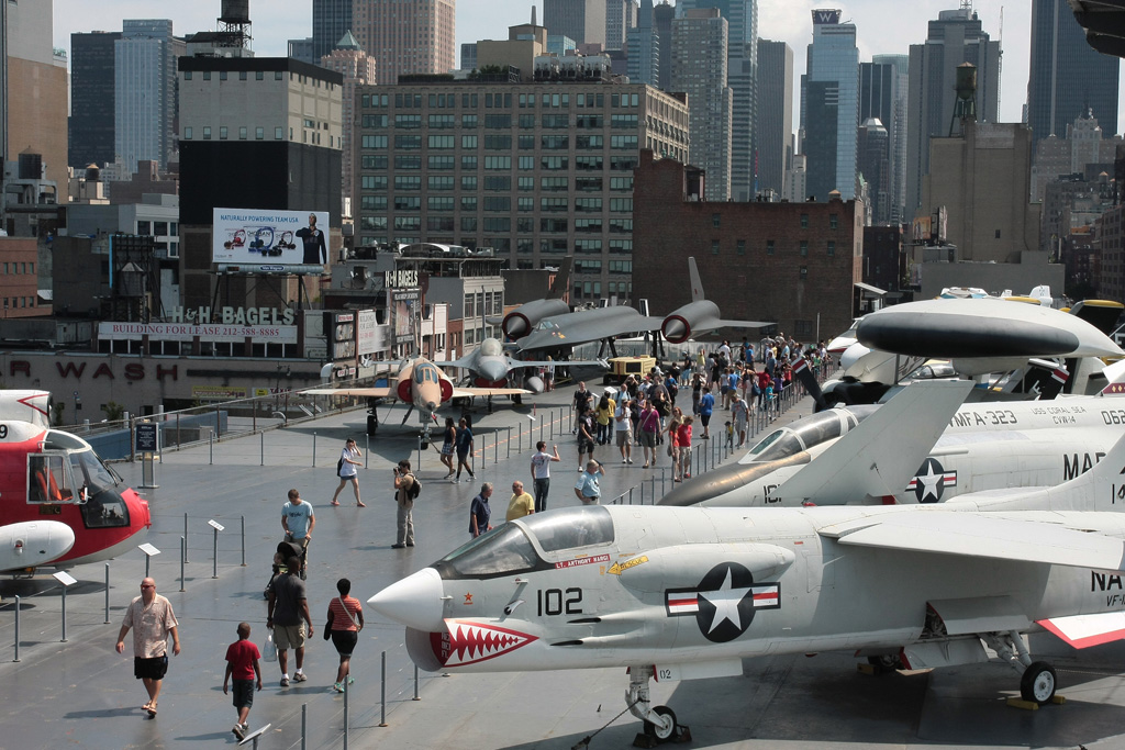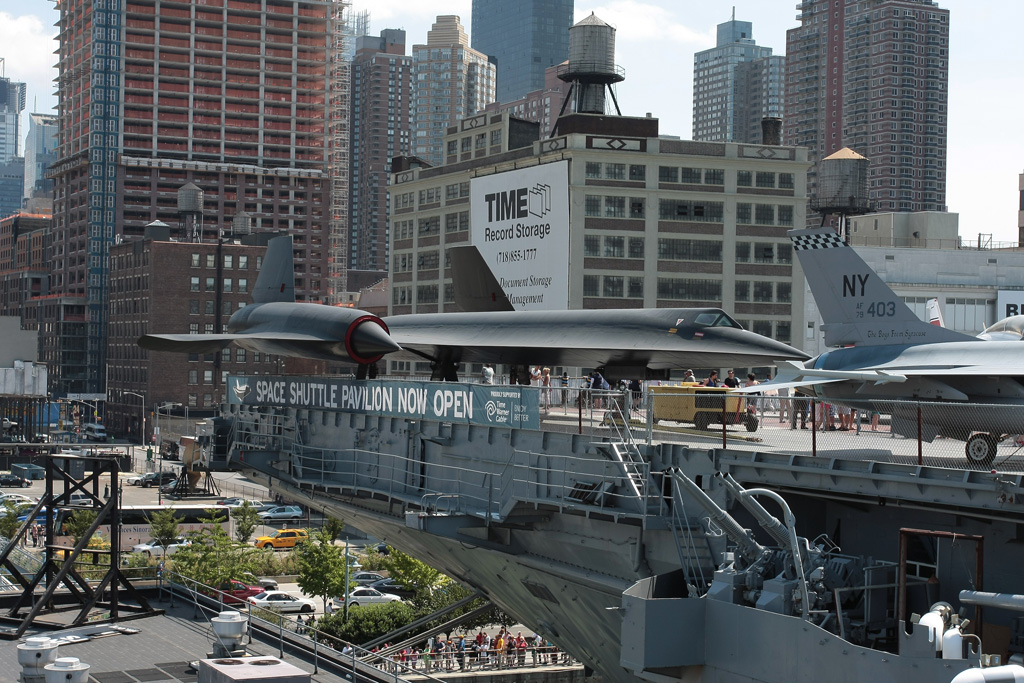 Direction l’Hudson River via le métro en direction du Port Authority Bus Terminal (la gare routière) puis nous terminerons à pied pour arriver à l’USS Intrepid qui comme son nom l’indique est un bateau de guerre. Et pas n’importe lequel puisqu’il s’agit d’un porte-avion (qu’on ne voit hélas dans aucun film). Oui il y a un porte-avion à NY et même un sous-marin ! Les 2 constituent le Air & Space Museum. Nous arrivons pile pour l’ouverture et après une petite vingtaine de minutes d’attente, nous voilà dans l’USS Growler, un sous-marin conçu dans les années 50 pour passer sous les glaces et aller balancer les ancêtres des missiles de croisière sur les Russes. Claustrophobes s’abstenir. L’endroit est exigu, bas de plafond et il y fait une chaleur pas possible. Visite instructive cependant. Nous traversons ensuite le quai pour ce qui sera le clou de la visite : l’USS Intrepid, porte-avion aujourd’hui désarmé et ayant servi pendant la guerre de Corée ainsi qu’au Vietnam et qui a finit sa carrière dans le Pacifique car c’est lui qui récupérait les capsules spatiales du programme Apollo à leur retour sur terre. Bien entendu on n’en visite qu’une infime partie. Le kiosque avec la passerelle de commandement, le hangar principal dans lequel sont installés quelques avions (un Avenger de la seconde guerre, un Skyhawk du Vietnam et un F86 Sabre de la Corée). Sur le pont d’envol en revanche se trouvent de véritables merveilles ! Outre un Super Etendard français, on trouve 2 Migs russes, un Harrier britannique, un Concorde, 4/5 hélicos, un F4 Phantom II mais surtout un F14 (Top Gun tout ça) et un SR-71 Blackbird – avion espion de son état qui volait à plus de mach 3. Deux de mes avions favoris côte à côte, n’en jetez plus ! Mais il y a mieux. La dernière acquisition du musée se trouve à l’autre bout du pont, il faut un ticket spécial pour y accéder car la pièce est exceptionnelle – et pour le coup je n’exagère pas et elle est protégée dans hangar pressurisé. Car il s’agit d’une navette spatiale ! Une vraie ! Une des 6 construites par la NASA. Compte tenu qu’il n’en reste que 4, 2 ayants été détruites (Challenger et Columbia), les 4 autres ont pris la direction de musées à travers le pays depuis la fin du programme il y a quelques années et celle que nous avons eu sous les yeux est la plus rare et j’envie de dire la plus exceptionnelle car elle n’est jamais allée dans l’espace. L’Enterprise (oui comme le vaisseau de Stark Trek ce n’est pas un hasard) est la première des 6 à avoir été construites et a servi de prototype pour les essais en vol avant la construction des 5 autres. A la base nous avions décidé de faire l’impasse sur la navette car il faut payer un supplément, cependant Lucille a trouvé des bons de réduction à la réception de l’hôtel. Les 20% de réduction couvrant le supplément, c’était tout bénéf’ pour nous !