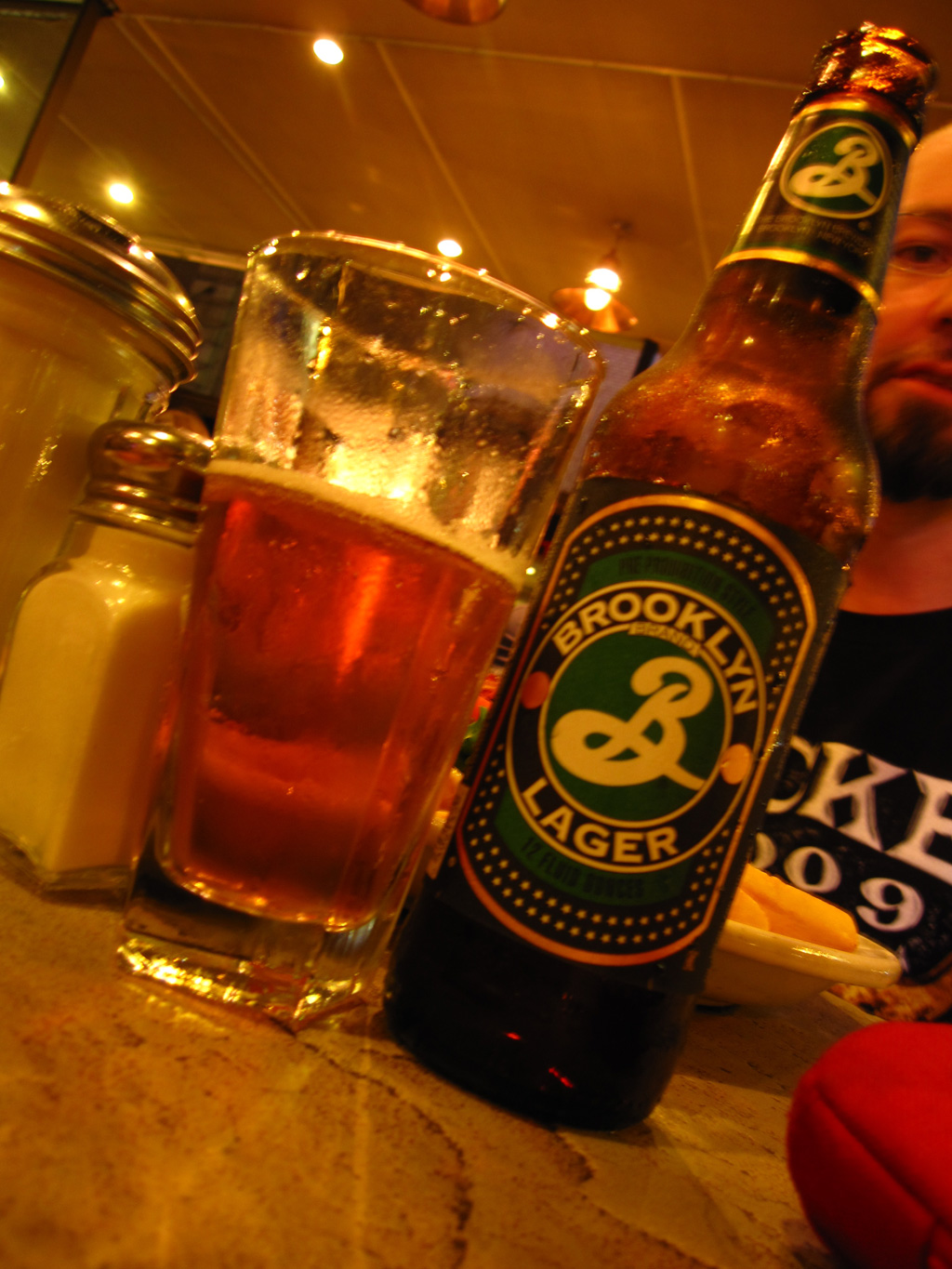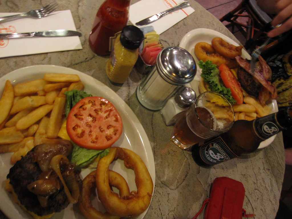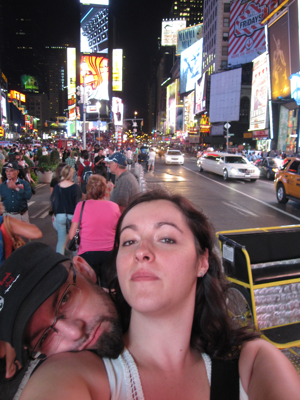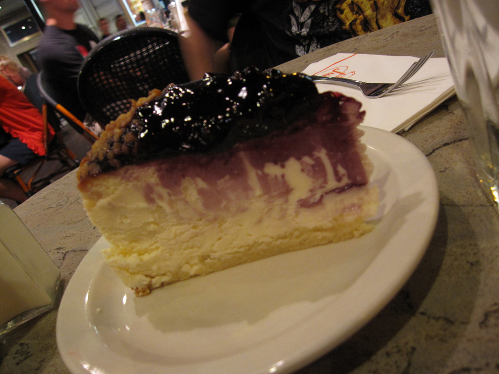Après avoir mis au repos la voute plantaire pendant une bonne heure, direction Time Square pour dîner dans un resto avec lequel la famille Brun nous a saoulé en nous disant que c’était bien etc etc. Nous voilà donc chez Junior’s, en terrasse avec vu sur Time Square. En fait le resto n’a rien d’exceptionnel, il est juste immense, bien situé, grouillant de monde et passant un type de musique qui correspond tout à fait à ce que mes parents aiment. Bref, tout va bien jusqu’à ce que le serveur échappe le vers de jus d’ananas de Lucille et lui renverse sur les genoux. Surprise, elle pousse un cri et se lève, le serveur se décompose littéralement puis se confond en excuses en épongeant tout ce qu’il peut. Pas bien grave, il ramène un plat à Lucille en continuant de s’excuser, là-dessus son manager rapplique, nous dit « j’espère que le jus d’ananas était rafraîchissant » dans un grand sourire pensant que nous étions en colère – en fait on était plutôt en train de se marrer comme des baleines. Tout ça pour nous dire qu’il nous offre le dessert. Mais avant le dessert, il faut venir à bout d’un burger de la taille d’un gratte-ciel, avec une quantité de bacon suffisante pour nourrir la Somalie pendant un mois et je ne vous cause pas des frites. Une fois les 3 millions calories avalées, voila notre serveur qui rapplique avec la carte des desserts, attention la spécialité maison est le cheesecake. *burp* Et nous voilà avec une portion de cheesecake blueberry dont la densité permettrait de refaire tous les joints d’une salle de bain. C’est bon, mais alors après un dîner pareil, se farcir une tranche de ce gabarit, même à 2 c’est un suicide gastrique. Au moment de payer, le serveur se confond encore en excuses et ramène même son pourboire (car ici le service n’est pas inclus) en disant qu’il avait renversé le verre etc etc. Bon ça va c’est pas un drame, échappé un verre ça arrive, ici ça avait l’air d’être une affaire d’état.