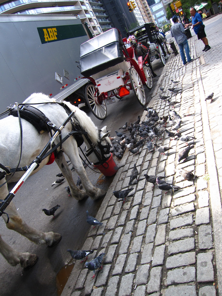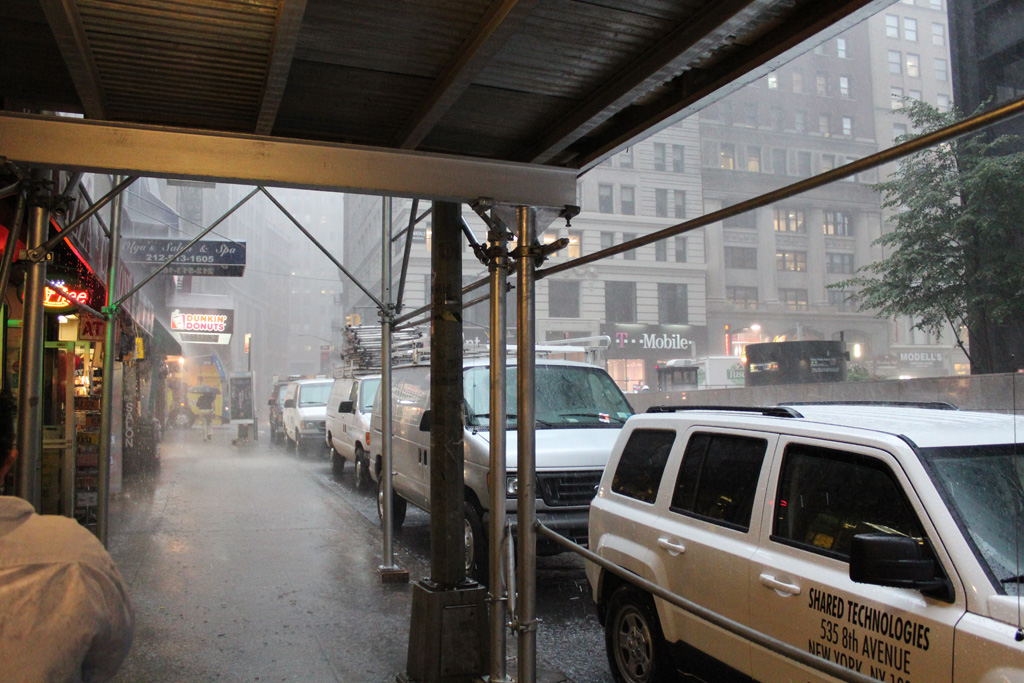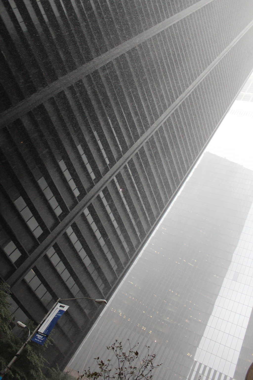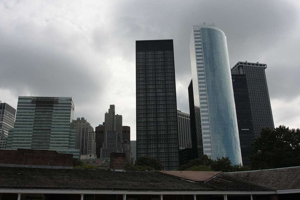 Une fois le musée terminé, direction le One Liberty Plaza qui se trouve être le siège de vente-privée aux USA. Rassurez-vous, nous n’avons pas fait le chemin jusque là juste pour ça car en face se trouve Century 21. Rien à voir avec les agents immobiliers, c’est un magasin de déstockage qui vend des marques à prix cassés. Enfin prix cassés tout est relatif hein ! Certes il y a de bonnes affaires mais les quelques produits intéressants sont en quantité tellement limitée que c’est un peu la guerre là dedans. Car l’endroit est connu et ça grouille de touristes avides de bons plans. Je me suis fait insulté en espagnol dans le texte pour avoir osé toucher la seule paire de Timberland à ma taille alors que la connasse en avait déjà 3 dans les bras. Peu importe, nous étions juste venu pour voir, pas pour acheter. En sortant de là, on se regarde avec Lucille et on se fait la réflexion en même temps « tiens on dirait qu’il fait nuit ». Nuit non, il était 11h30 par contre il pleuvait façon tempête tropicale ! Tonnerre, pluie très dense et ciel tellement bas que le haut de certaines tours étaient carrément invisible !