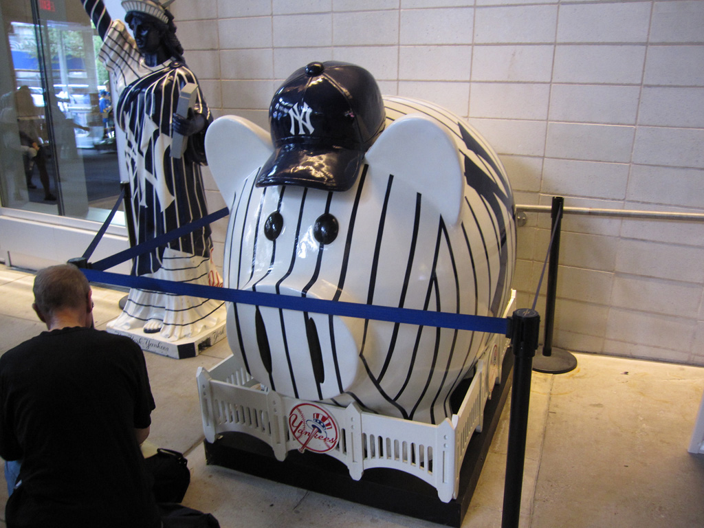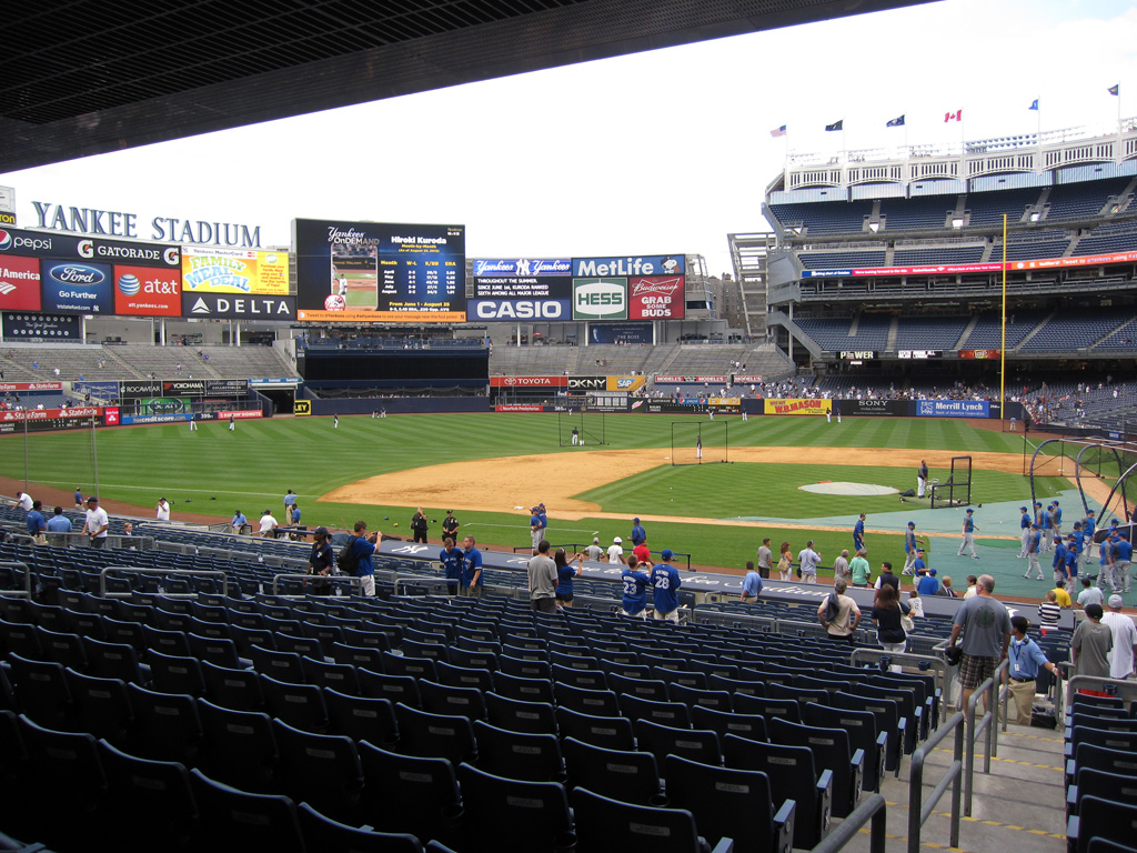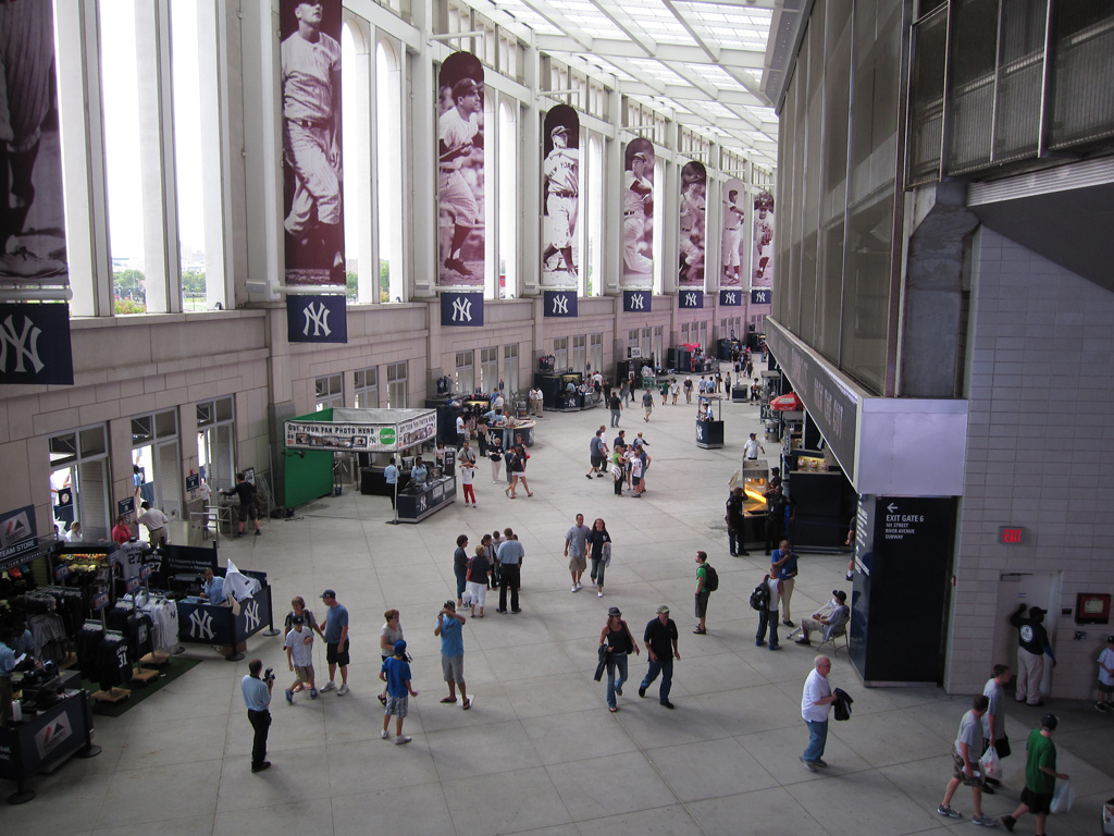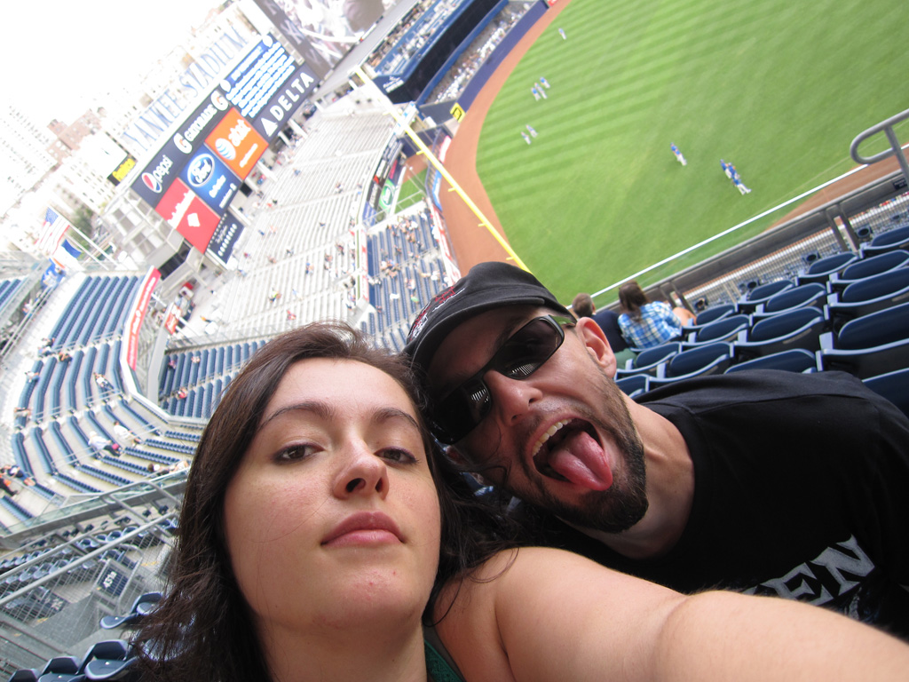 Heureusement le métro est juste en face et nous nous jetons dedans direction l’hôtel, nous déjeunons sur le chemin. Après une réflexion sur le programme de cette fin d’après midi, nous nous disons qu’aller au stade tôt peut être une bonne idée puisqu’il y a un musée à voir. En chemin je me dis aussi que nous pouvons faire un stop à Harlem pour voir l’Apollo Theatre, célèbre salle de concert où sont passés les Jackson Five, James Brown et beaucoup d’autres. Seulement notre métro est un express du coup je n’ai pas fait attention à l’arrêt où nous étions. Je n’ai réalisé que plus tard que nous avions loupé l’arrêt. Bon bah tant pis. De même, nous avons failli manquer l’arrêt du stade, Lucille a eu un éclair de génie en levant le nez au dernier moment et nous avons bondi hors du train peu avant la fermeture des portes. Et nous voila donc devant le Yankee Stadium, l’antre des New-York Yankees, une des 2 équipes pro de la ville et sans doute l’équipe de baseball la plus connue au monde. Une fois sur place, nous découvrons que le musée est en fait dans le stade et donc pas accessible depuis l’extérieur. Pas grave nous prenons notre mal en patience au frais dans une des nombreuses boutiques 100% Yankees car du coup nous sommes très en avance, il est 16h30, les portes ouvrent à 17h et le match débute à 19h. Une fois les tickets récupérés, sans même faire la queue, direction la porte 2 pour entrer dans ce très beau stade, construit en lieu et place de l’ancien et inauguré en 2009. L’accès est aisé aussi bien autour du stade (3 lignes de métro, des parkings géants) que dans le stade avec des rampes d’accès très larges, de quoi permettre aux 56.000 spectateurs de se promener sans se gêner. Ce soir l’affluence sera d’un peu plus de 42.000 personnes. Nous étions situés au 3ème balcon, tout en haut du stade où les places sont les moins chères (environ 16$), ailleurs on est plus près du terrain mais le prix n’est plus tout à fait le même, certaines dépassent les 500$ et les loges c’est juste délirant. Tout ça pour dire que quelque soit l’endroit, on voit parfaitement bien.