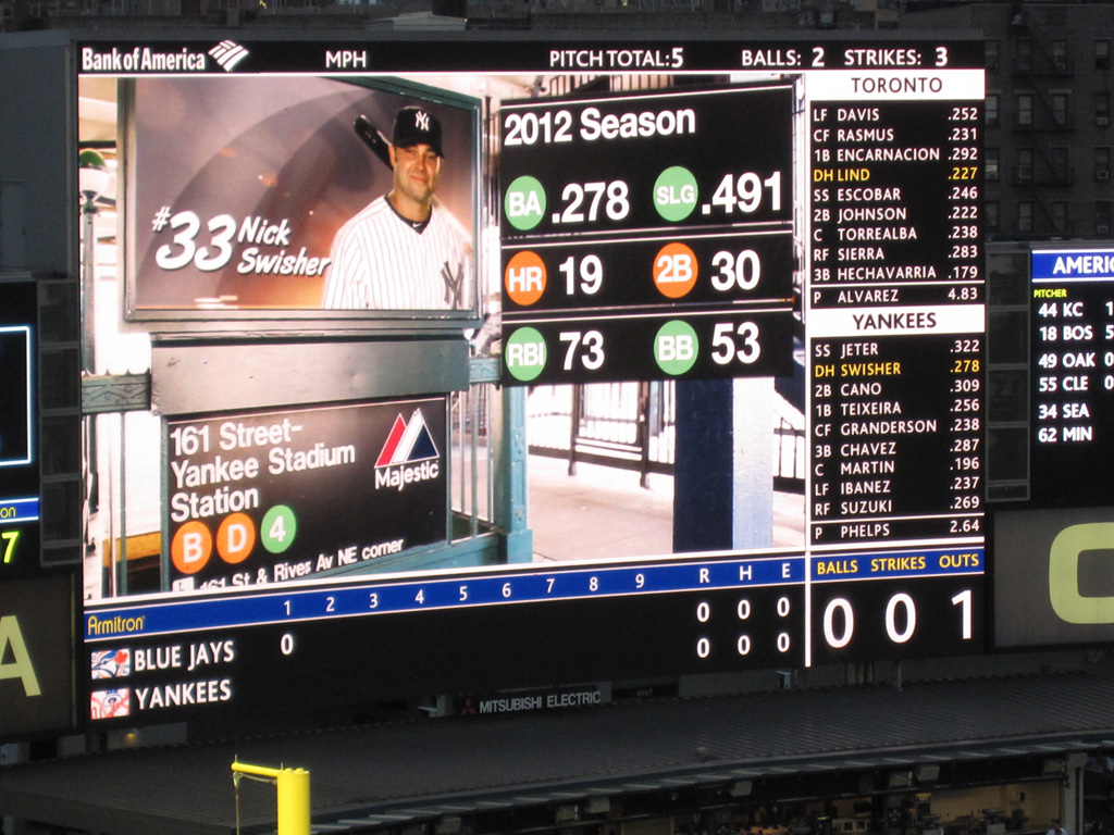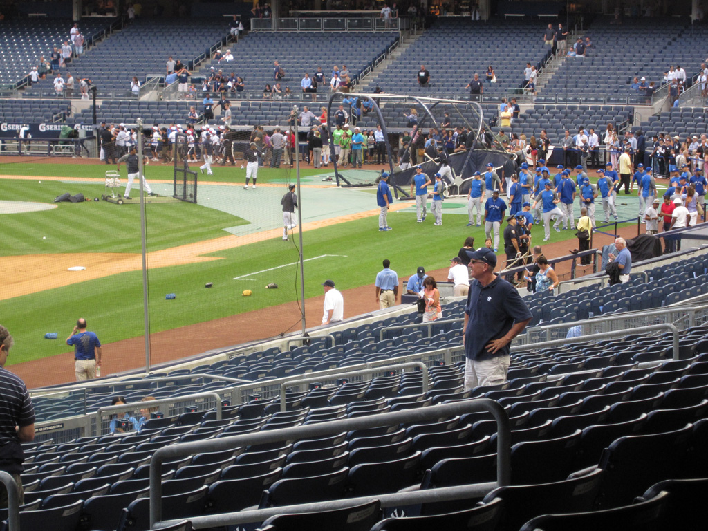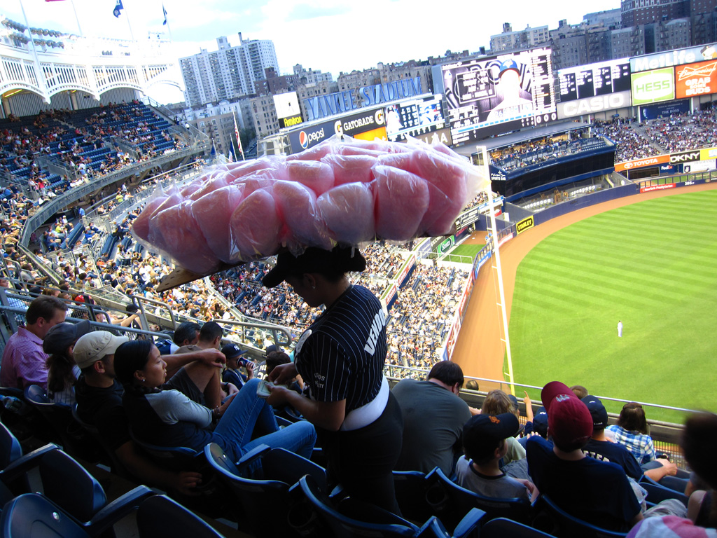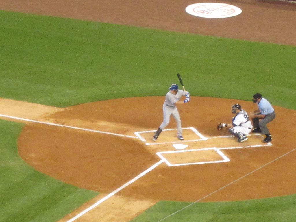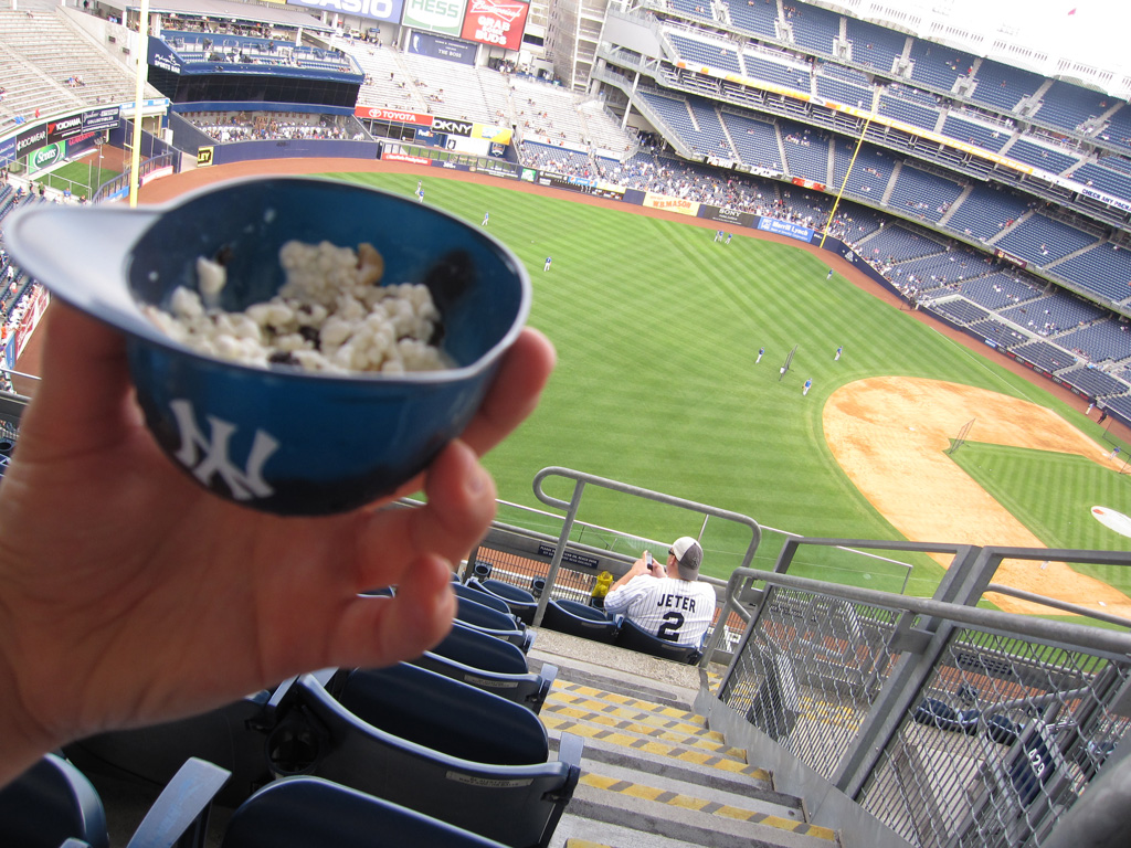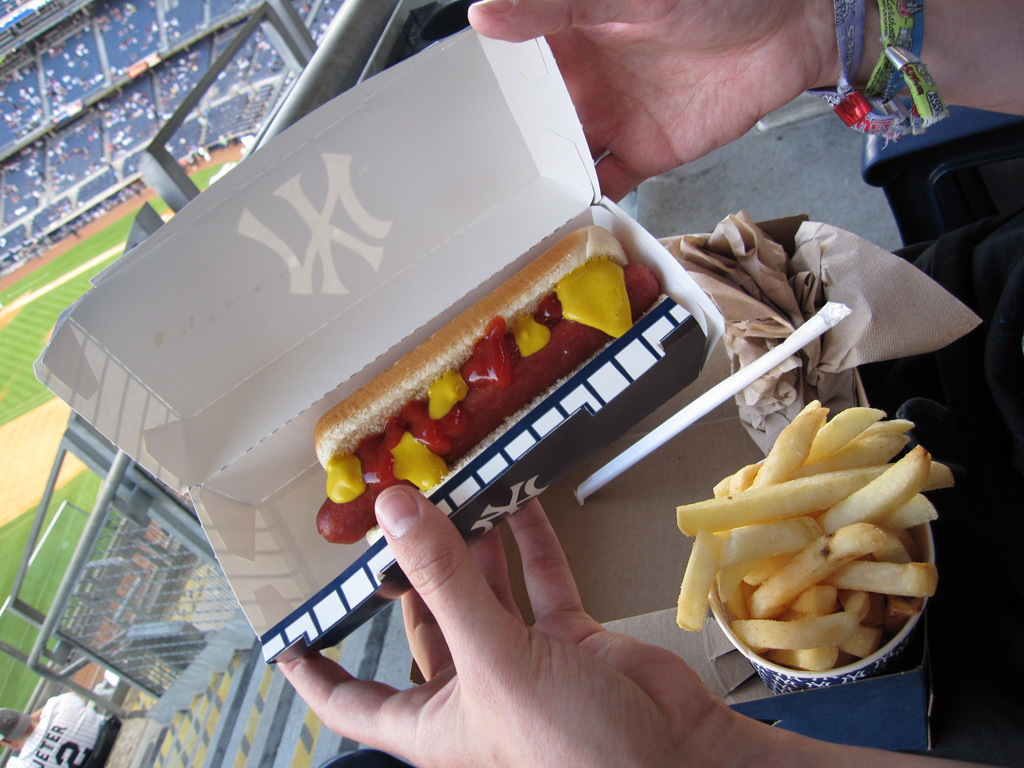 De retour à nos places, après les traditionnels présentations de sponsors suivis des hymnes nationaux – oui les hymnes car ce soir les Yankees jouent contre les Blue Jays qui sont une équipe canadienne (Toronto). Tout le monde est debout et chante l’hymne. Les Jays sont présentés dans une indifférence polie, les Yankees sont présentés comme de véritables dieux du stade dans une ambiance de feu. Les quelques supporters des canadiens ont du sentir bien seuls. Pour la petite histoire, ici les supporters des uns et des autres sont mélangés sans que ça ne pose le moindre problème, en revanche on siffle copieusement les copains d’en face. Chaque fois que les Yankees font un bon coup c’est de la folie, chaque fois qu’une des stars de l’équipe arrive à la batte, il a droit à une petit intro musicale qui lui est propre. Chaque temps mort dans le jeu est l’occasion d’animations dans le stade avec un fond musical carrément rock n’ roll, bref du show à l’américaine. Et comme on est à fond dedans, on se cale le bide avec un hot dog, des frites au fromage et un coca géant !