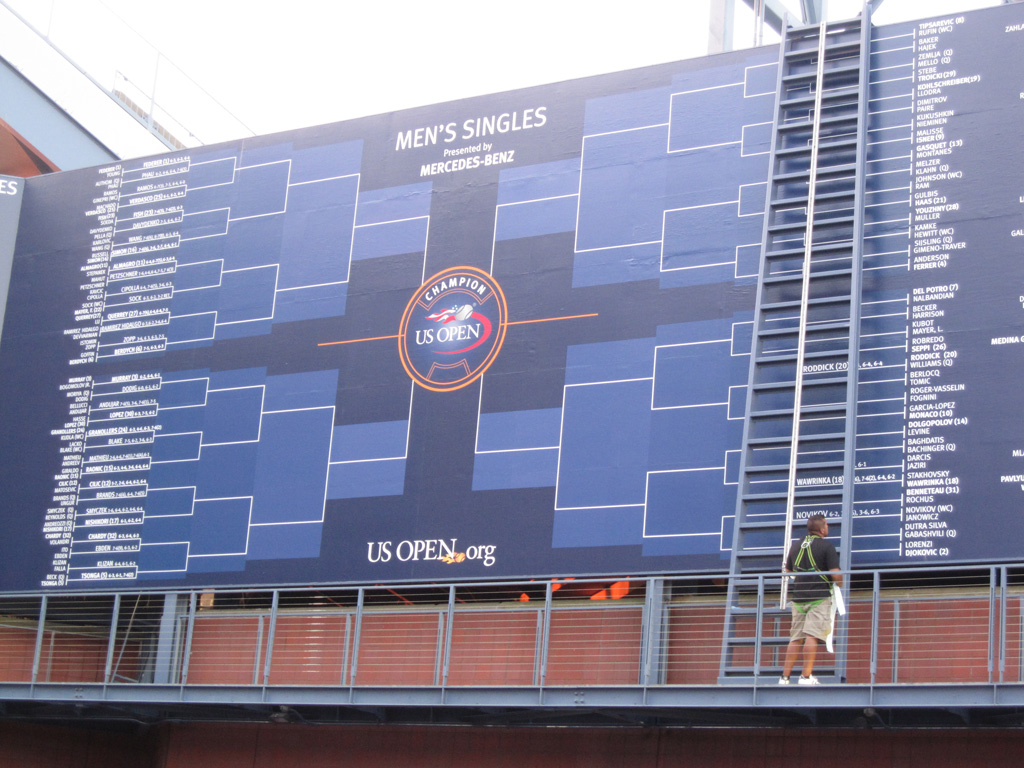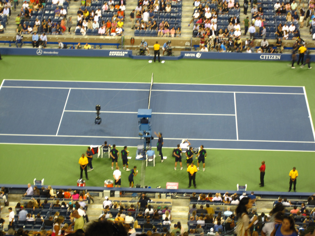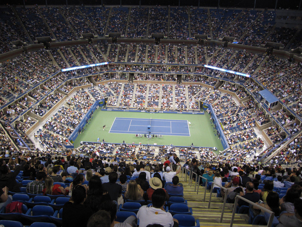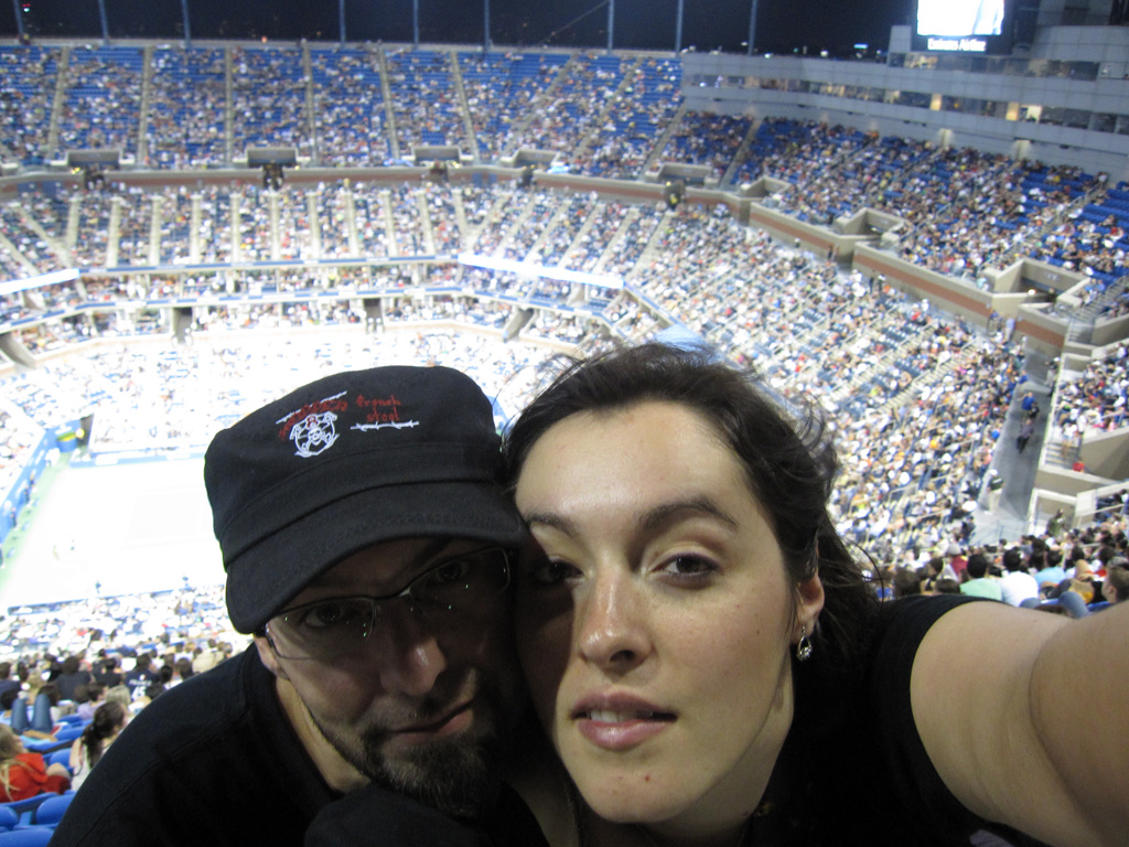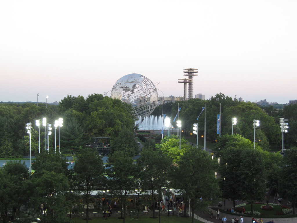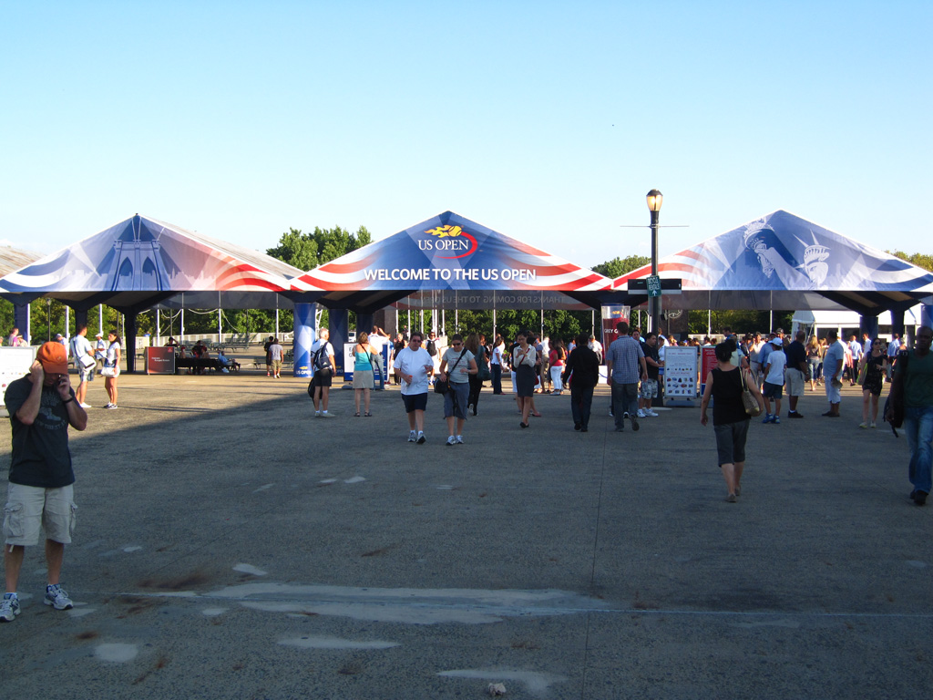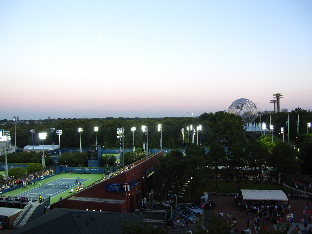 Nous repassons en vitesse à l’hôtel posé nos petites affaires puis nous sautons de nous dans le métro direction le Queens ! Après Manhattan, Brooklyn et le Bronx, nous visitons un quatrième quartier de la ville. Cette fois-ci pas de souci, nous ne manquons pas l’arrêt Mets-Willet Point qui dessert à la fois le Citi Field – stade des New-York Mets (l’autre équipe de baseball de la ville) mais aussi et surtout Flushing Meadows, le Roland Garros local car ce soir nous venons voir du tennis. Après avoir réservé le voyage, j’ai découvert par hasard que l’US Open de tennis débutait pendant que nous étions sur place. Il eut été sot de s’en priver, surtout que les américains sont bien moins cons que nous sur certains points. Par exemple, comme le stade est éclairé, on peut jouer de nuit et donc proposer plus de matchs et aussi vendre des tickets moins chers pour ceux qui ne peuvent/souhaitent pas venir en journée. A partir de 19h débute donc l’Evenig Session pour laquelle nous avons réservé 2 places, modestement sur le court central hein ! Comme hier soir, direction le guichet pour le retrait des billets réservés sur le net. Une fois de plus c’est très rapide (environ 0 minutes d’attente) et le pépé au guichet est adorable, ravi en plus de voir que des français viennent jusqu’ici pour voir du tennis.