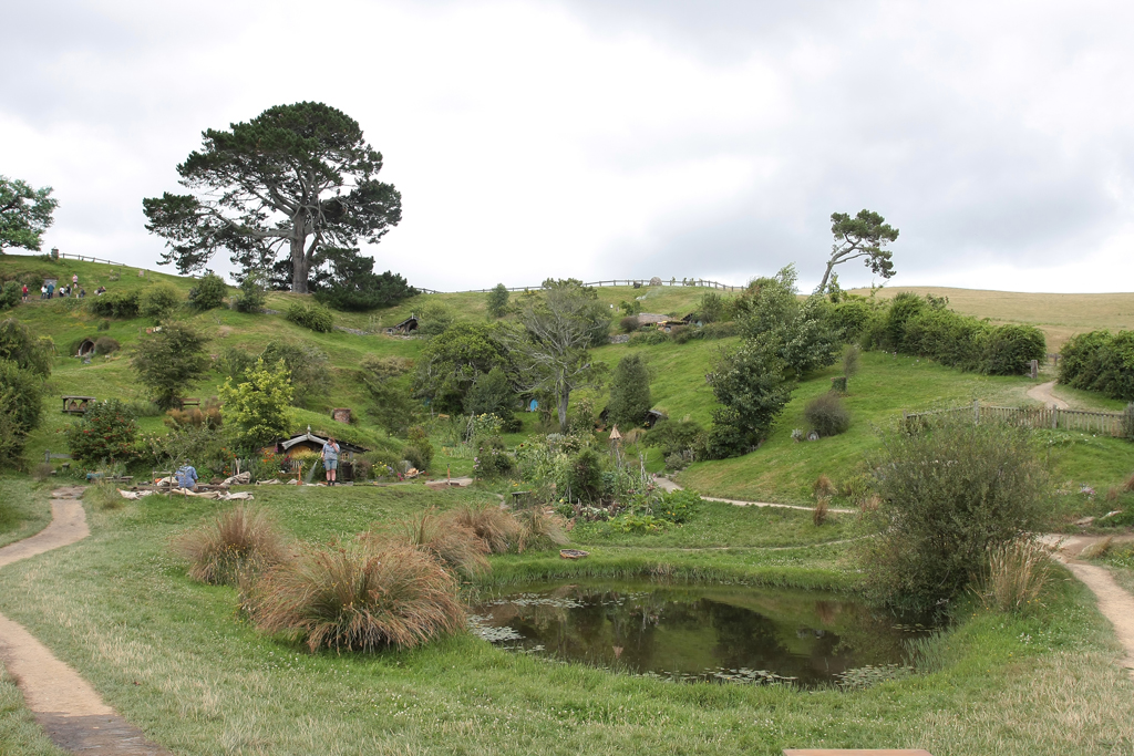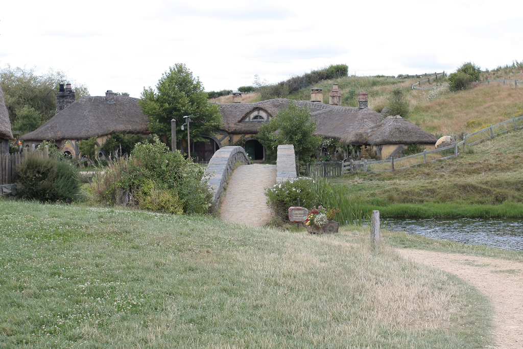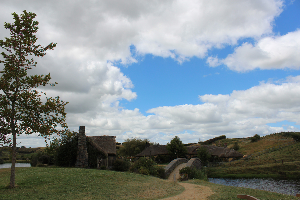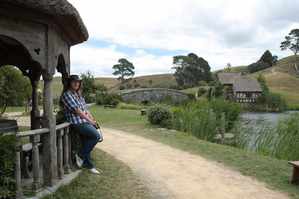 Le traumatisme « chinois » de la veille étant encore bien présent, dans le bus qui mène au Saint Graal, elle se dit prête à faire un carnage si jamais il s’en trouvait un pour lui pourrir une photo. Heureusement que c’est bien organisé. Par groupe de 30/35 personnes, la visite se fait avec un guide qui vous cadre mais vous laisse malgré tout un très grande latitude pour vous déplacer dans le décor. Oui bon OK, trève de mystère: l’endroit dont je parle est la Comté, le village des Hobbits, lieu emblématique du Seigneur des Anneaux et seul décor des films intégralement conservé en l’état et soigneusement entretenu par les fermiers qui ont un jour vu débarquer dans leur champ, au milieu des moutons, 600 personnes pour le tournage.