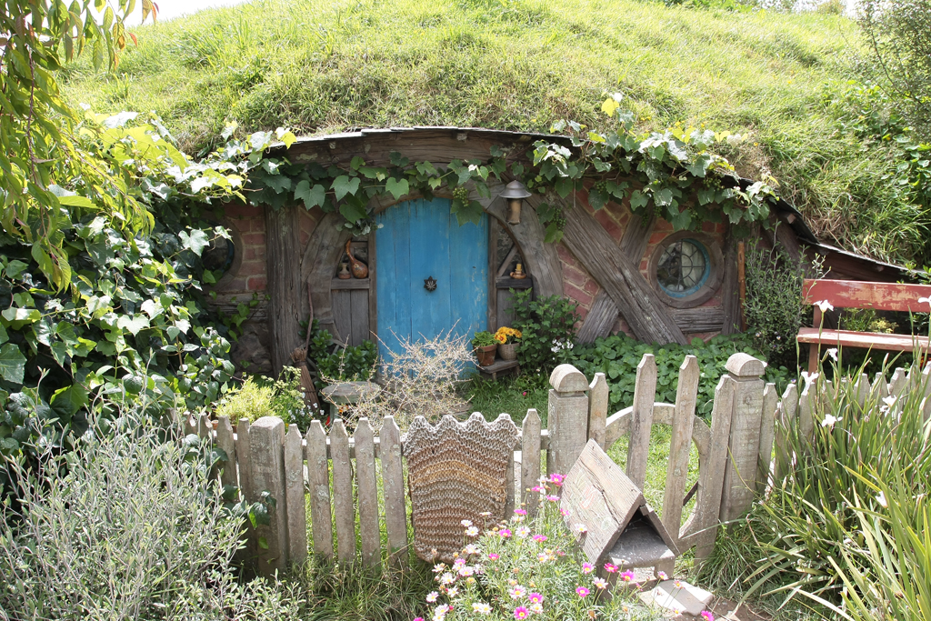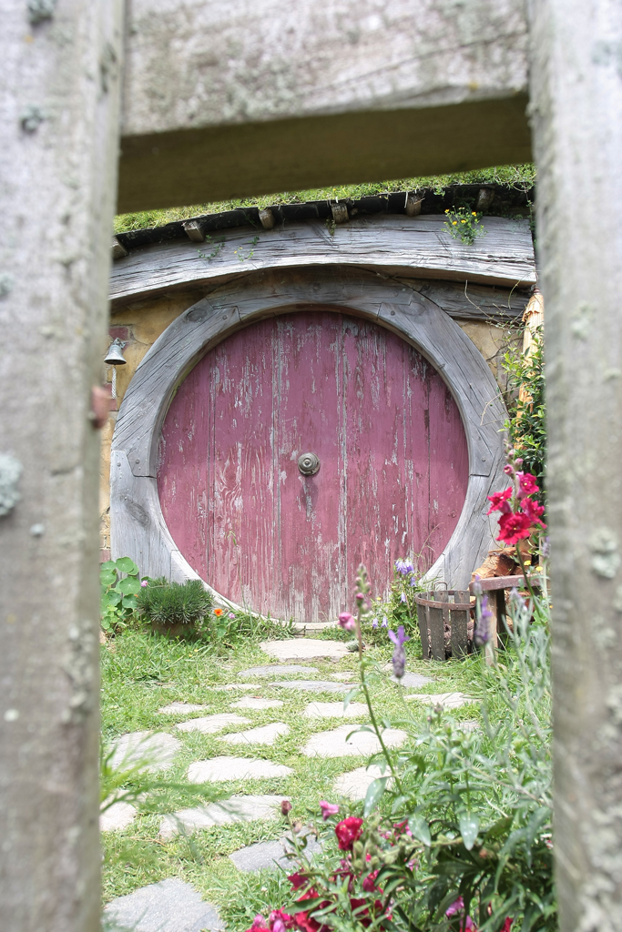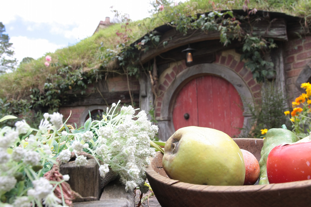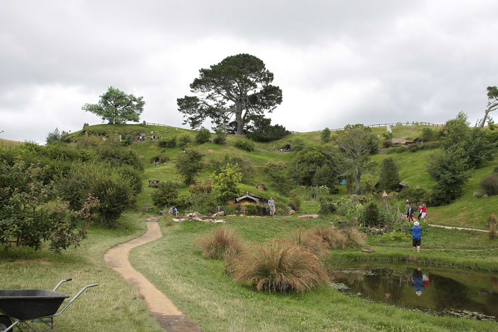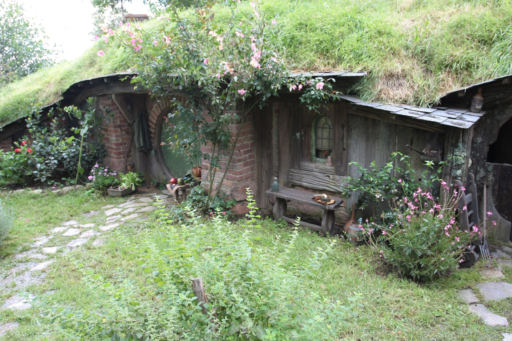 Le traumatisme « chinois » de la veille étant encore bien présent, dans le bus qui mène au Saint Graal, elle se dit prête à faire un carnage si jamais il s’en trouvait un pour lui pourrir une photo. Heureusement que c’est bien organisé. Par groupe de 30/35 personnes, la visite se fait avec un guide qui vous cadre mais vous laisse malgré tout un très grande latitude pour vous déplacer dans le décor. Oui bon OK, trève de mystère: l’endroit dont je parle est la Comté, le village des Hobbits, lieu emblématique du Seigneur des Anneaux et seul décor des films intégralement conservé en l’état et soigneusement entretenu par les fermiers qui ont un jour vu débarquer dans leur champ, au milieu des moutons, 600 personnes pour le tournage.