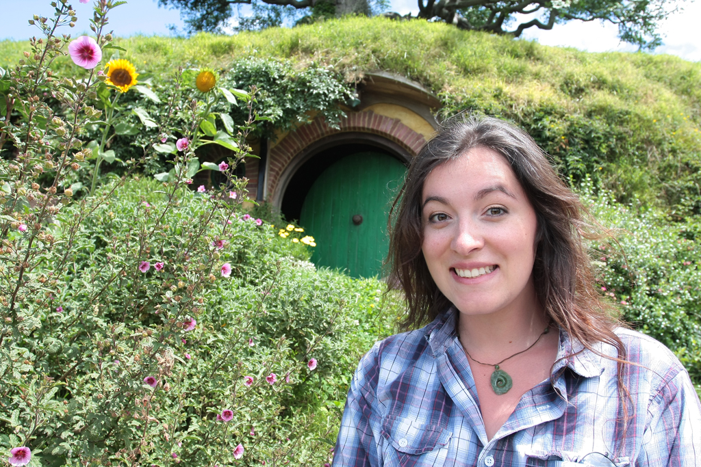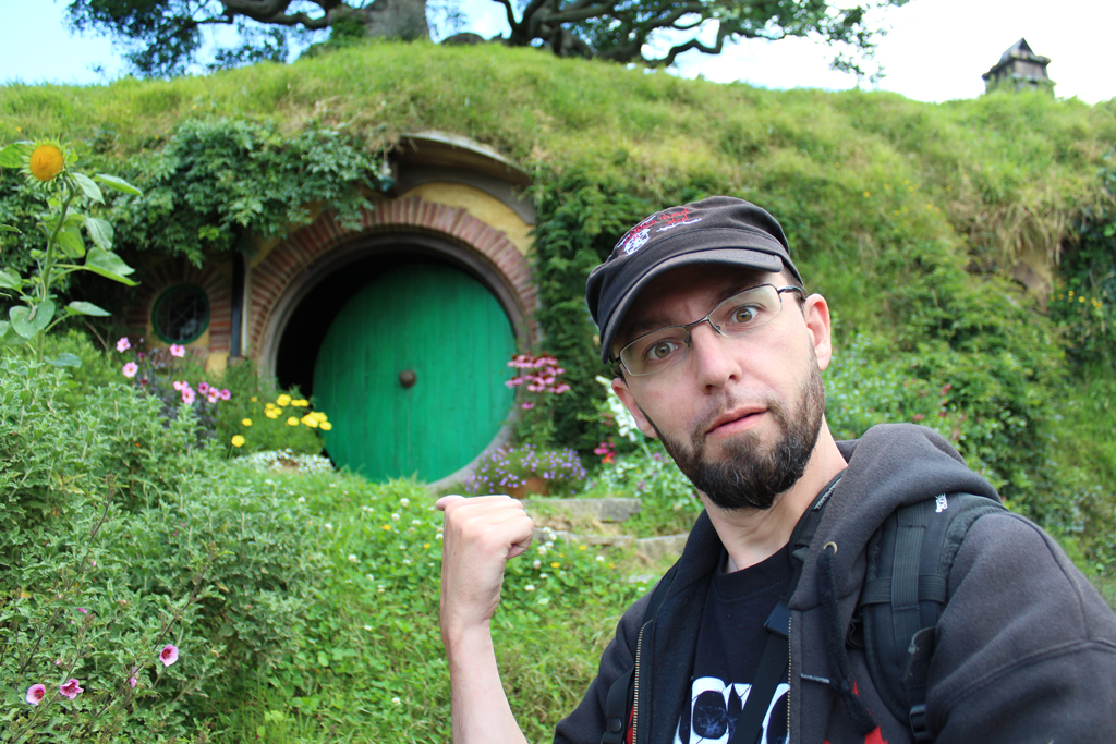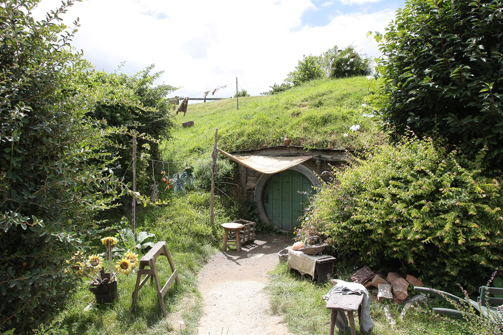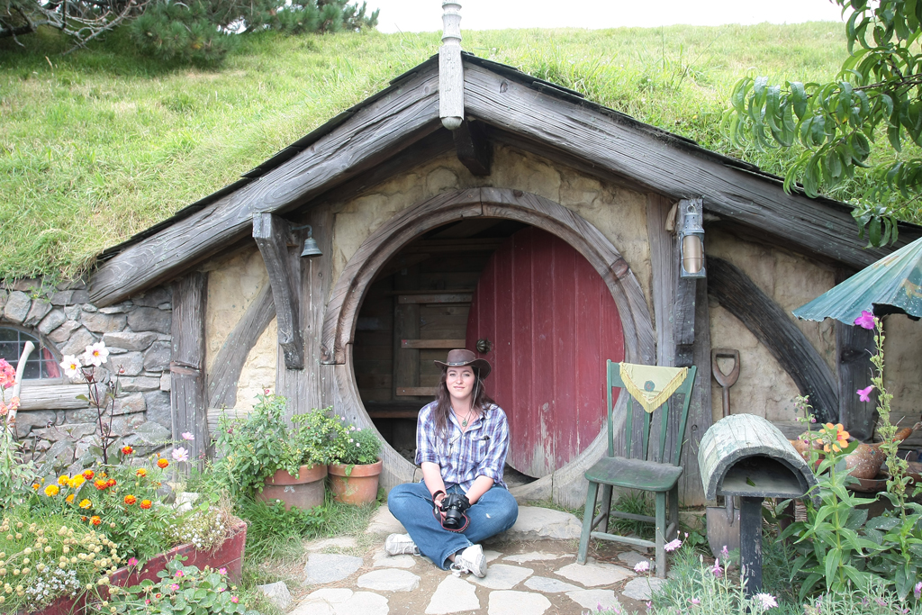 L’endroit est mignon, plus grand qu’on ne se l’imagine mais pas tant que ça. La magie du cinéma et un montage astucieux réussissent à rendre le tout crédible. En tout cas ça fait bizarre de se retrouver devant « cul de sac » et de toutes ses petites maisons creuser à flanc de colline. Ha on me dit dans l’oreillette qu’il n’y a que les portes et que le reste a été tourné en studio à Wellington chez Weta. Blague à part c’est très chouette et en plus le soleil est de la partie. Tout va d’autant mieux que notre groupe est plutôt cool et que Lucille se trouve toujours au bon endroit au bon moment pour ses photos.