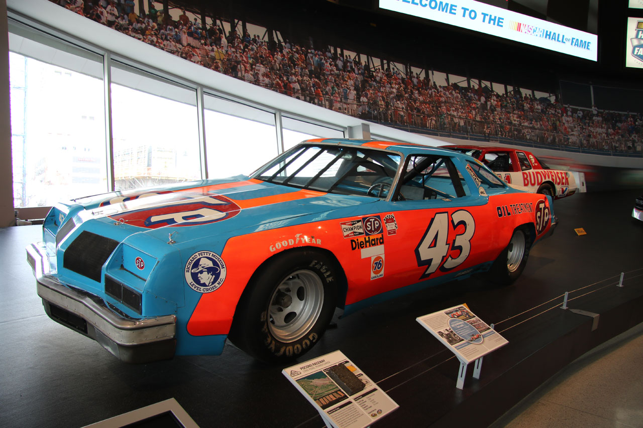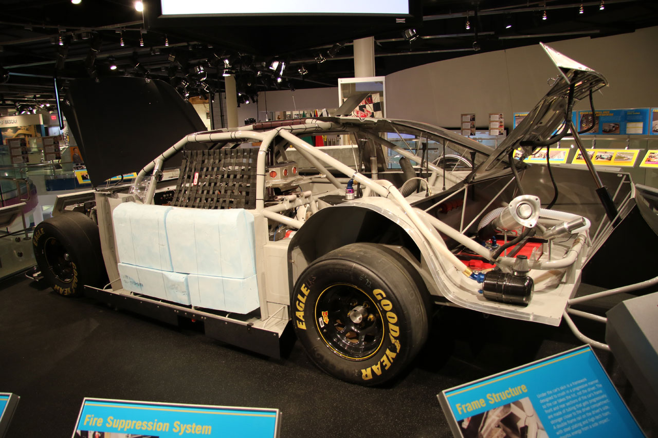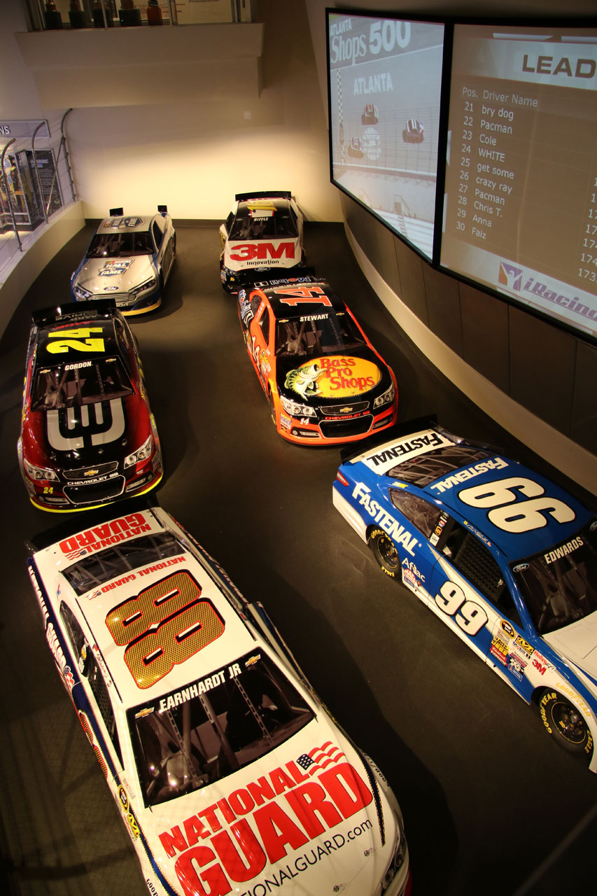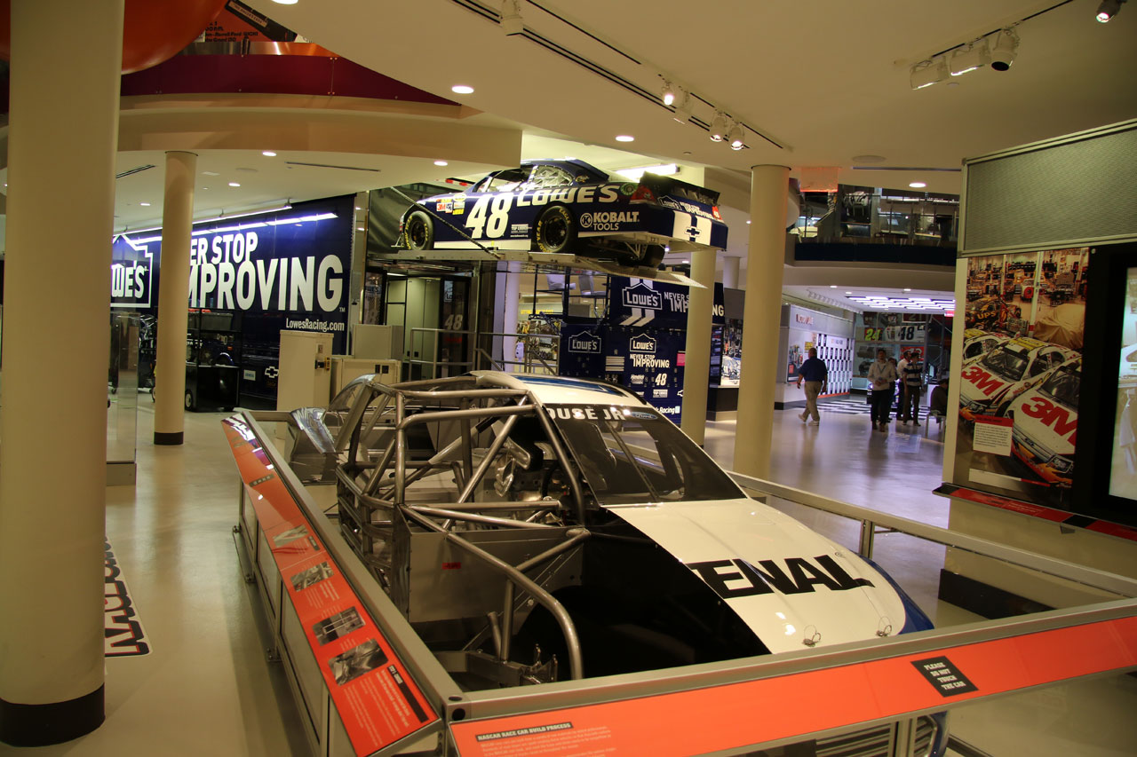 Une fois à Charlotte (en Caroline du Nord), direction le Nascar All Of Fame qui, comme son nom l’indique, est un lieu 100% dédié à la Nascar. Dans un superbe bâtiment flambant neuf, sont réunis des voitures de toutes les époques, on peut ainsi voir l’évolution du matériel depuis les années 50 jusqu’à nos jours. On vous donne une carte qui permet d’interagir avec des bonnes tactiles – on se créé un profile, on choisit son pilote et au fur à mesure de la visite sur chaque borne on teste ses connaissances via des QCM sur l’histoire de la Nascar ou sur des points techniques et on marque des points. Le tout est très interactif et amusant. C’est suffisamment bien fait pour qu’un novice en mécanique apprenne à régler la pression des pneus sur une voiture de course. Une fois toutes les étapes de la mise au point validées, vient l’épreuve du test des réglages que l’on a effectué depuis le début de la visite sur un simulateur. Et c’est là qu’on se rend compte que conduire une bagnole comme ça sur un ovale c’est tout sauf simple. A la fin de visite, on passe sa carte sur la dernière borne et on compare ses résultats avec ceux des autres visiteurs du mois. J’ai fait 4ème en ayant oublié l’épreuve de changement de pneus – où l’on change une roue pour de vrai.