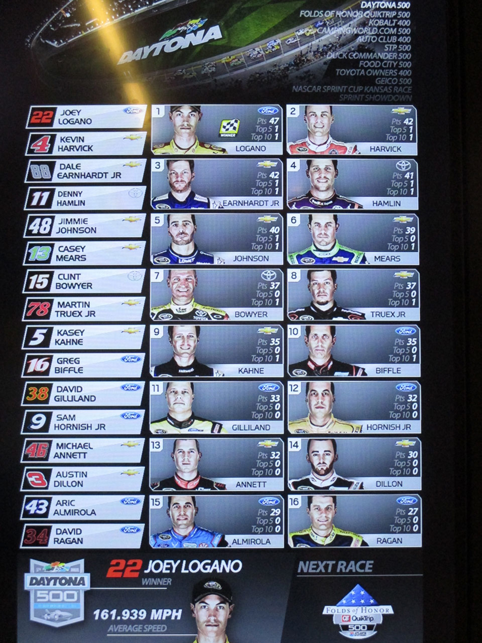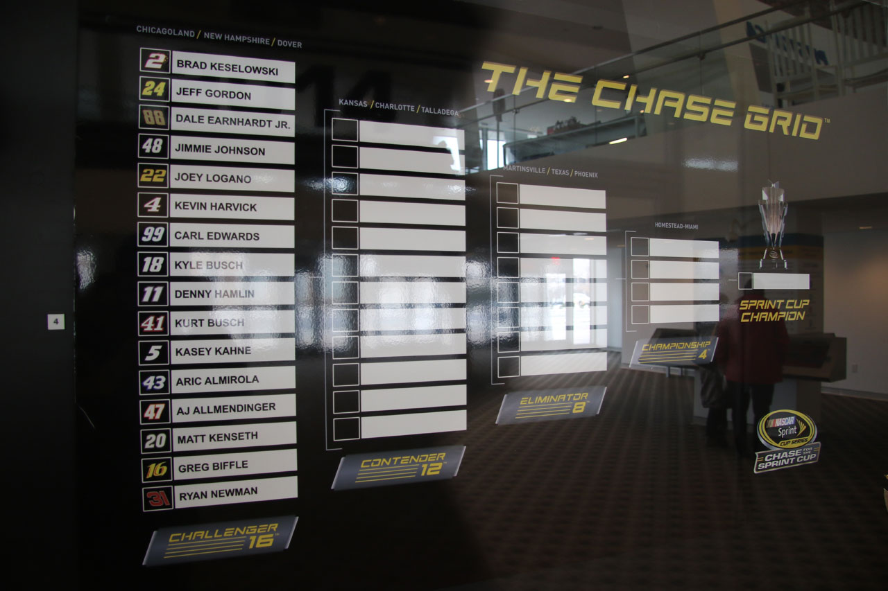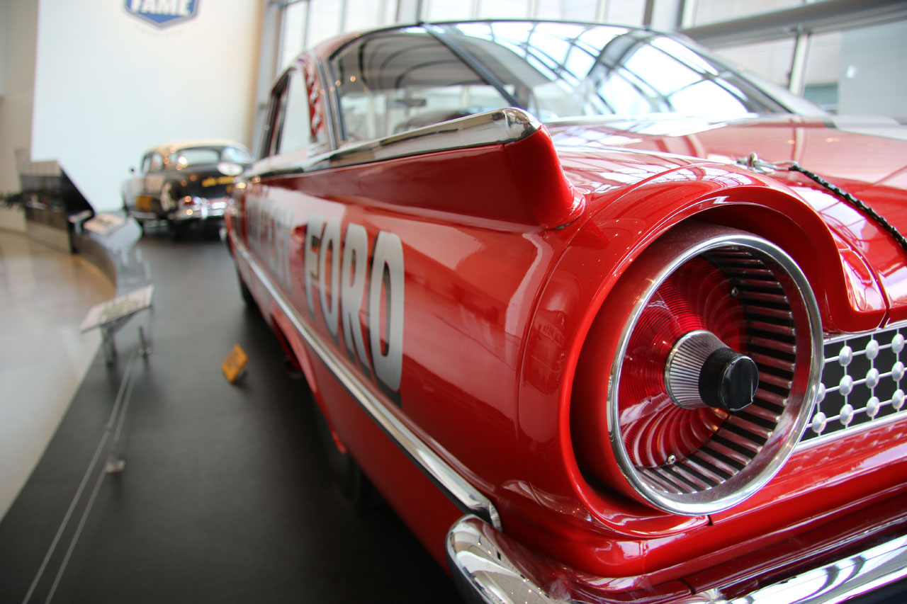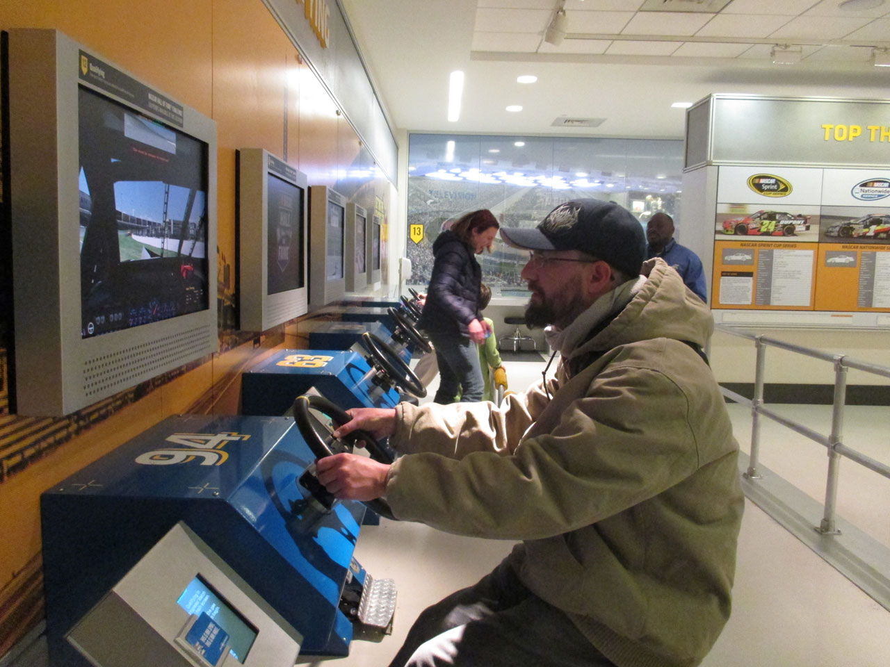 Une fois à Charlotte (en Caroline du Nord), direction le Nascar All Of Fame qui, comme son nom l’indique, est un lieu 100% dédié à la Nascar. Dans un superbe bâtiment flambant neuf, sont réunis des voitures de toutes les époques, on peut ainsi voir l’évolution du matériel depuis les années 50 jusqu’à nos jours. On vous donne une carte qui permet d’interagir avec des bonnes tactiles – on se créé un profile, on choisit son pilote et au fur à mesure de la visite sur chaque borne on teste ses connaissances via des QCM sur l’histoire de la Nascar ou sur des points techniques et on marque des points. Le tout est très interactif et amusant. C’est suffisamment bien fait pour qu’un novice en mécanique apprenne à régler la pression des pneus sur une voiture de course. Une fois toutes les étapes de la mise au point validées, vient l’épreuve du test des réglages que l’on a effectué depuis le début de la visite sur un simulateur. Et c’est là qu’on se rend compte que conduire une bagnole comme ça sur un ovale c’est tout sauf simple. A la fin de visite, on passe sa carte sur la dernière borne et on compare ses résultats avec ceux des autres visiteurs du mois. J’ai fait 4ème en ayant oublié l’épreuve de changement de pneus – où l’on change une roue pour de vrai.