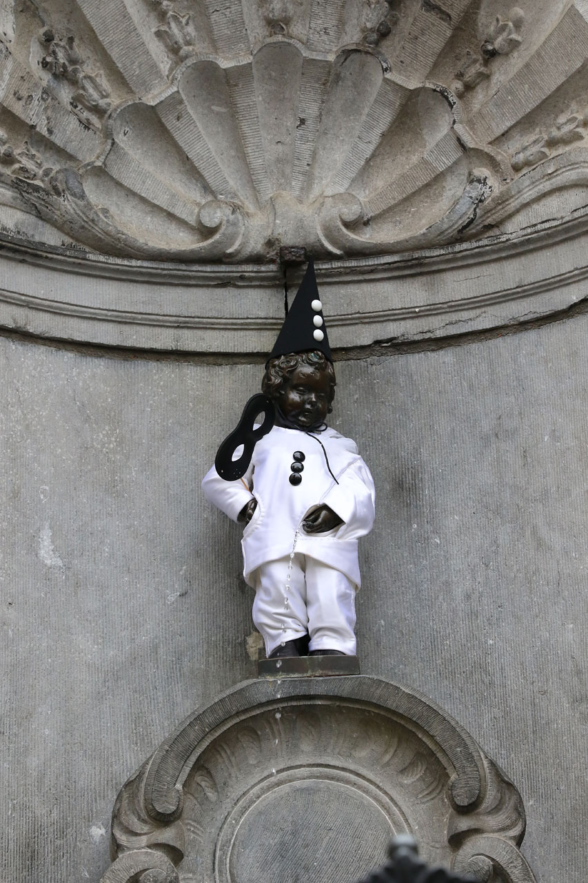 Nous nous présentons devant l’entrée un peu avant l’ouverture et patientons. Une fois 10 heures sonnées au clocher du coin, nous sonnons pour entrer. Pas de réponse. Une fois, deux fois, trois fois, il est 10h10, ce n’est toujours pas ouvert, décisions est prise de revenir plus tard et d’aller voir ailleurs. Chemin faisant nous repassons devant le Manneken Pis, qui pisse toujours (ouf), mais qui aujourd’hui est déguisé en Pierrot *ahem*