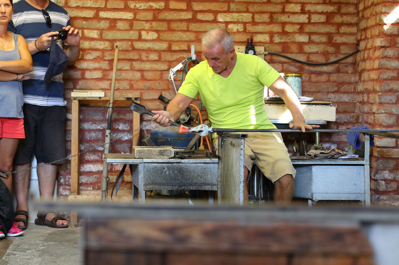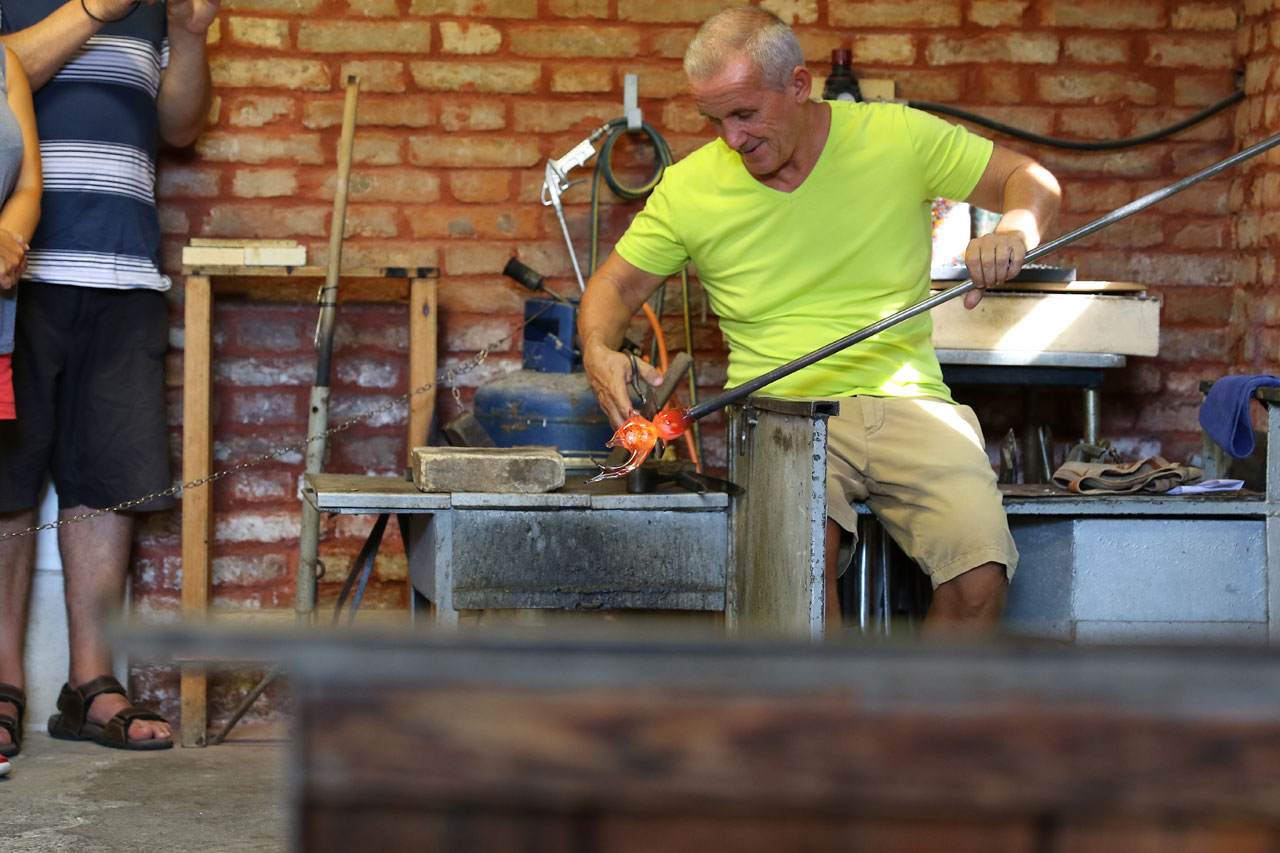 Nous n’avons pas fait 3 pas sur le quai qu’un gang de mafieux en costard nous tombe sur le râble et nous entraîne dans une des verreries pour une démonstration de soufflage de verre. Bon gré, mal gré, tous les passagers du bateau rentrent dans la minuscule pièce où un maître souffleur va faire devant nos yeux ébahis un vase puis un poisson, tout ça avec les explications de Luigi qui décrit les différentes techniques utilisées. Vu le temps mis pour faire le vase et le poisson, quand on est bon, c’est rentable et ça rapporte gros. La preuve en est, une fois la démonstration terminée, nous sommes entraînés dans l’inévitable boutique dans laquelle nous retrouvons nos gangsters endimanchés. Les tarifs pratiqués sont relativement sodomites et tout est fait pour qu’on ne retrouve pas la sortie. Et pourtant ce n’est pas grand. Visiblement nos gangsters n’ont pas aimé que l’on prenne la poudre d’escampette aussi vite, et surtout que les autres nous suivent car nous étions parmi les premiers à détaler. C’est que les arrêts sur chaque île sont minutés, donc une minute de perdue dans la boutique, cest une minute de visite en moins. Cela dit, les centres d’intérêts sur Murano sont assez limités donc bon…