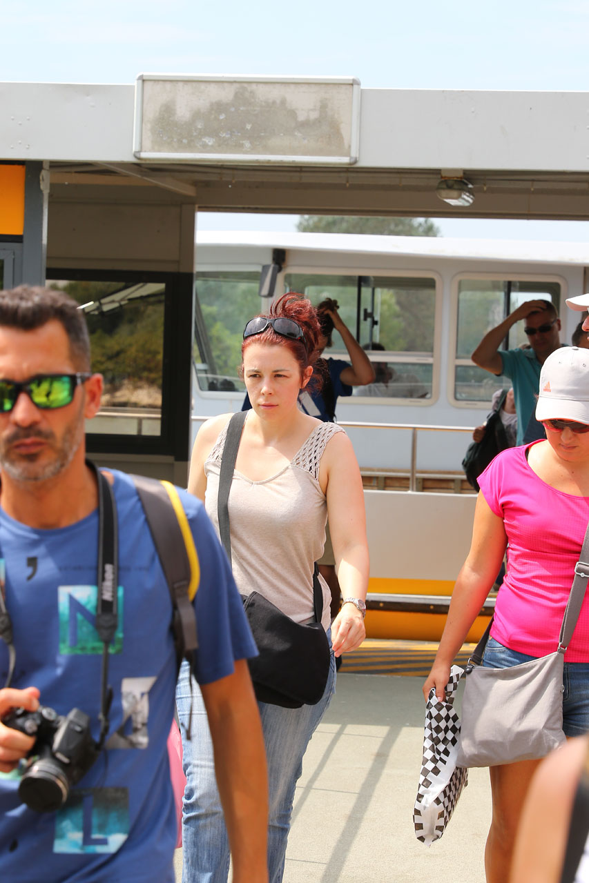Chemin faisant, nous ferons un stop dans une petite boulangerie pour acheter des sablés maison. Bien qu’excellent et nous aidant à combler la dent laissée creuse par le petit déjeuner, ils seraient bien mieux passés avec un bon chocolat ou un thé. Nous grignotons donc nos gâteaux en direction du bateau, arrivons sur le quai pour embarquer, prenons nos places et attendons le départ. Là nous voyons arriver à un train de sénateurs, une famille d’espagnols, gentils comme tout au demeurant, qui prend bien son temps pour nous rejoindre. Une fois à bord, la guide recompte. Merda! Il en manque toujours. Bon bah tant pis l’heure c’est l’heure et le bateau part. Et là, comme dans un film, nous avoyons arrivés en courant une petite américaine qui suivra le bateau le long du quai en faisant de grands signes… sous les yeux pleins d’empathie de tous les passagers. Tous? Non. Il y en avait 2 pliés de rire qui disaient « avant l’heure c’est pas l’heure, après l’heure c’est plus l’heure » sous les regards désapprobateurs de certains.