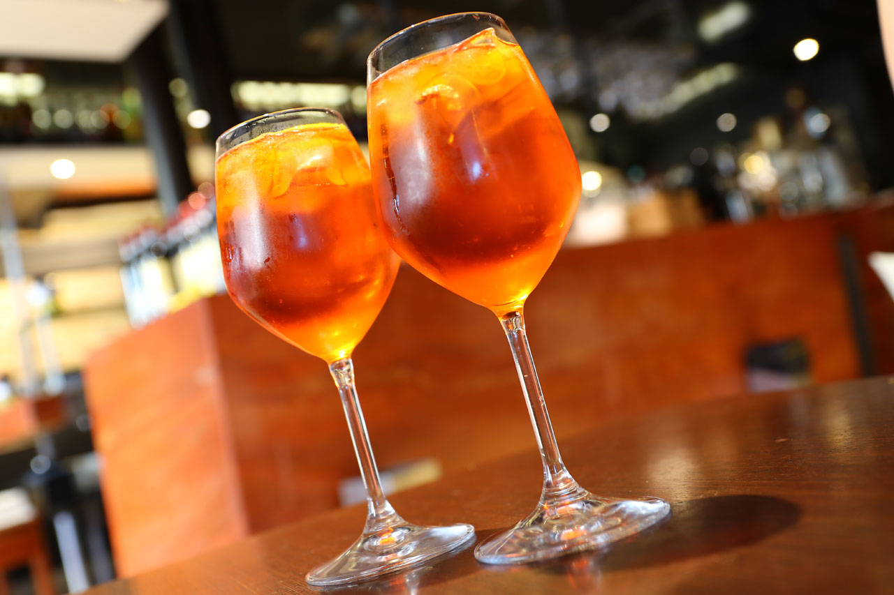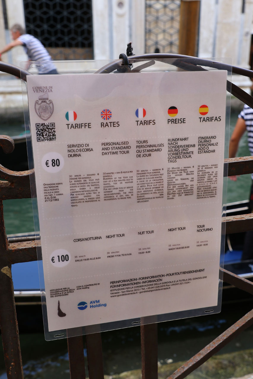 En lisant le guide que j’ai emporté, Aurélie a découvert un petit troquet potentiellement sympa. Nous décidons donc d’aller nous poser là-bas. Sur le chemin, je trouve « enfin » un service de gondole qui affiche ses tarifs parce que j’étais curieux de voir combien ils osaient facturer ça. Tenez-vous bien, 80€ la demi-heure, 100€ après 20h. Nous laisserons donc les gondoles à Denise Venise sans aucun scrupule. Une fois le bar trouvé, ce qui ne fut pas une sinécure, nous nous posons. Le serveur était à peu près tout sauf un foudre de guerre mais cela n’a pas empêché le Spritz (l’apéro local) de faire son boulot: nous couper les pattes. En regardant faire le barman j’ai compris l’ampleur du problème: la dose de Campari mise dans chaque verre. A ça ils ne sont pas radins car les verres étaient bien pleins mais bobo la tête. Finalement nous resterons là pour dîner (pizza évidemment). Aurélie se reprendra un petit verre de rouge local pour faire glisser tout ça – très agréable en plus, bien aéré, léger mais un peu traître après le Spritz.