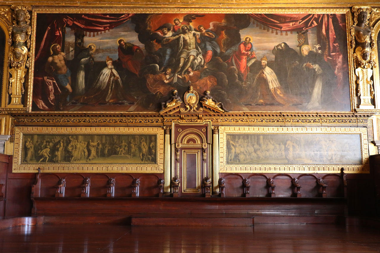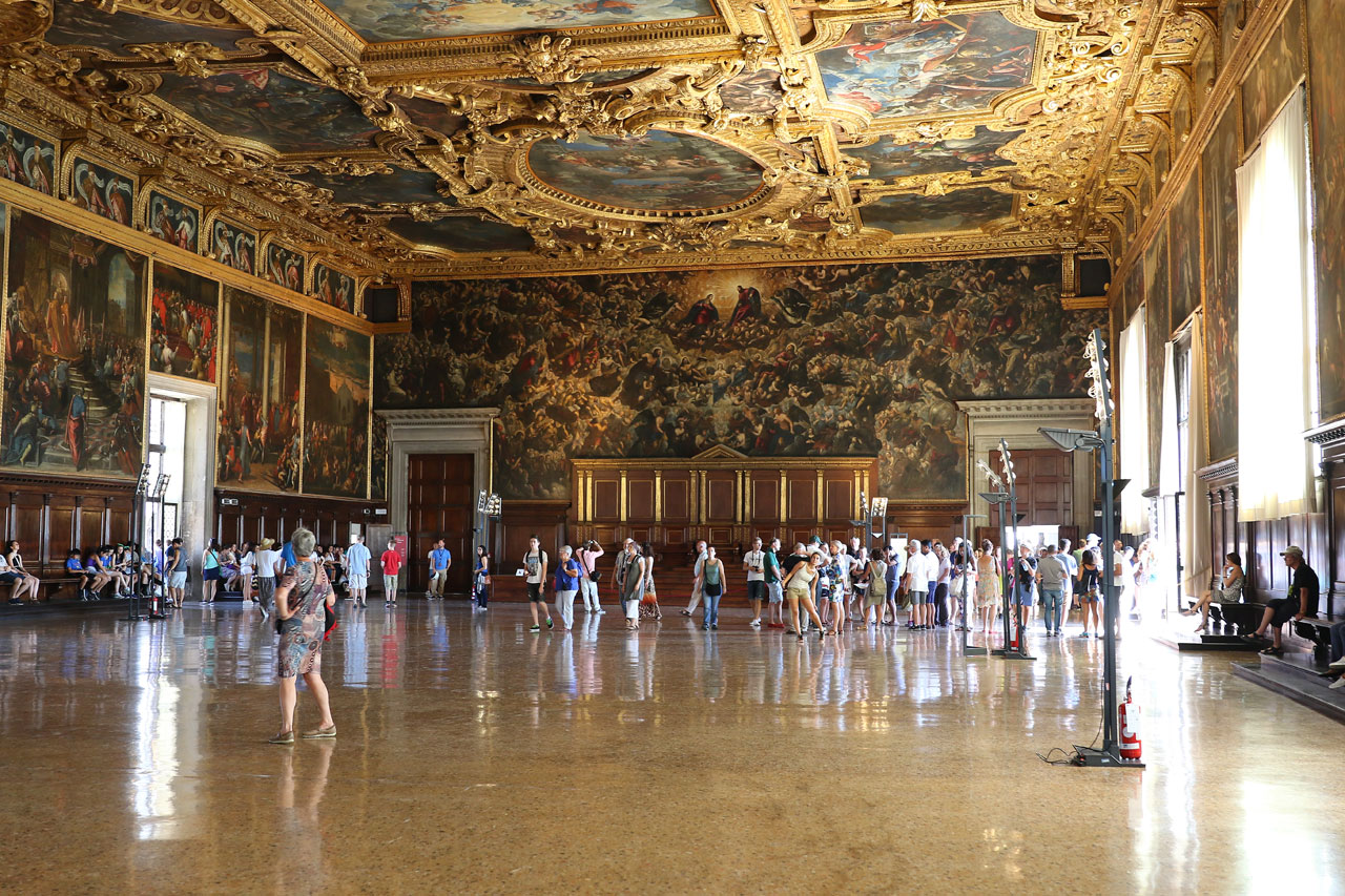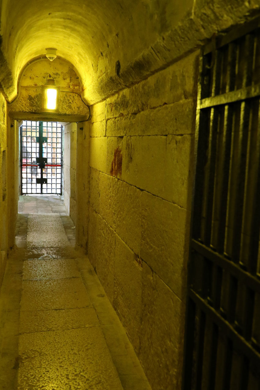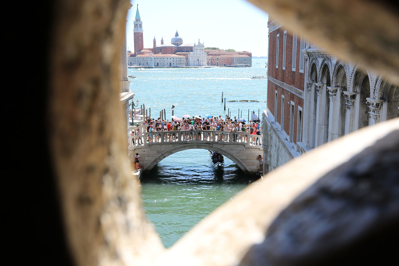 Le reste de la visite est plus classique, un poil plus convenu et aussi bien plus peuplé. Cet enchaînement de salles immenses pleines de dorures et de peintures est certes impressionnant mais aussi un poil redondant. Entre la salle du conseil machin, la salle du conseil bidule, la salle du grand conseil, la salle du conseil restreint, et j’en passe, les mecs se concertaient beaucoup ça on l’a compris. Ceci étant dit, la visite guidée a eu ce mérite d’expliciter beaucoup de choses pour la partie libre qui suit. Notamment sur les interactions entre les différentes strates hiérarchiques de l’endroit. Direction ensuite les prisons du palais, la partie dite « nouvelle », car installer dans une extension du palais, avec un passage par le célèbre « pont des soupirs », soupirs qui n’ont rien de romantique puisqu’on parle du dernier soupir des condamnés. Là-dessus nous sortirons du palais après 3 bonnes heures de visite. S’en suit un repli stratégique à l’hôtel pour un changement de batterie d’appareil photo. Et là, c’est le drame.