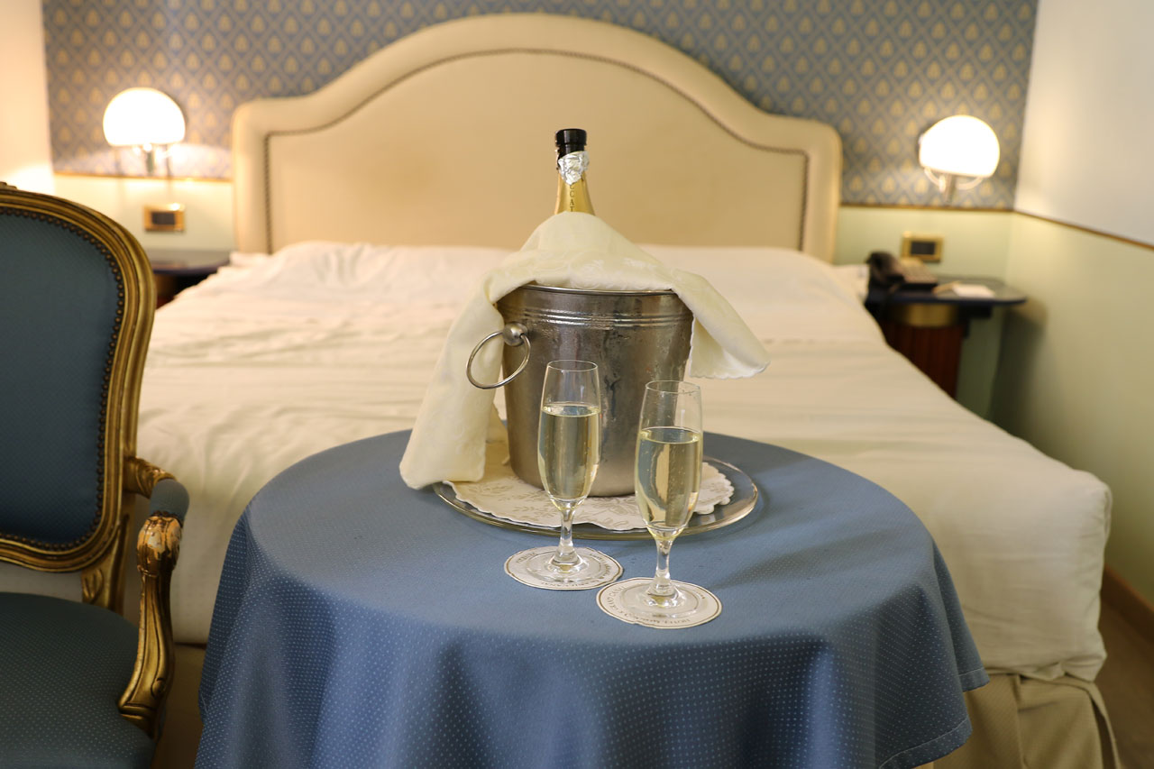 Le temps de se poser 2 minutes pour relaxer les pieds, choisir l’endroit où aller déjeuner quand soudain, quelqu’un frappe à la porte. Aurélie va ouvrir, un type de l’hôtel se présente avec une plateau sur lequel trône 2 verres et une bouteille de Prosecco. Surprise Aurélie, lui dit qu’il doit y avoir une erreur car nous n’avons rien commandé, là-dessus il lui montre une petite enveloppe sur laquelle il y a effectivement son nom. Du coup il rentre dans la chambre, pose le plateau sur la table et disparaît. On se regarde méduser et elle me demande « c’est toi qui commandé ça »? Pour le coup non. Après 5 minutes de réflexion, nous en arrivons à la conclusion que l’hôtel a repéré sur sa carte d’identité que c’était aujourd’hui son anniversaire et qu’ils offrent une bouteille aux frais de la princesse pour l’occasion. Pas la peine de dire que le sort de la bouteille a été réglé, doucement mais surement car en regardant bien, le Prosecco ça fait quand même 11,5°. Sachant qu’il n’était pas loin de 14h et que notre petit dej’ était pour le moins sommaire, la situation aurait pu devenir critique mais nous avons gérer de main de maître notre alcoolémie en nous dirigeant vers notre petit troquet d’hier soir pour un repas salvateur accompagné d’eau minérale cela va sans dire. Pâtes à la sèche d’un côté, escalope pizzaiola de l’autre et papilles gustatives en extase.