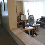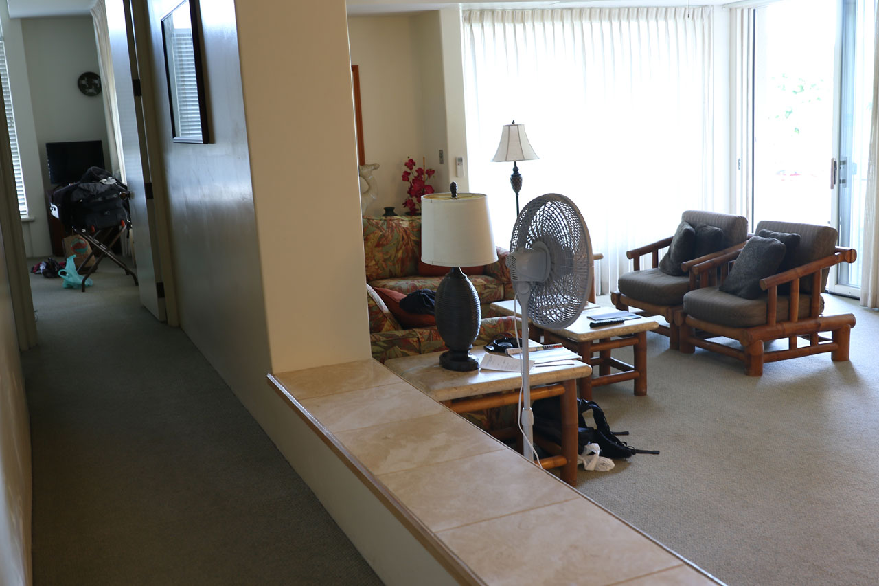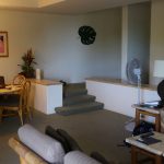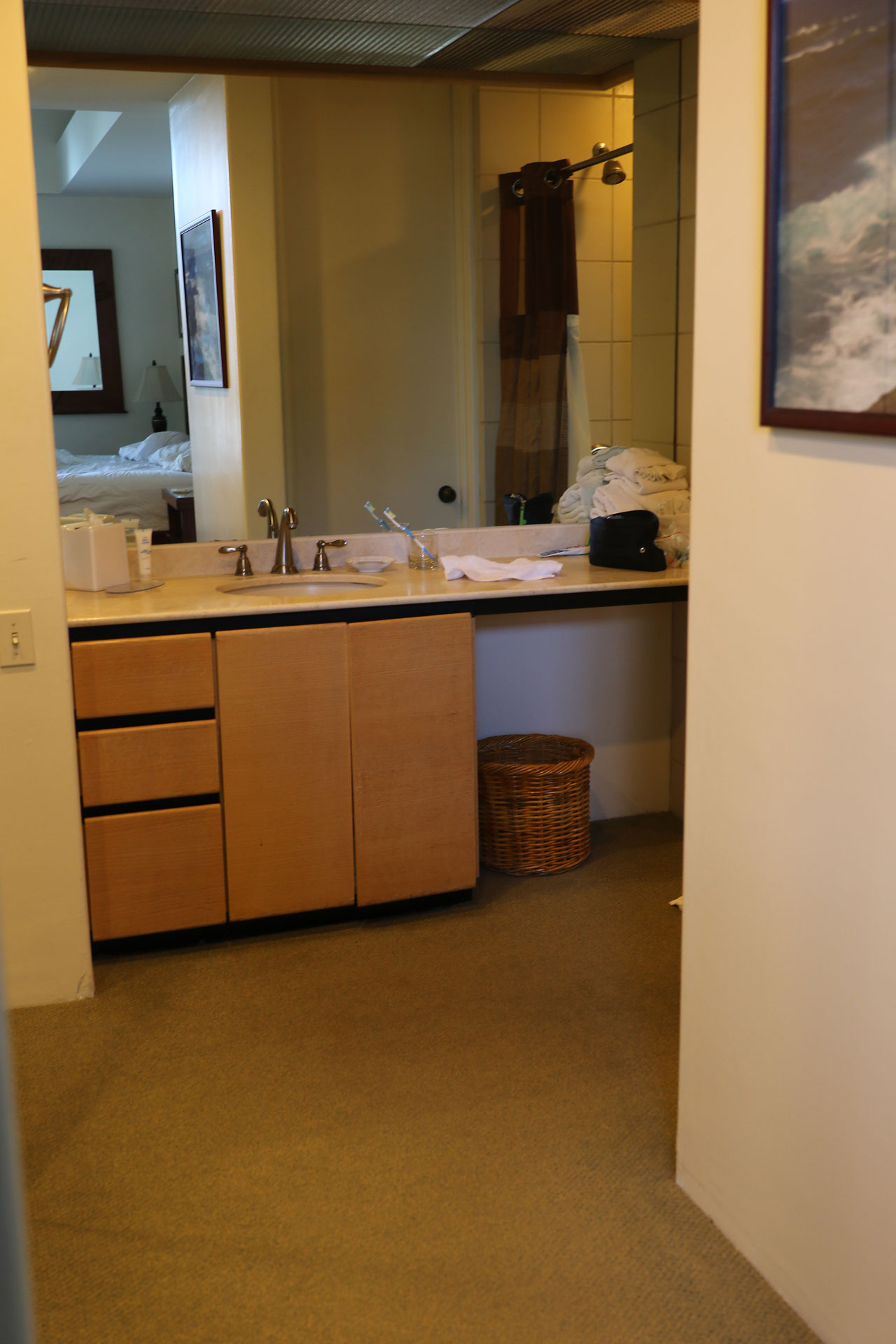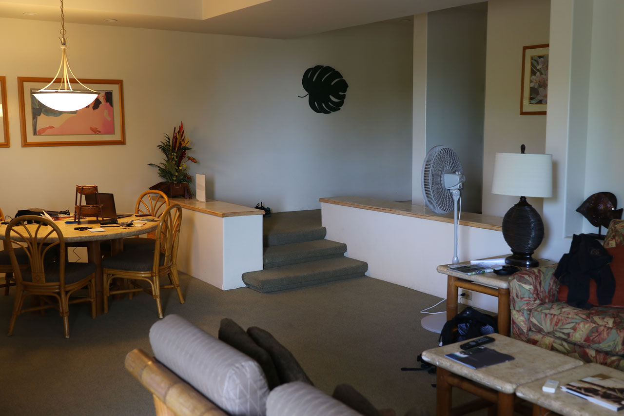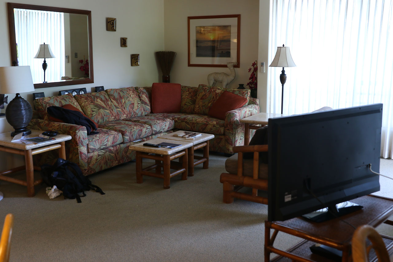 Et donc nous voici en route vers la résidence via la route côtière Sud. Au début tout va bien, on reste sur les mêmes bases que sur la route menant à Hana: route étroite avec peu de visibilité et moult virages. Au bout de 10 miles, là ça se complique car le bitume s’arrête et on passe sur du gravier tout en gardant les mêmes conditions de route. Heureusement il fait grand soleil… enfin heureusement… étant donné que ça monte et que ça descend et que nous allons plein Est, nous avons aussi le soleil dans la truffe en permanence. Ce qui n’aide pas trop pour voir où l’on va. D’autant que par endroit on longe l’océan entre 2 falaises à pic, on voit les embruns venir s’écraser sur le pare-brise ainsi qu’un rail de sécurité en fin de vie tellement il est attaqué par le sel et la rouille. Ensuite la route repart dans les terres en prenant de la hauteur et on passe en mode montagne russe. Si d’aventure, l’état de la route et la météo n’étaient pas suffisant, on peut aussi ajouter le paramètre vache! Ces dernières sont en libertés le long de certaines portions de la route et nous les avons vu brouter sur le bas côté, donc il fallait en plus faire gaffe aux vaches. Ainsi qu’aux locaux qui encore une fois roulaient comme des maboules là-dessus.