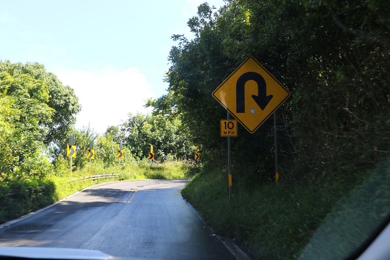 De notre résidence jusqu’à Kahuilui (la grande ville de l’île), c’est de la 4 voies tranquille, une fois sur la route 36 pour Hana, là commence les choses sérieuses. Jusqu’à Ho’okipa Beach Park ça va encore, c’est après que ça se complique.
