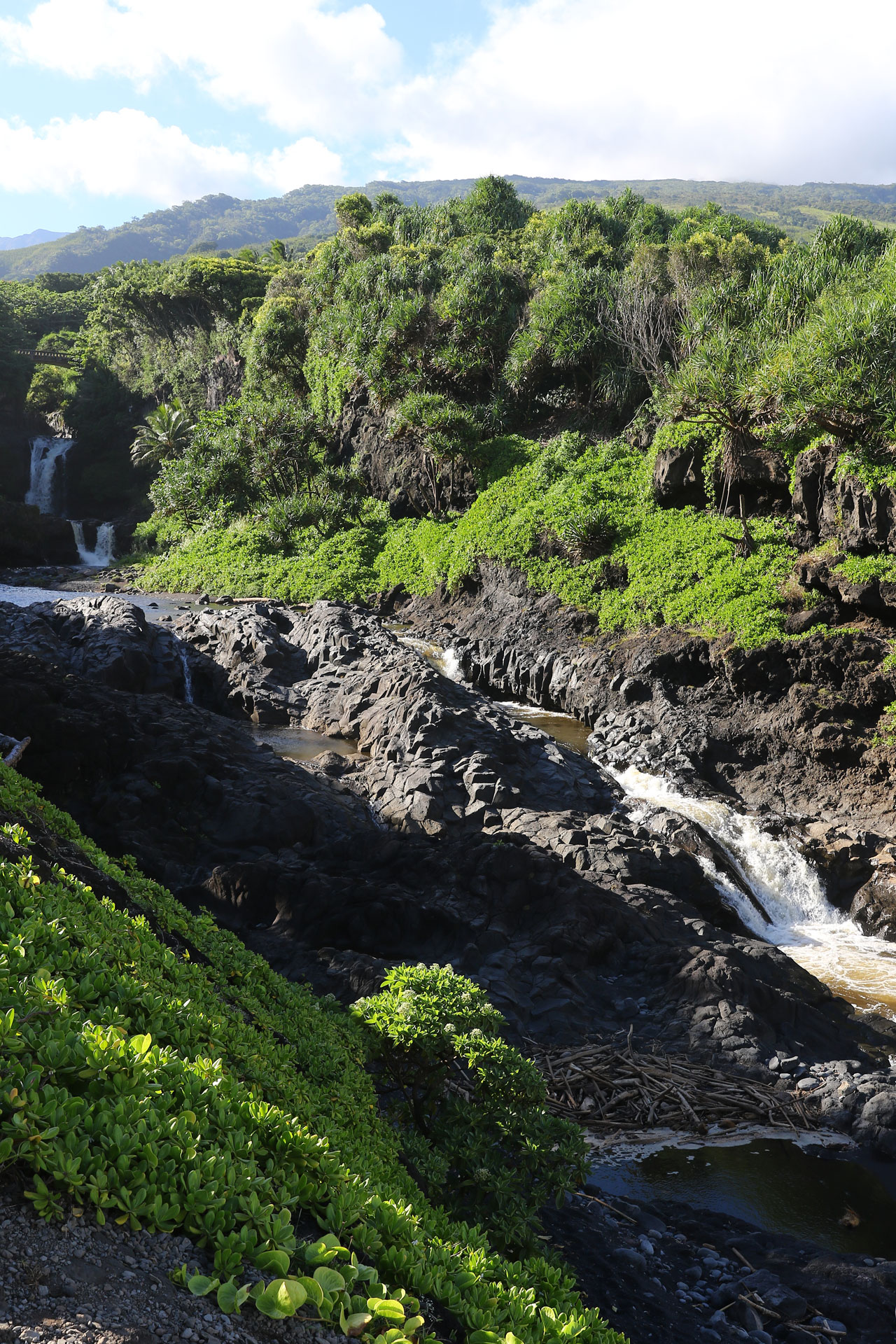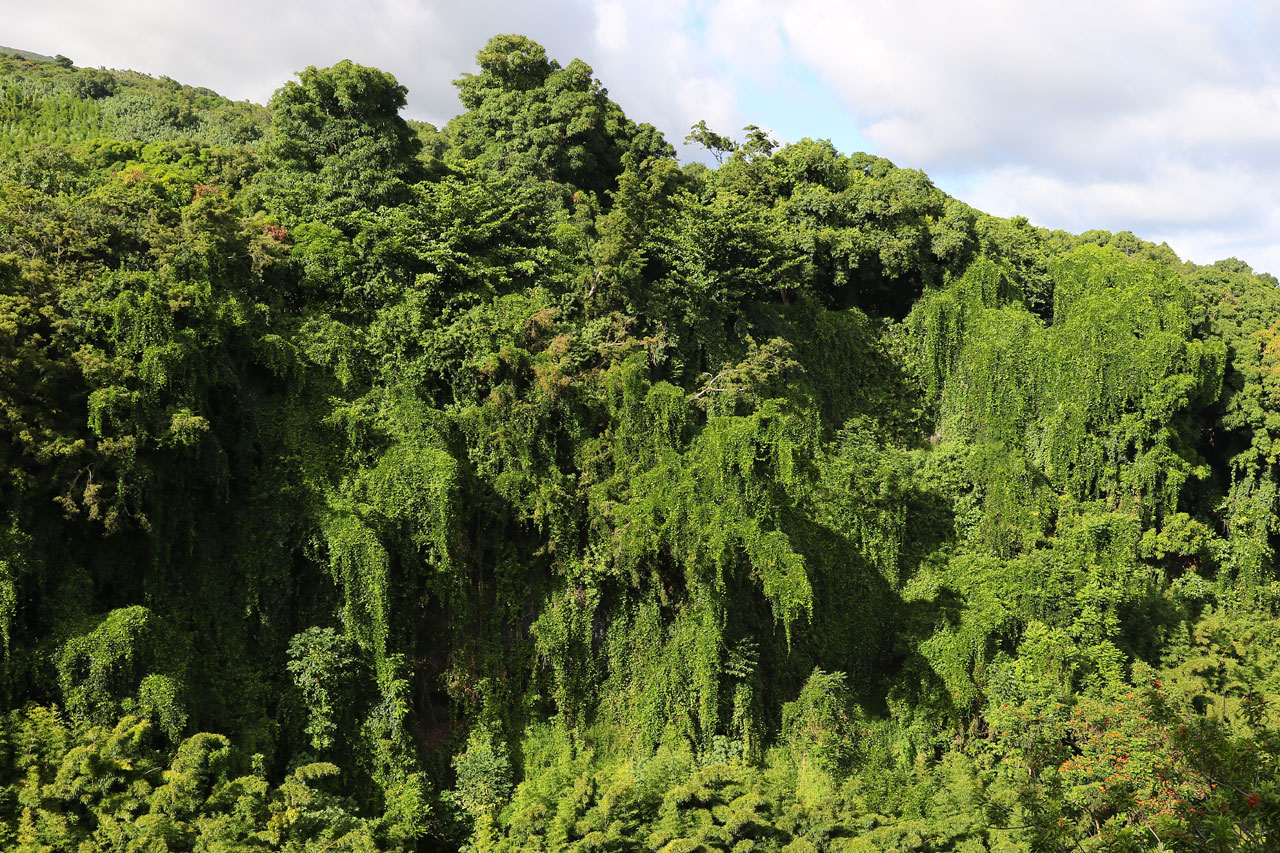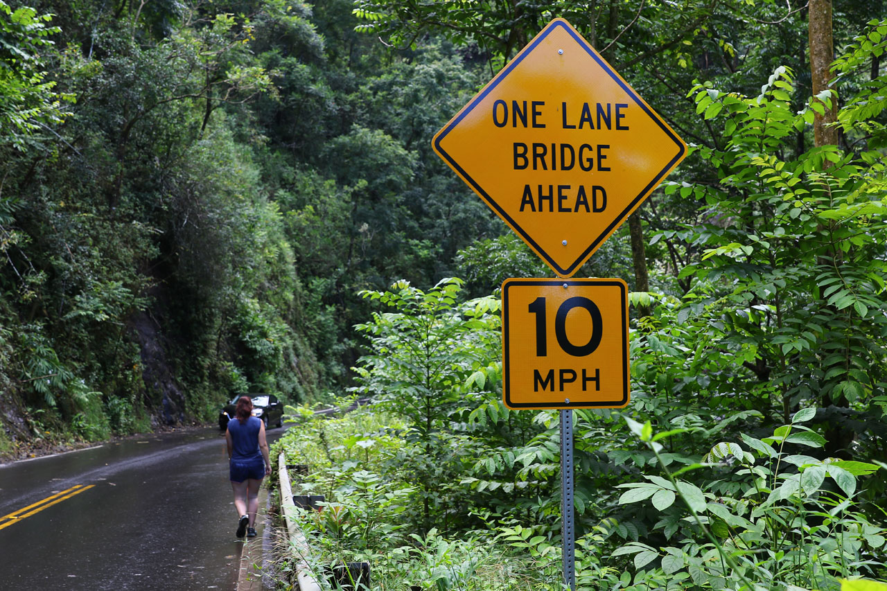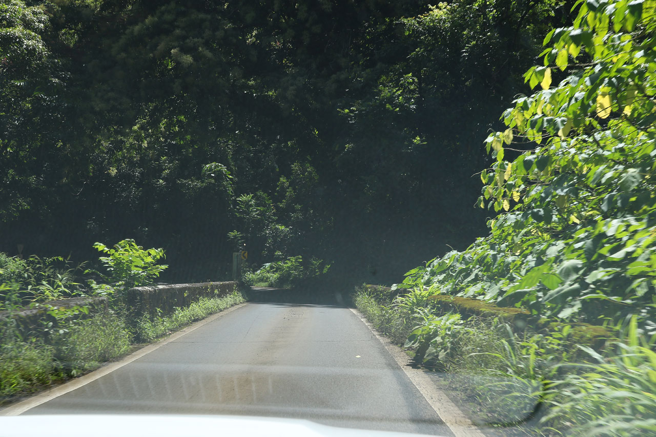 Car la route pour Hana fait parti de ces rubans de bitumes mondialement connus pour une raison ou une autre. Ici il y a environ 620 raisons allant à droite ou à gauche + 46 ponts à voie unique, tout ça serpentant à flan de falaise dans une véritable jungle. Ha oui c’est superbe mais que c’est chiant de conduire là-dedans. On va tout doucement, ça monte, ça descend, on enchaîne les virages aveugles, on doit gérer des touristes inconscients qui marchent le long de la route ou qui manoeuvrent comme des idiots – mention spéciale aux chinois dans un cas comme dans l’autre. Ca plus les locaux qui roulent comme des dingues, les travaux et les camions… Bref on met 4 heures pour faire 84 petits kilomètres. D’autant que nous avons stoppé à différents endroits pour profiter un peu de la vue.