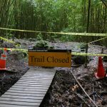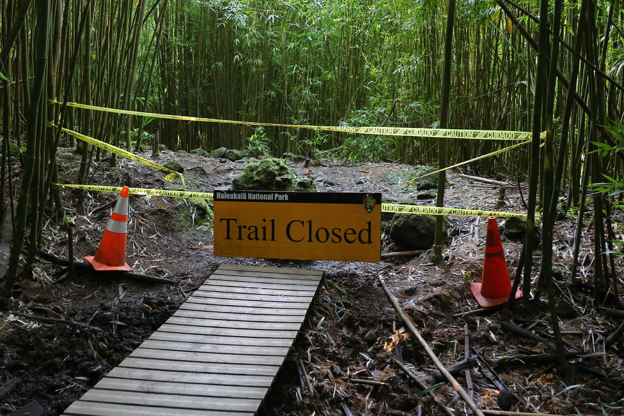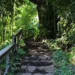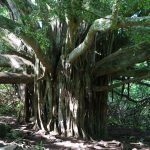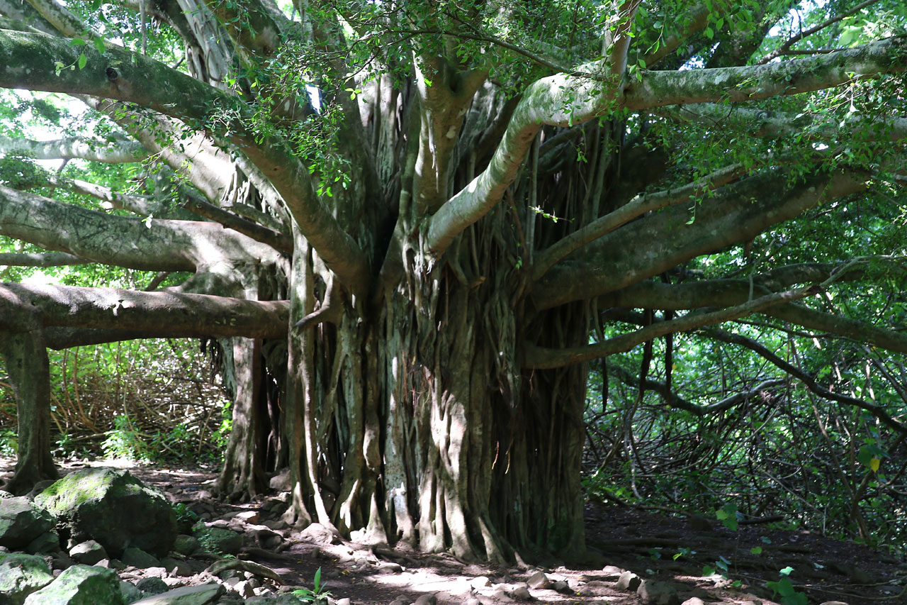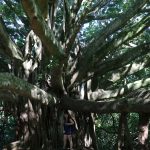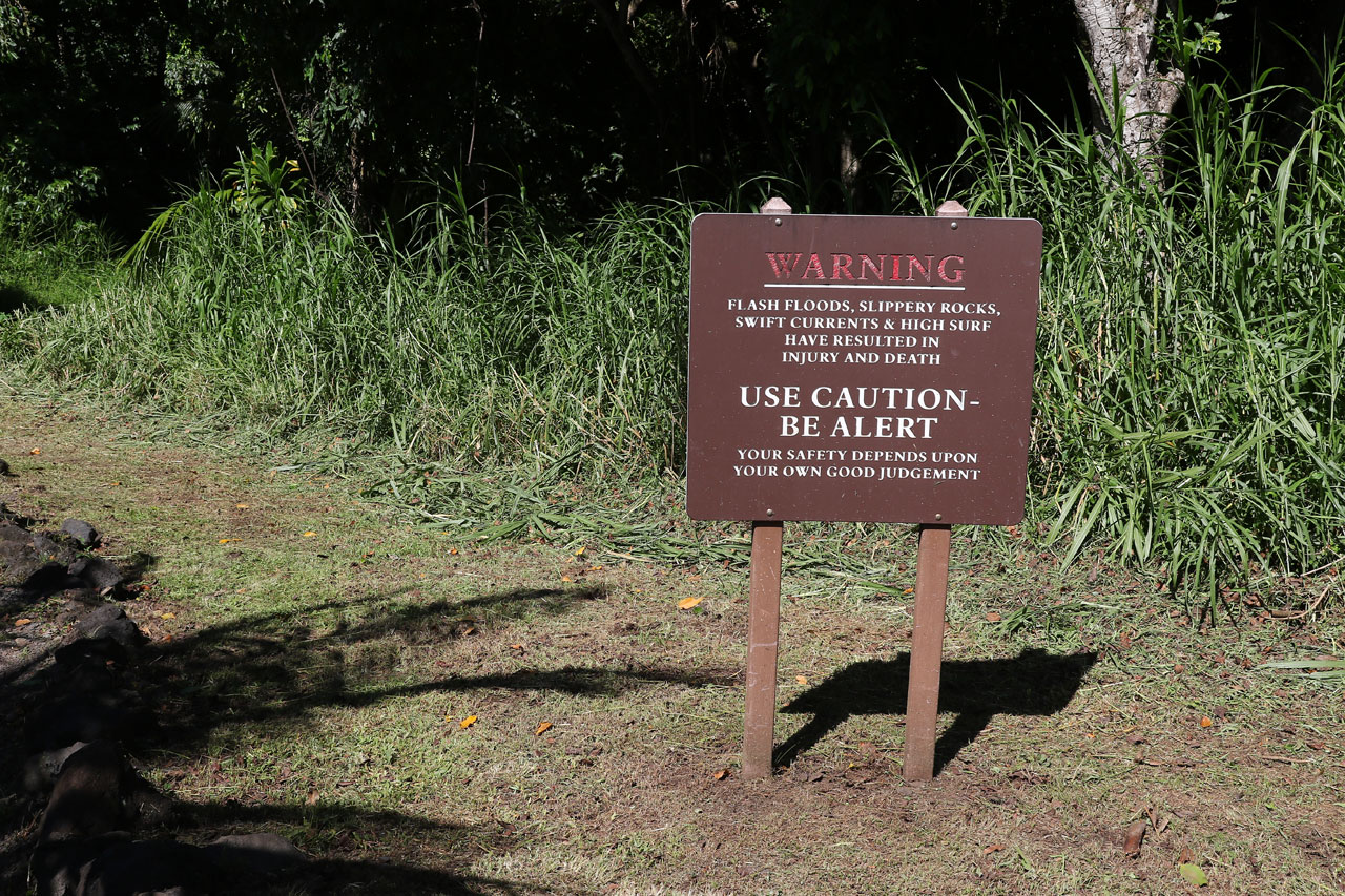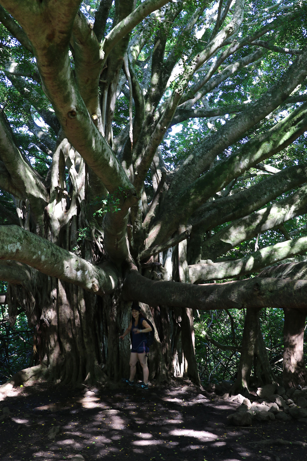 Retour sur la route pour arriver au Kipahulu Visitor Center, point de départ du Pipiwai trail, un chemin de rando repéré par Aurélie. A peine arrivé, on nous annonce qu’une partie du chemin est fermée car trop dangereuse en ce moment. Mais nous ferons aussi une découverte capitale. En effet, nous avons prévu de faire le tour complet de la partie Est de l’île, donc en longeant la côte Sud. Hors nous découvrons une fois sur place que cette route peut être fermée si trop dangereuse – heureusement pour nous elle est ouverte, mais surtout nous apprenons qu’une partie de cette route n’est pas goudronnée sur 15 miles et que le reste est dans un état dramatique sur 15 autre miles. Une fois rassuré sur la faisabilité de la chose avec notre voiture, nous partons sur le Pipiwai Trail. On y trouve entre autre un arbre à la taille prodigieuse (voir la photo où Aurélie pose devant), des chutes d’eau tout à fait sympathique et une forêt de bambous au bout de laquelle le chemin est barré. 45 minutes pour monter là, autant pour redescendre. Nous compléterons cette rando avec un autre mini chemin qui descend jusqu’à l’océan et remonte gentiment vers le parking. Une promenade de santé de 20 minutes.