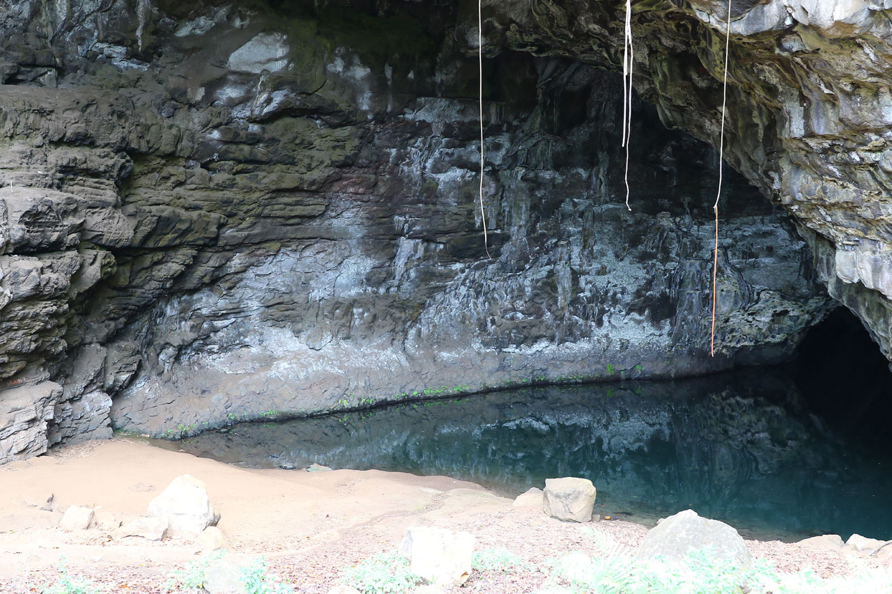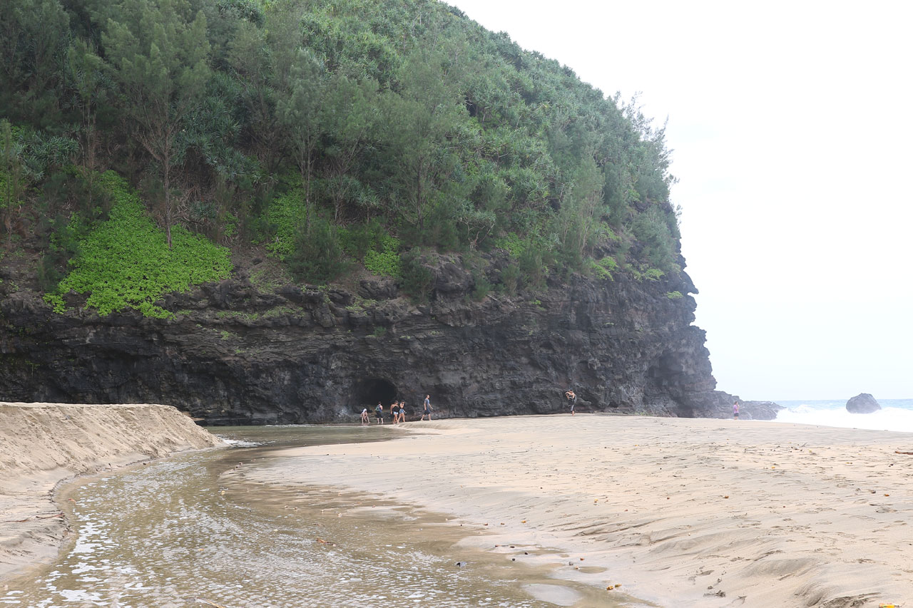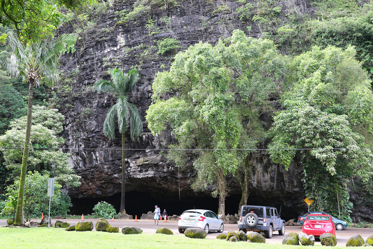 Donc je disais, ce matin, après m’être camé à l’advil histoire d’être un minimum en forme (pour info la boîte de 200 coûte 18€ ici, je dis ça je dis rien). Direction Ke’e Beach d’où part notre rando du jour. Stop en chemin à la Dry Cave, une grotte en bord de route qui comme son nom l’indique est sèche. Cela dit c’est impressionnant de rentrer là-dedans sachant les millions de tonnes de caillasses qu’il y a au-dessus de nous.