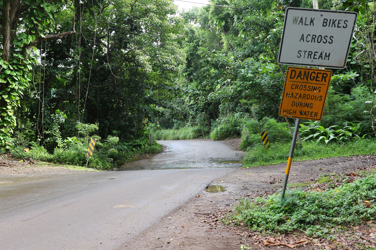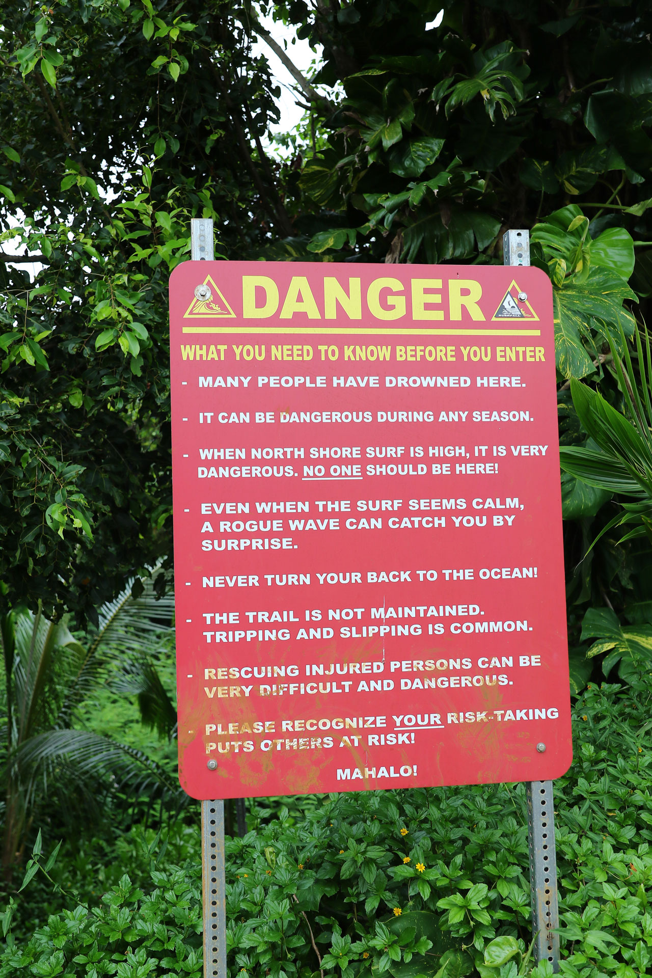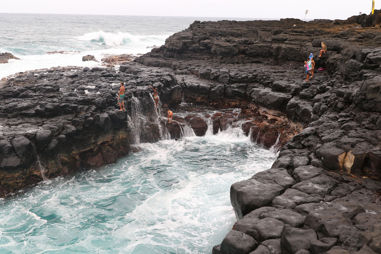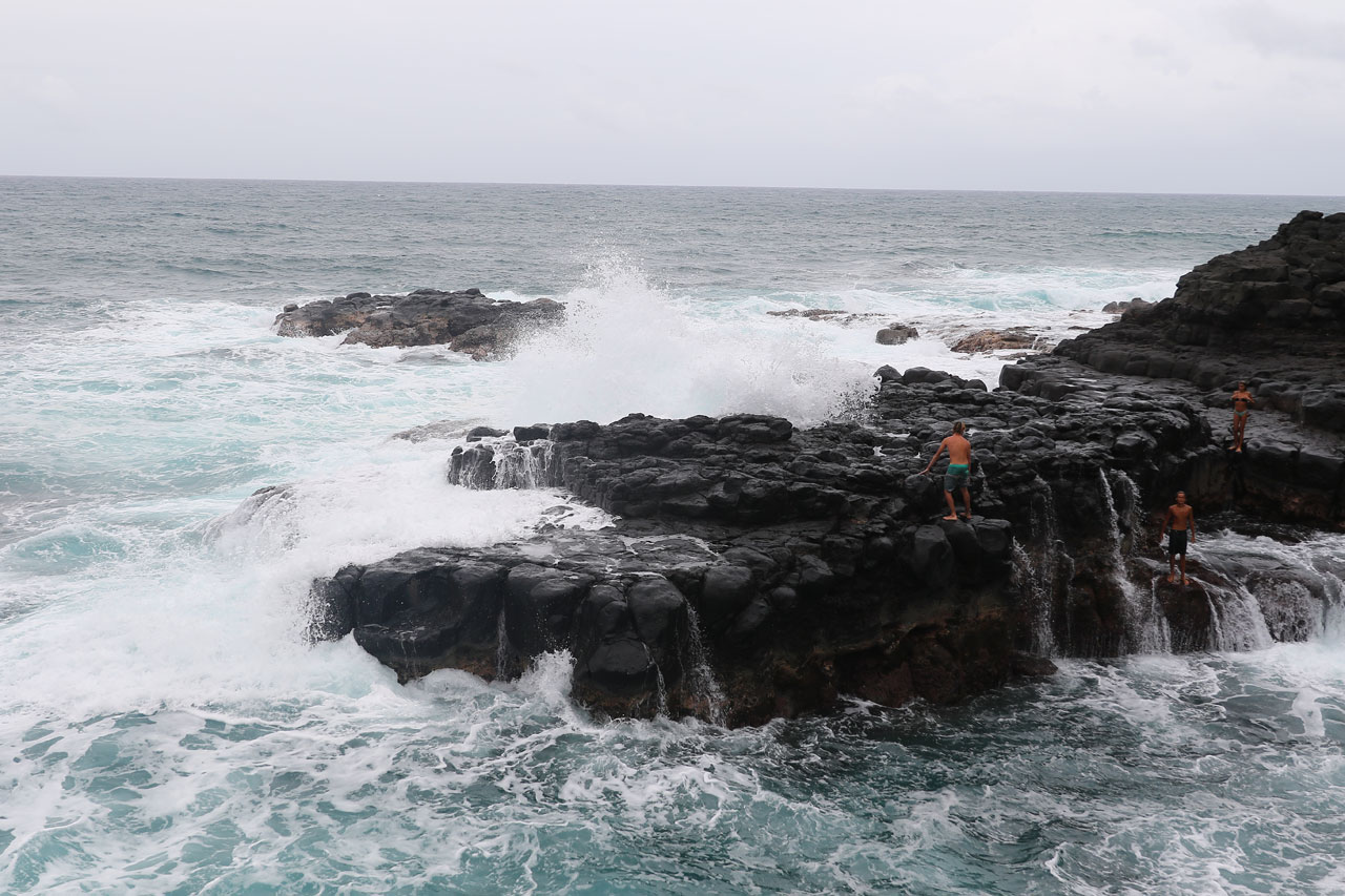 Retour à Queen’s Bath pour un second essai de parking totalement gagnant. Alors Queen’s Bath est une espèce de piscine creusée dans la roche/lave par l’océan car les vagues qui s’y fracassent sont très très violentes. C’est aussi la piscine des jeunes du coin et accessoirement un endroit extrêmement dangereux. Les courants y sont très forts, les changements de niveau de l’eau également et sur le chemin d’accès, on vous dit que c’est très très dangereux, que c’est compliqué pour les secours d’y aller et le nombre de morts qu’il y a eu. Là aussi ça se mérite car le chemin jusqu’au bord de mer est raide et glissant. On crapahute facile 10 minutes dans la jungle.