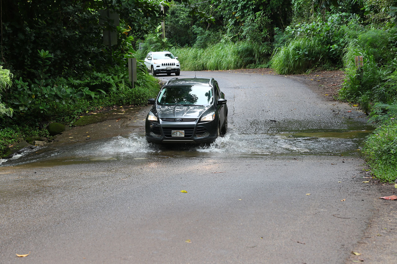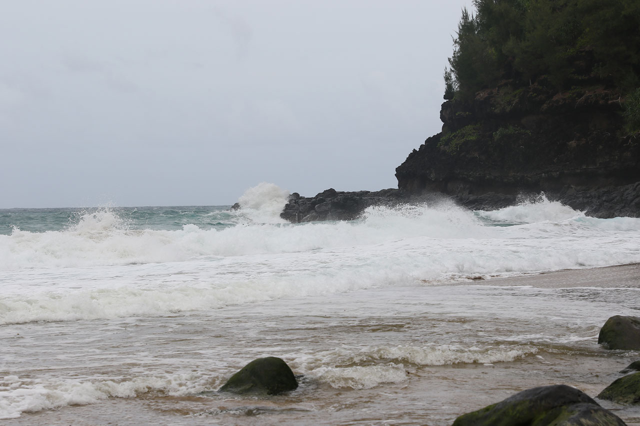 Il faut dire que c’était un peu funky car entre les gens mort de rire et ceux qui s’inquiétaient de savoir si je les avais récupéré, c’était un peu le foutoir. Aurélie se lance ensuite et traverse sans encombre. Du coup, avec cet imprévu, le second objectif du jour tombe à l’eau *haha* Pas de Hanakapi’ai Falls, d’autant que le chemin pour y aller est encore plus violent que le début du Kalalau trail. Dire qu’au départ, Aurélie voulait se faire le Kalalau en entier. 17,7km le machin, pas long qu’elle disait… sauf que 17,7 c’est l’allé seulement. Enfin bref, nous profitons de la plage qui est elle aussi ultra-violente, les vagues s’écrasent sur le sable avec un bruit assourdissant. Pendant que les chaussures sèchent autant que possible, nous faisons un petit tour et puis nous décidons de repartir. Il faut donc retraverser, bien entendu j’opte pour un chemin différent… fausse bonne idée, je vais encore glisser et manquer de finir intégralement dans l’eau avant qu’un type ne me rattrape in extremis. Je finirai doucement mais surement tandis qu’Aurélie aura remis ses chaussures le temps que j’arrive. J’enfilerai donc mes chaussures trempées pour le voyage de retour. 1h05 plus tard, le parking est en vue et c’est avec un soulagement non dissimulé que je me poserai dans la voiture. Vraiment ça m’a tué mais comme dit Aurélie, nous l’avons fait et c’est une petite satisfaction. La morale que nous tirons de ça, c’est qu’à Hawaii, tout se mérite. Tu veux le panorama qui tue? Pas de souci, il est à 2 heures de marche. Et ça c’est vérifier sur toutes les îles: les Manoa Falls sur Oahu, la lave sur Big Island et la Hana Road sur Maui.