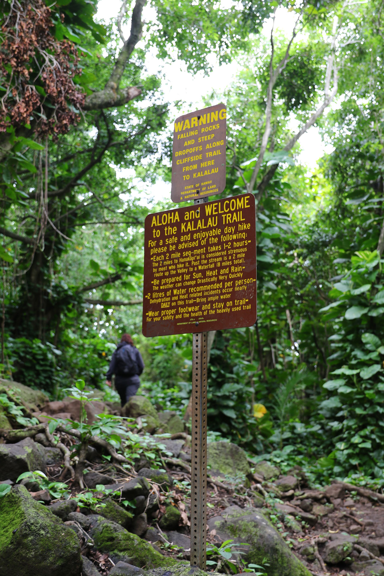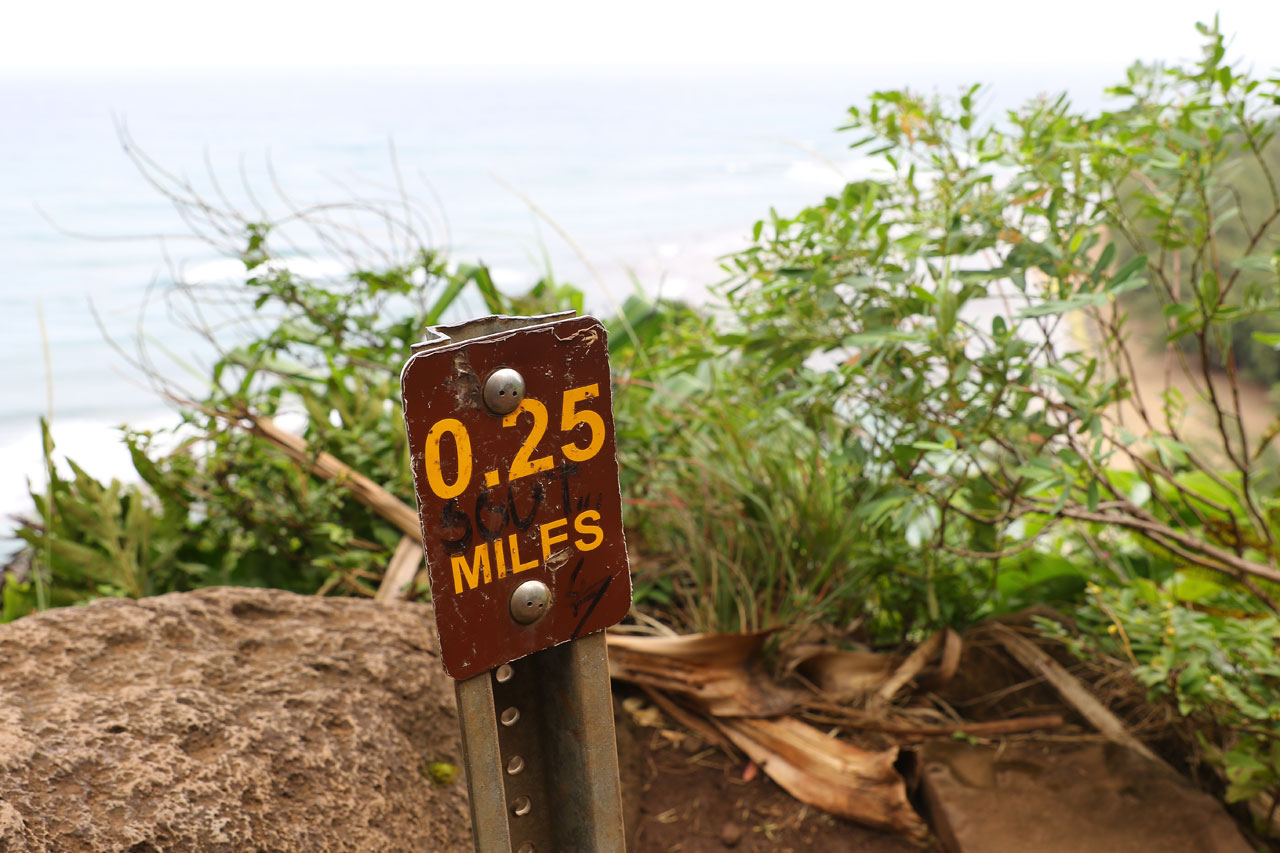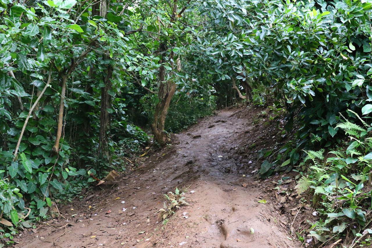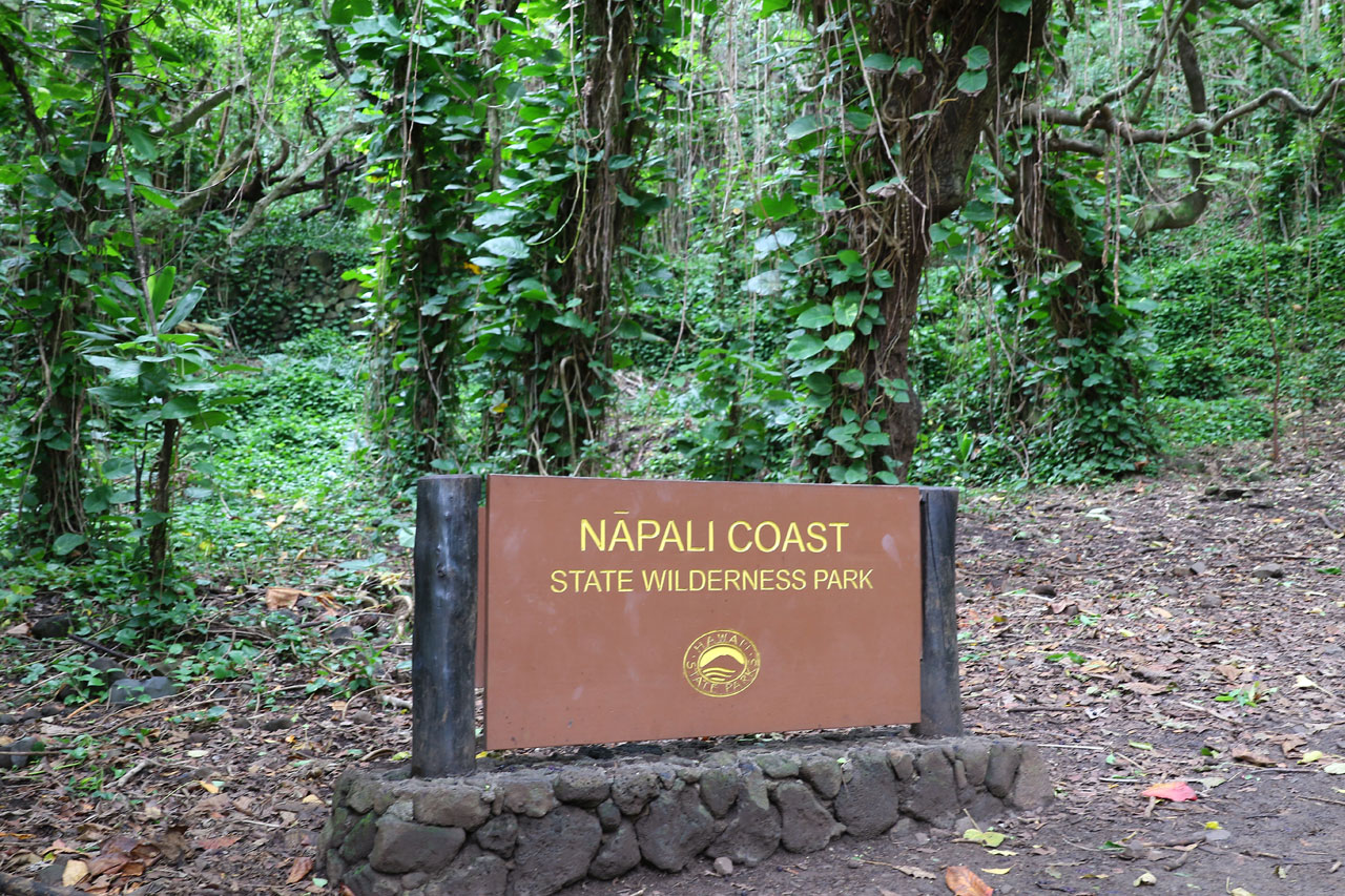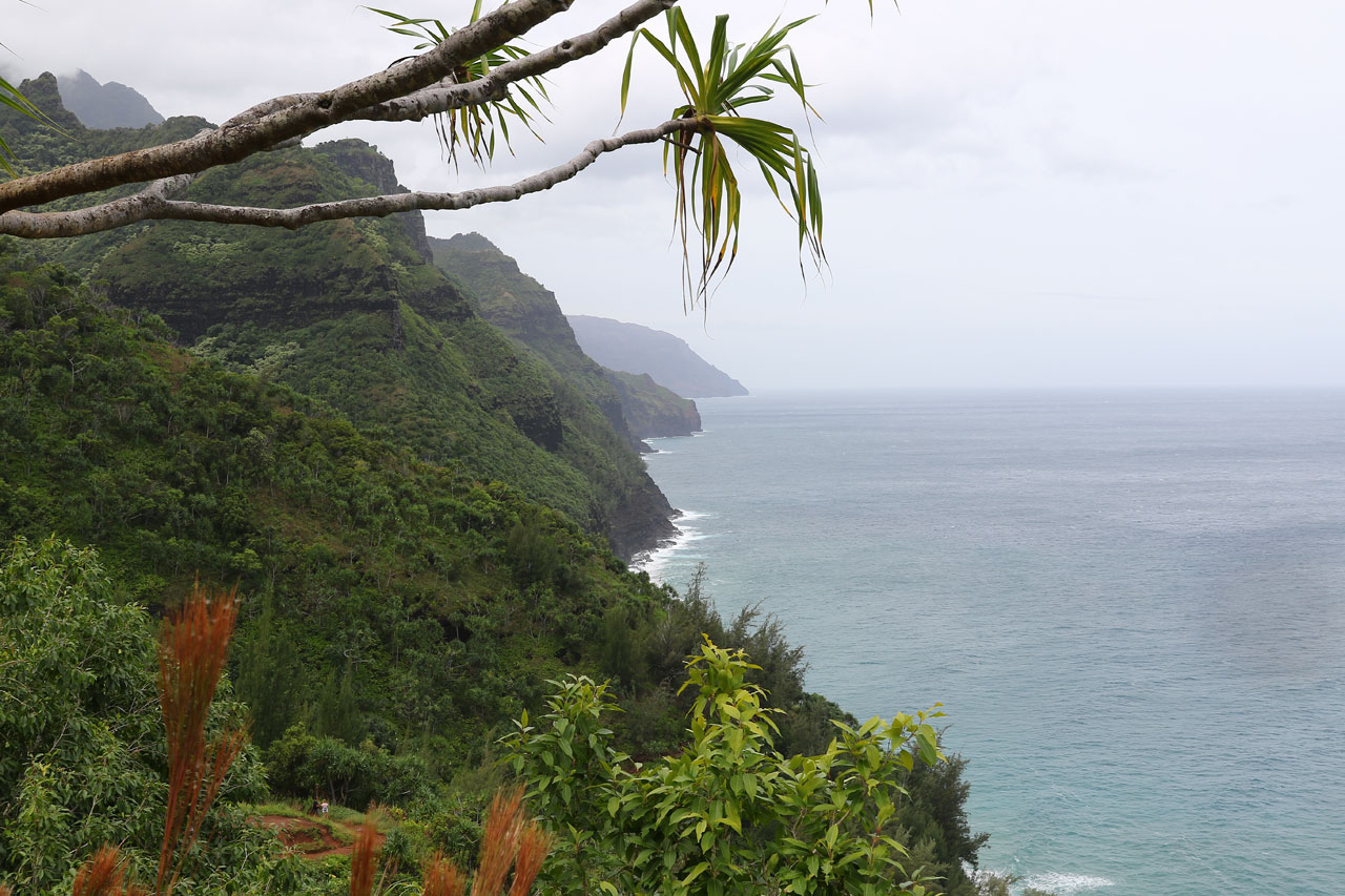 Une fois à la plage, nous trouvons sans difficultés le départ du Kalalau Trail, c’est simple: ça grimpe. Il est noté par les Rangers du coin comme étant « strenuous » ou ardu en français dans le texte. Au bout de 100 mètres, il était clair qu’il n’avait pas volé sa notation. C’est raide, étroit, humide aussi bien au sol que dans l’air et un poil surpeuplé. En voyant des gens en tongs ou chaussures de sport on se dit qu’ils sont inconscients vu le terrain. La palme revient quand même à ces parents qui avaient le porte-bébé sur le dos. Du délire. Ou alors c’est moi qui suit trop vieux pour ces conneries.
