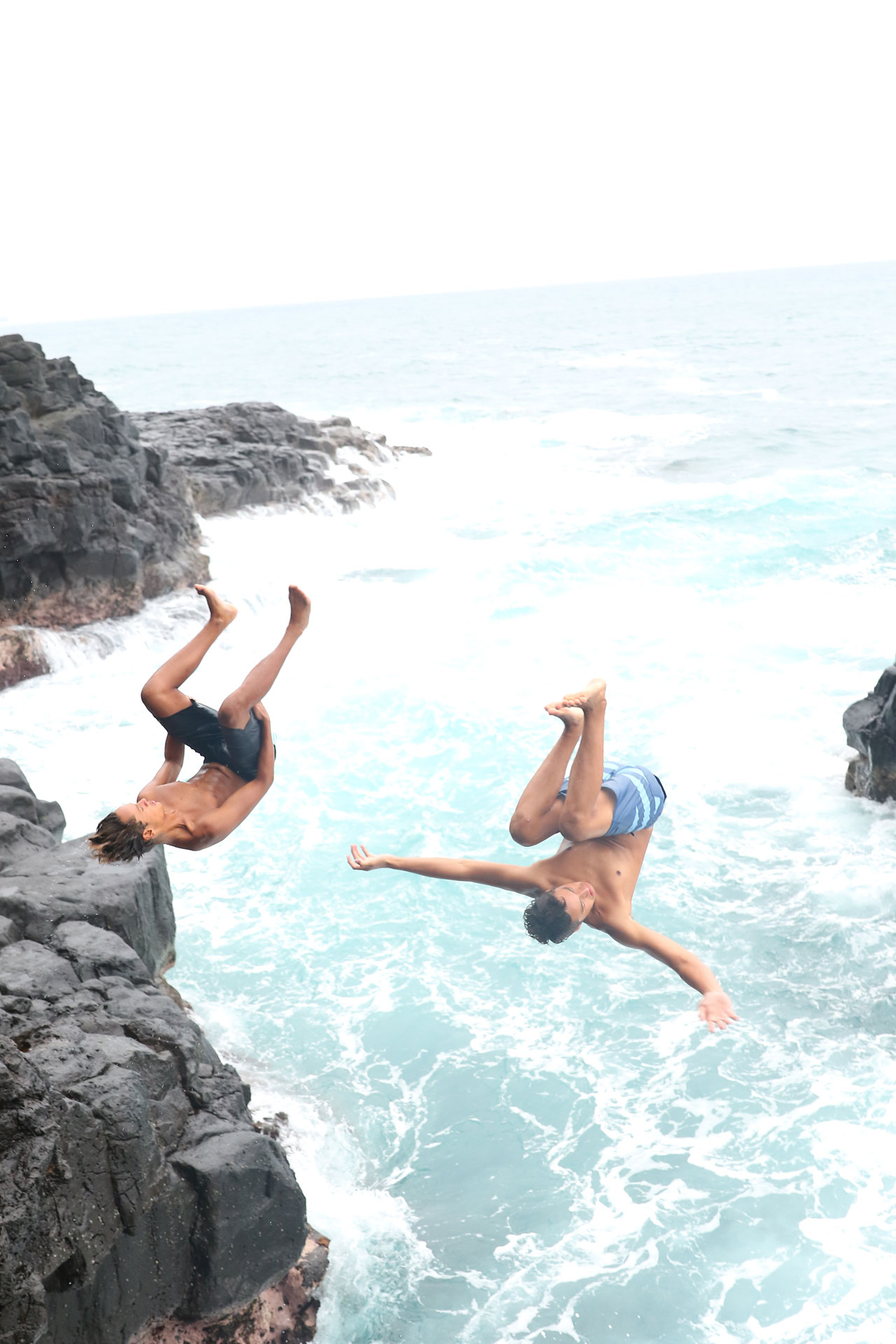De retour à Queen’s Bath, un des jeunes (12 ans max) de me demandera de le prendre en photo en train de plonger depuis le bord. Je dis ‘ok’ mais j’avoue avoir eu un moment de doute car c’était le pousser au crime en quelque sorte. Je fais mes photos, je lui montre, il est content. Là-dessus, 2 de ses potes débarquent (dans les 16/17 ans), eux aussi veulent leur photo depuis l’autre rive et en duo. Là je leur demande si ils sont sûrs de leur coup car ça finit par me poser un problème. Réponse du gosse: « Sure, we come here everyday ». « Ok… it’s your ass dude », il me sourit et se met en position. Ils attendent une vague qui leur convient et sautent. A priori, ils ont vraiment l’air de connaître leur affaire. Ne voulant pas les inciter plus, je dis que nous partons. Le petit me demande si il peut avoir les photos, je lui dis oui et il me file son email. Là-dessus nous repartons dans la jungle et retrouvons nos jeunes sur le parking. Visiblement ils ont pris un raccourci qui nous aurait bien faciliter la vie.