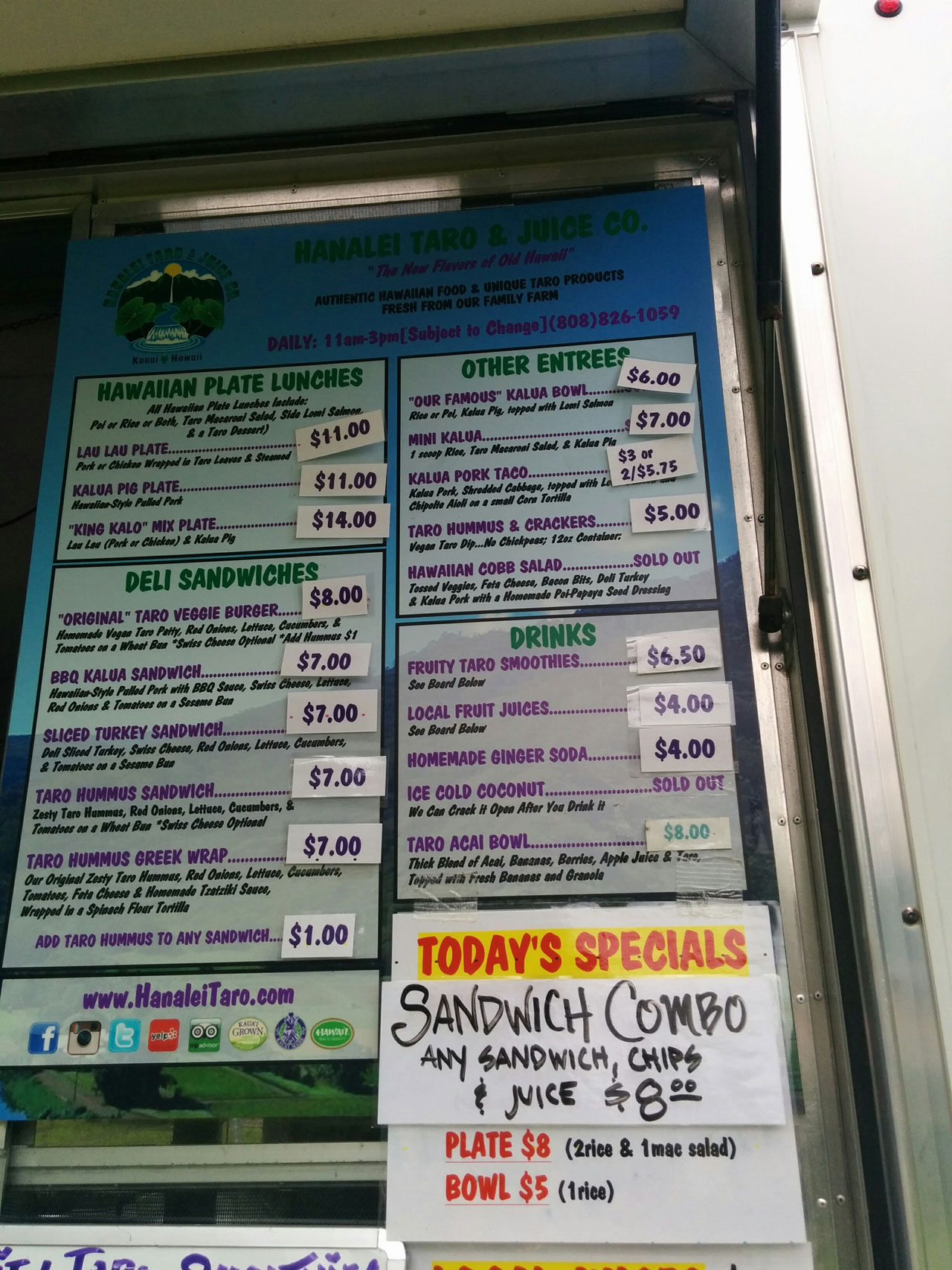Après ça, nous stopperons sur la route à Hanalei pour manger. Parce qu’il fait faim, enfin surtout Aurélie parce qu’en ce qui me concerne, je suis un peu patraque. Tout ça pour dire que nous stoppons à un food truck qui nous a été recommandé car il sert des plats 100% hawaïens. Aurélie s’attaquera au Kalua Pig Plate tandis que j’opterai pour un Kalua Bowl. Mélange de saveurs intéressant mais j’aurai du mal à aller au bout tandis qu’Aurélie engloutira son plat en quelques minutes.