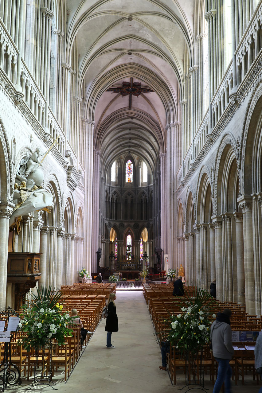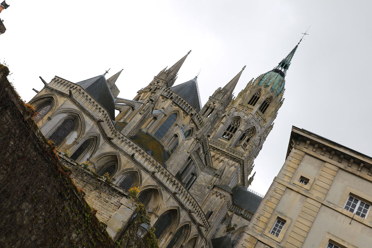 Une fois sortie de là, il pleut bien entendu. Mais nous décidons quand même d’aller voir la cathédrale. Et ce fut une bonne idée. Architecturalement, je ne saurais trop dire quel est son style, toujours est-il que c’est différents des grandes cathédrales type Paris/Reims/Orléans. Moins lourd, moins chargé et bien plus classe. L’intérieur aussi est plus sobre. Mais ce qui m’a surtout surpris c’est qu’autant de l’extérieur, elle paraît immense, autant à l’intérieur elle fait plus mesurer. Tout l’inverse de celle d’Orléans qui bien qu’elle en jette de loin, est simplement gigantesque dedans. L’autre chose bien dans celle de Bayeux est que la crytpe est ouverte. Rien de bien fou mais c’est toujours sympa à visiter. Bien entendu, Jean-Yves Bertier se fera remarquer en prenant ses photos au flash comme un gros triso alors qu’il est écrit partout de ne pas le faire.