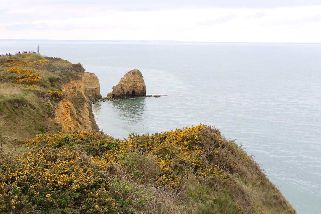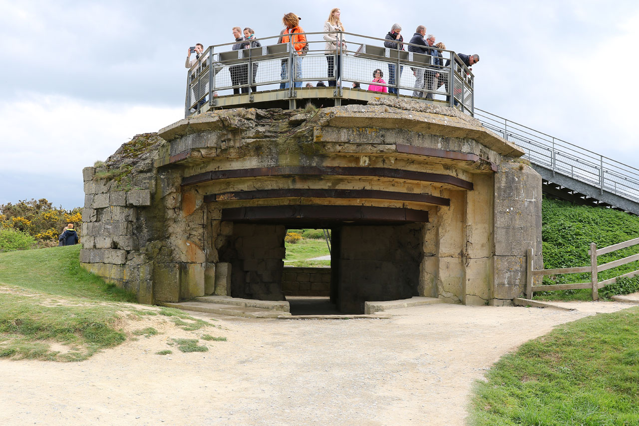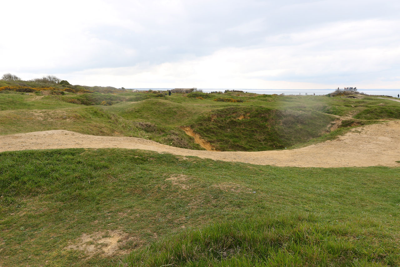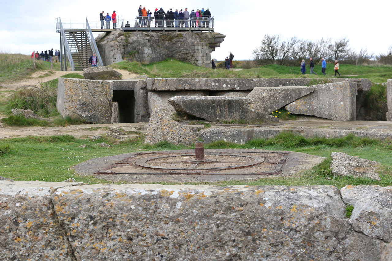 La pointe du Hoc fut notre destination suivante. Encore une fois l’endroit est très chouette, la vue imprenable sur la mer. Mais sur le bord, c’est un gigantesque champ de patate avec des cratères d’un fort beau gabarit et des bunkers dans des états de conservations divers et variés. Certaines n’ont plus que les fondations, d’autres les murs et certains ont eu droit à de l’entretien et on peut y entrer – notamment dans celui qui se trouve au bout de la pointe. Comme je le disais plus haut, ceux qui ont débarqué là, dans le genre « pas de bol » ils avaient tout gagné. La plage fait au grand max à marée basse 10 mètres de large mais surtout, ils ont eu 30 mètres de falaise à grimper pour se retrouver nez à nez avec Gunther et sa mitrailleuse. Si jamais Gunther n’avait pas déjà eu leur peau en les canardant depuis le haut de la falaise. Là on se rend bien compte du merdier que ça a du être. Tout est plus concret.