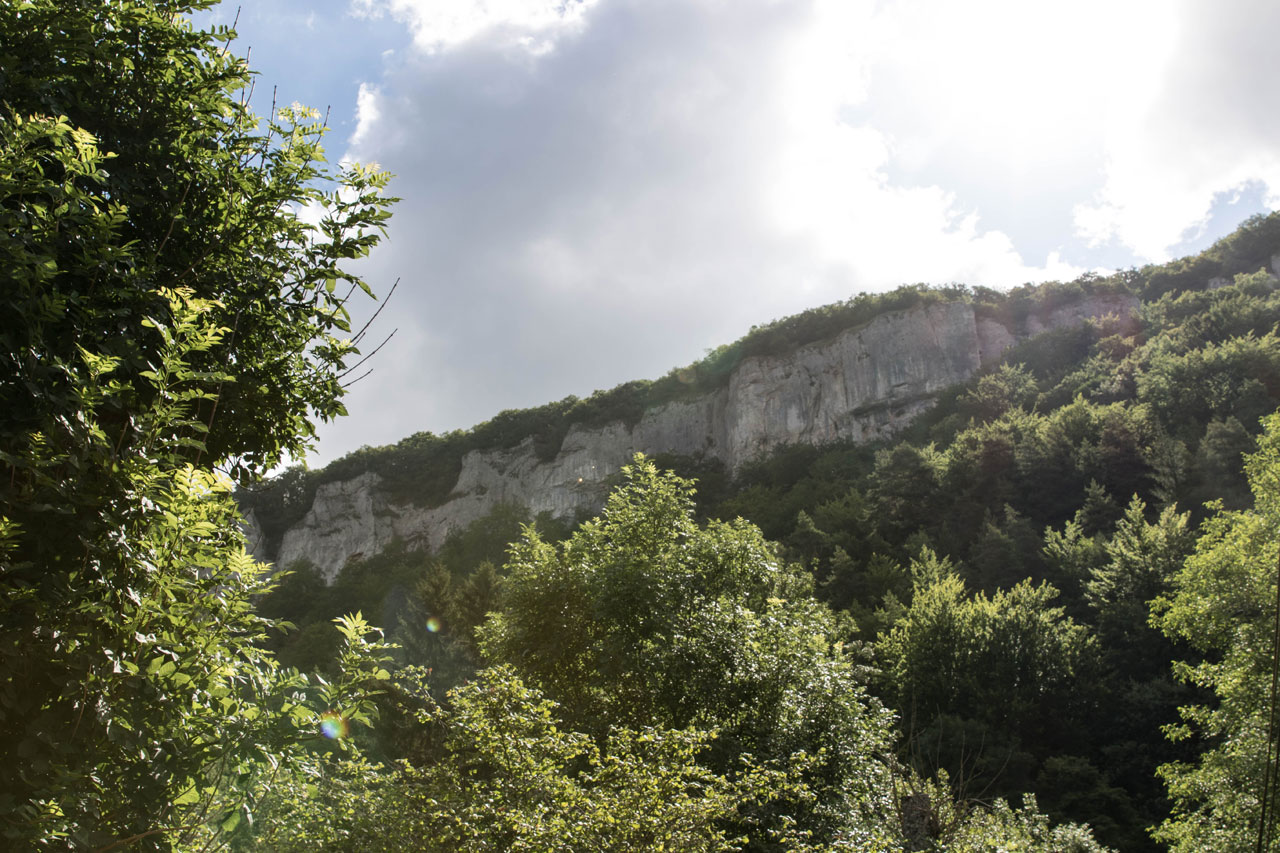 Donc la rando commence par une montée de type violente car le chemin, raide comme il se doit, nous amène tout droit au sommet de la falaise de calcaire surplombant Bouilland. A vue de nez je dirais que nous sommes montés de pas loin de 100 mètres et que la falaise de calcaire doit faire dans les 45/50 mètres de haut. Falaise que nous longerons sur quelques centaines de mètre avant de redescendre dans la vallée pour grimper le versant d’en face. Pour info la descente fut 100 fois pire que la montée. La montée sur l’autre versant fut elle aussi éprouvante mais pour d’autres raisons: goudron + soleil. En effet, il était à peine 10 heures mais le soleil tapait déjà bien comme il faut et marcher sur une petite route sans ombre, c’est hard. La montée ne payait pas de mine mais quand nous avons retrouver du plat, nous avons eu l’impression d’être des Formule 1. Nous passerons devant les ruines d’un abbaye avant de nous enfoncer dans un petit sous bois et de finir par revenir à notre point de départ après avoir éviter moult chardons, orties et ronciers ainsi que quelques taons qui ont tenté et parfois réussi à nous piquer. Enfin surtout moi.