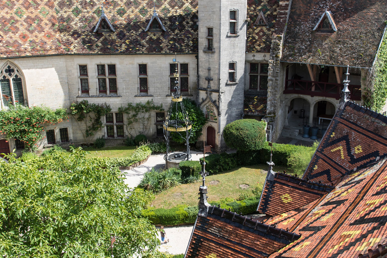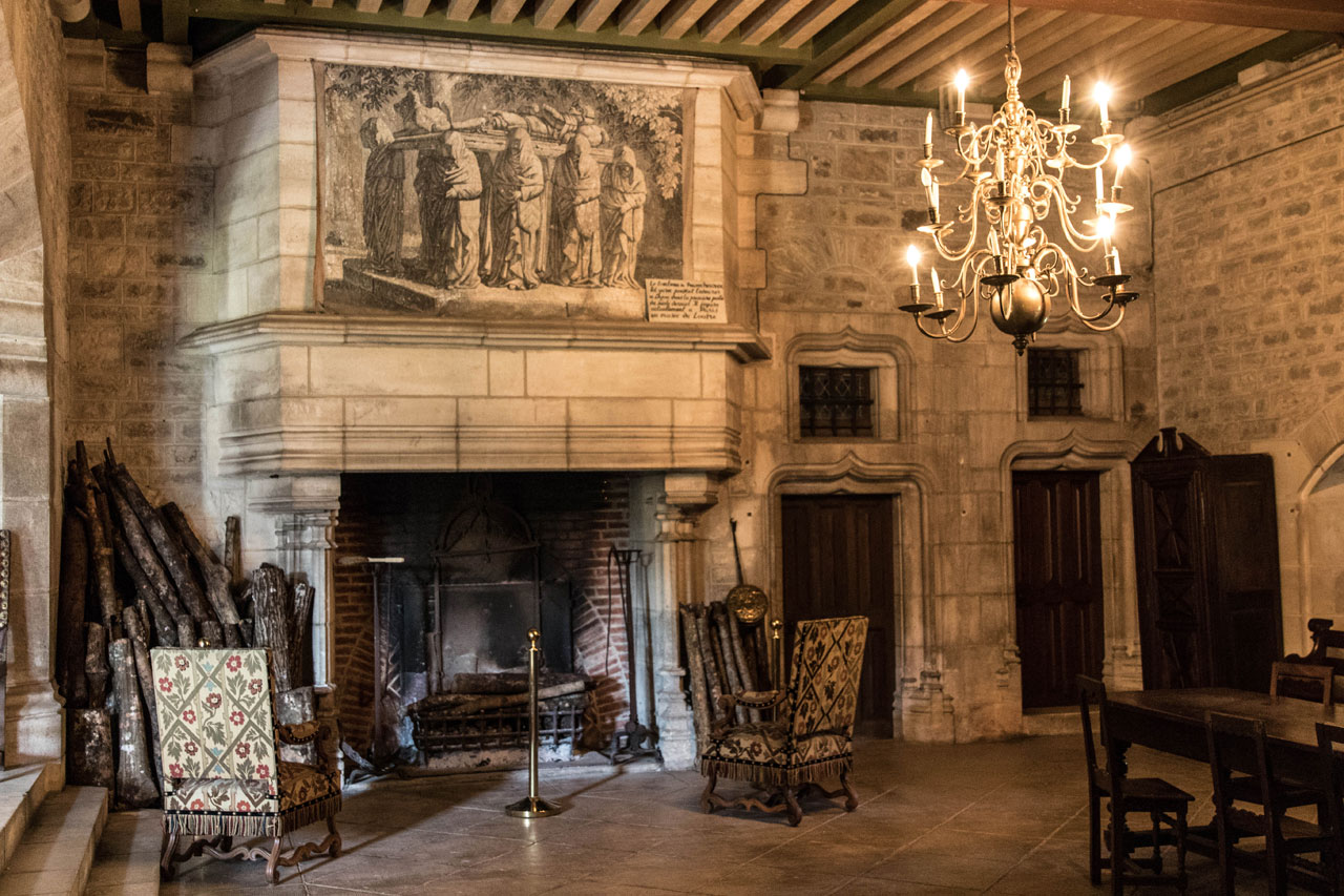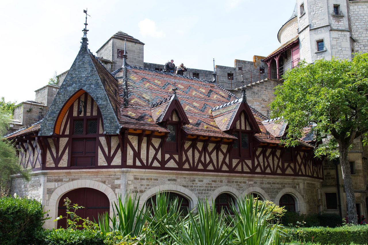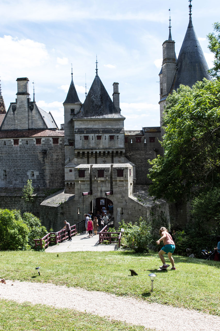Quant au château… HAAA BAH VOILA! Ca c’est un château! Un pont levis, des murs bien épais, des tours rondes avec des meurtrières pour dégommer du pécores, des mâchicoulis pour pisser sur le mec en dessous, là on discute. C’est autre chose que les trucs de fillettes le long de la Loire. HA on me dit dans l’oreillette que c’est une autre genre de château. Passons. Le truc, c’est qu’en plus celui là est beau. Avec son petit jardin intérieur, ses toits colorés, ses grandes pièces à vivre, il a du chien. Et en plus il est à échelle humaine. Pas trop grand mais pas étouffant non plus. Un chouette petit château, bien exposé, avec en plus une jolie vue. Nous repartirons tranquillement après notre visite au milieu de tous les noeunoeuds du coin, abrutis au point de s’asseoir sur le mobilier d’époque ou bien de gueuler sur Kilian pour qu’il arrête de mettre les doigts dans les yeux d’Enzo qui lui-même tire les cheveux Kevin. OS COURT!