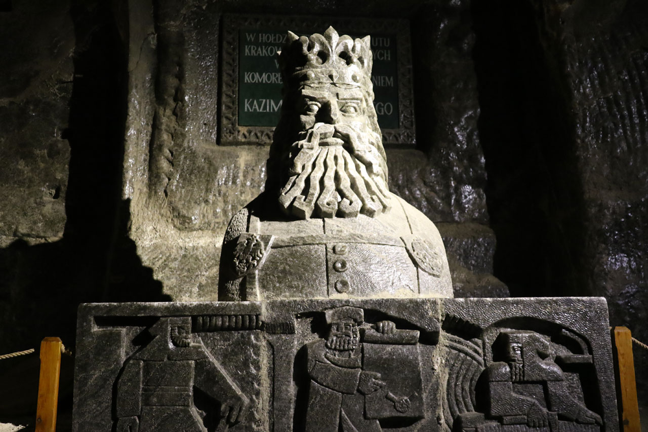 Donc la mine de sel, de ce que j’en sais, à contribuer en partie à la richesse de Cracovie car dernière est très ancienne. Nous sommes passés dans des salles vieilles de plusieurs siècles. Après l’endroit est tellement structuré pour le tourisme de masse (entre l’église et la salle de banquet on en oublie que l’on se trouve sous terre), il n’y a plus grand chose d’authentique là au fond. Tout est archi balisé, protégé de façon à réduire les risques aux maximum. On serpente dans les 2 kilomètres de galeries aménagées (sur les 200 que comptent la mine) en regardant là où on nous dit de regarder. Les groupes se suivent à 2/3 minutes d’intervalles et les mises en scène font qu’on se croirait chez Mickey à faire la queue pour le train de la mine. Ceci étant dit, une fois qu’on se rappelle que l’on se trouve au maximum de la visite à 135 mètres sous la surface, on se dit que ce que l’on voit est prodigieux. L’immensité de certaines salles, la finesse de certaines sculptures, c’est impressionnant – bien que la statue de Jean-Paul II fasse plus penser à l’Empereur de Star Wars qu’autre chose.