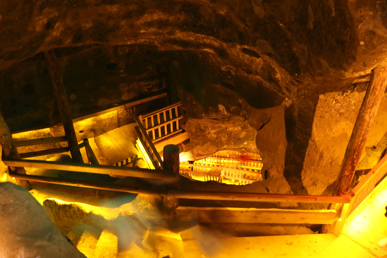 C’est parti pour la descente d’un escalier interminable qui nous conduira 65 mètres sous terre. Je vous aurais bien explique l’historique du lieu, seulement le récepteur que l’on m’a donné pour écouter la guide était défectueux donc j’avais l’image mais pas le son. Quant à Aurélie, son récepteur fonctionnait par intermittence. Les contrariétés s’accumulent gentiment. Je vous ai dit que la guide se foutait complètement de son groupe? Elle débitait son bordel sans vérifier si tout le monde suivait ou pas et c’est la guide du groupe suivant (d’une amabilité rare elle aussi) qui nous virait des salles parce que ça n’allait pas assez vite *ZEN*
