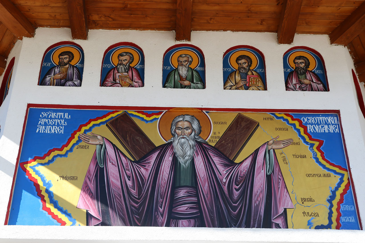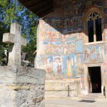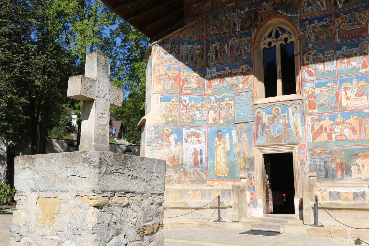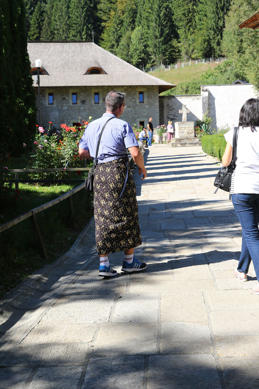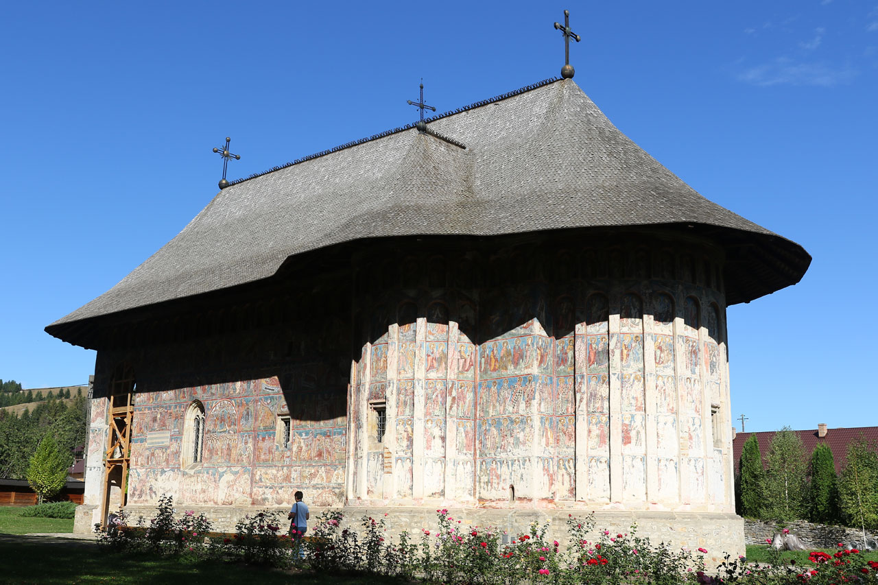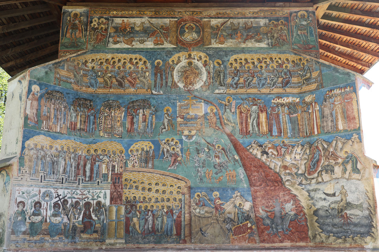 Aujourd’hui était le jour de la fête des croix, du coup toutes les croix du pays faisaient l’objet d’une célébration quelconque. Donc en arrivant au monastère d’Humor, tout le monde était dans l’église pour la messe. Personne à l’entrée pour me faire payer la « taxa foto » qui me sort par les yeux et c’est tant mieux car il n’y a au final pas grand chose à voir hormis la petite église au milieu des anciens murs. Comme ils sont tous fait sur à peu près le même modèle, voir un monastère équivaut à en voir 50. Chose que confirmera le passage par celui de Voronet, où là le cerbère de la porte vous oblige à passer à la caisse pour une nouvelle fois ne pouvoir faire que des photos de l’extérieur. Et quand je dis qu’ils se ressemblent tous, s’en est au point où les peintures extérieurs sont quasi identiques. Le chemin vers l’enfer peint sur celui de Voronet a des copies quasi conforme sur les murs de celui de Moldavita et Sucevita. Donc bon… Oui c’est très joli, très ancien tout ce qu’on veut mais l’émerveillement des 2 premiers n’est plus là. Ha et pour la petite histoire, à Voronet ils sont tellement tatillon que les mecs en bermudas sont obligés de cacher leurs jambes, les épaules nues pour les femmes idem. Comme quoi la burqa… ouais non rien.