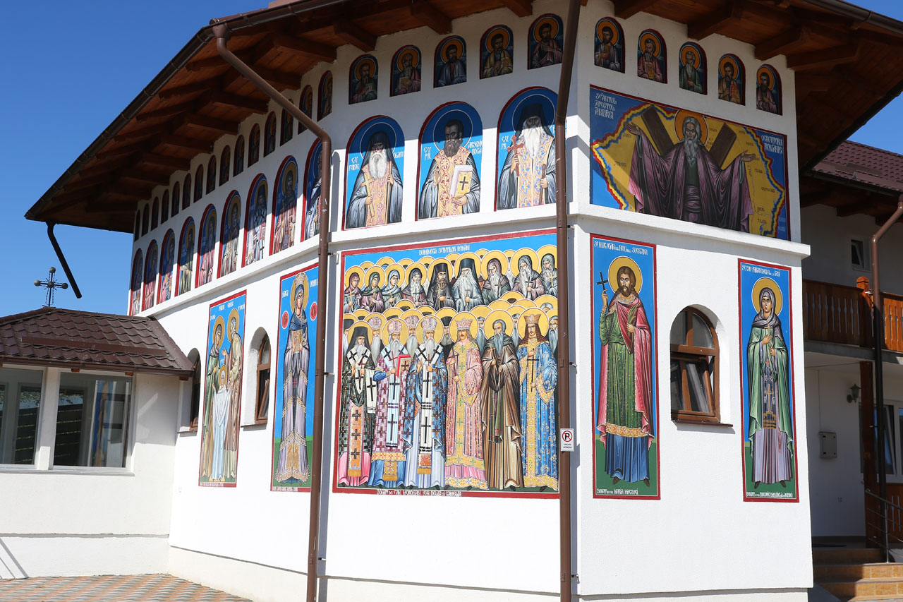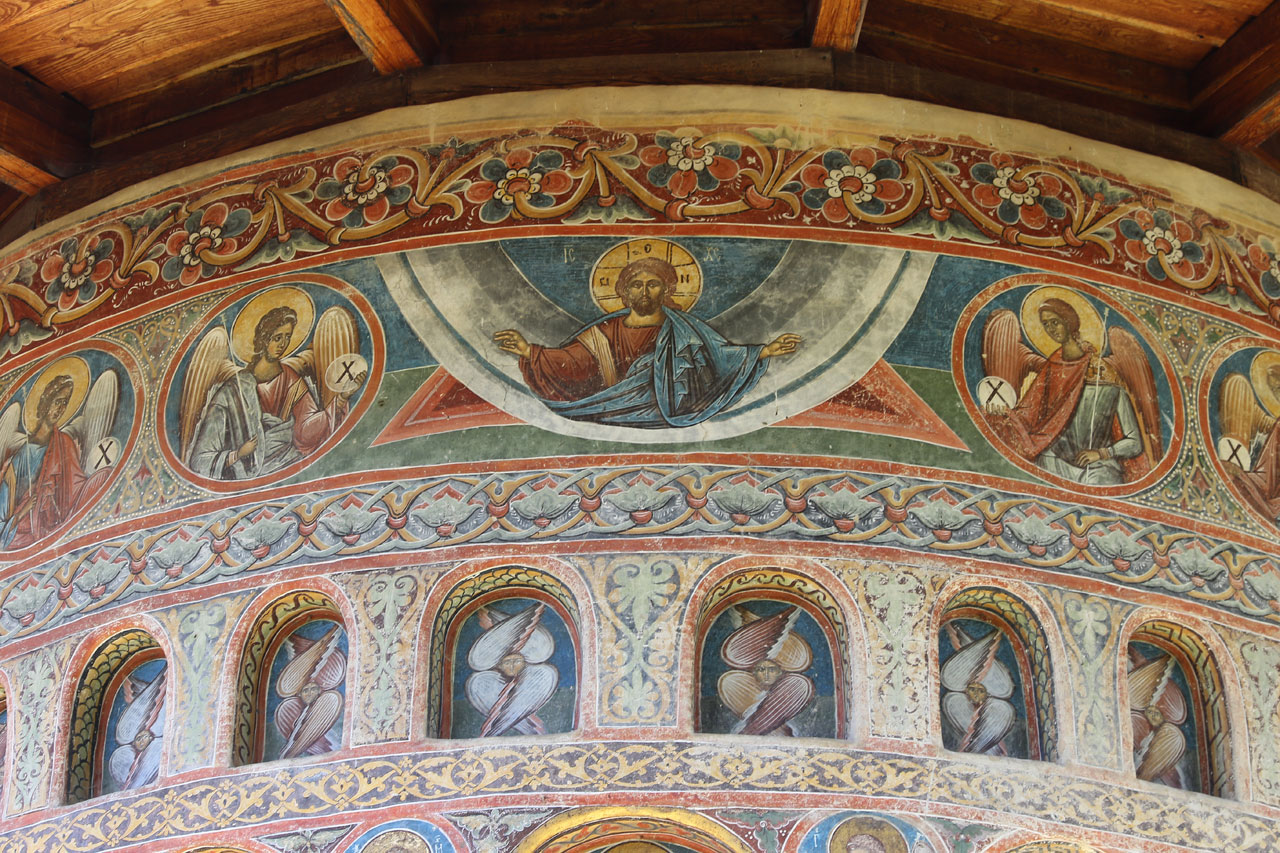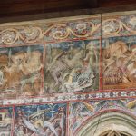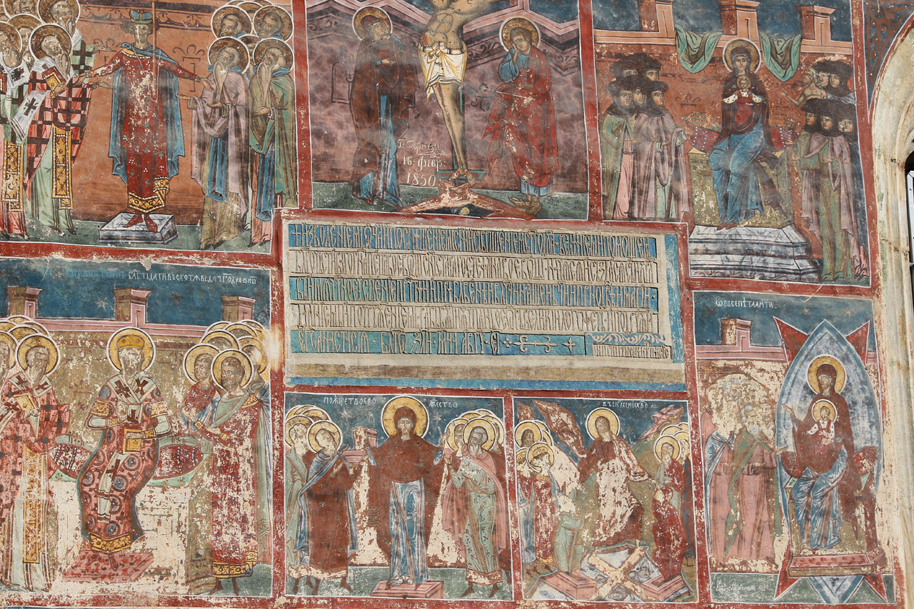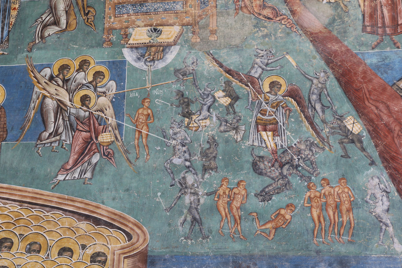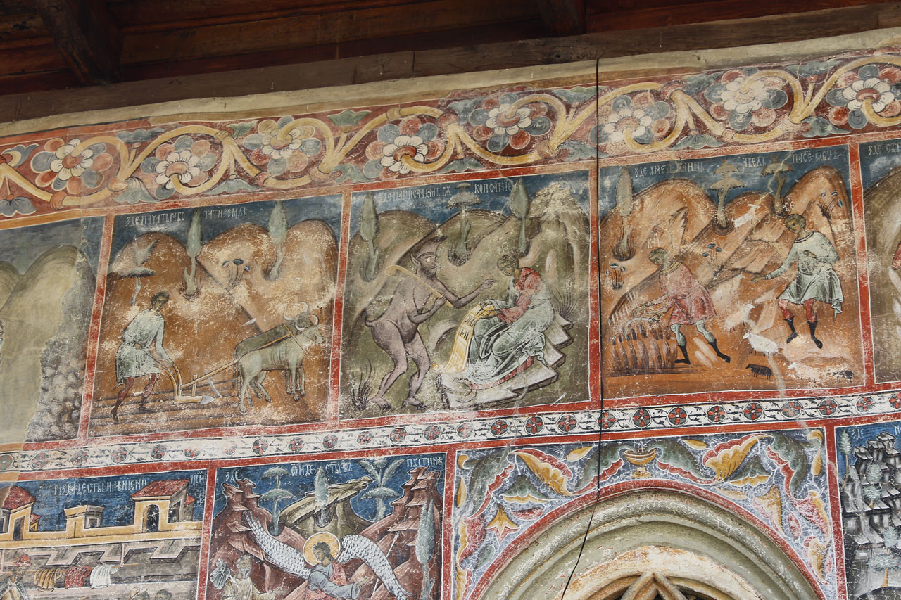 Aujourd’hui était le jour de la fête des croix, du coup toutes les croix du pays faisaient l’objet d’une célébration quelconque. Donc en arrivant au monastère d’Humor, tout le monde était dans l’église pour la messe. Personne à l’entrée pour me faire payer la « taxa foto » qui me sort par les yeux et c’est tant mieux car il n’y a au final pas grand chose à voir hormis la petite église au milieu des anciens murs. Comme ils sont tous fait sur à peu près le même modèle, voir un monastère équivaut à en voir 50. Chose que confirmera le passage par celui de Voronet, où là le cerbère de la porte vous oblige à passer à la caisse pour une nouvelle fois ne pouvoir faire que des photos de l’extérieur. Et quand je dis qu’ils se ressemblent tous, s’en est au point où les peintures extérieurs sont quasi identiques. Le chemin vers l’enfer peint sur celui de Voronet a des copies quasi conforme sur les murs de celui de Moldavita et Sucevita. Donc bon… Oui c’est très joli, très ancien tout ce qu’on veut mais l’émerveillement des 2 premiers n’est plus là. Ha et pour la petite histoire, à Voronet ils sont tellement tatillon que les mecs en bermudas sont obligés de cacher leurs jambes, les épaules nues pour les femmes idem. Comme quoi la burqa… ouais non rien.