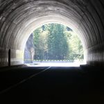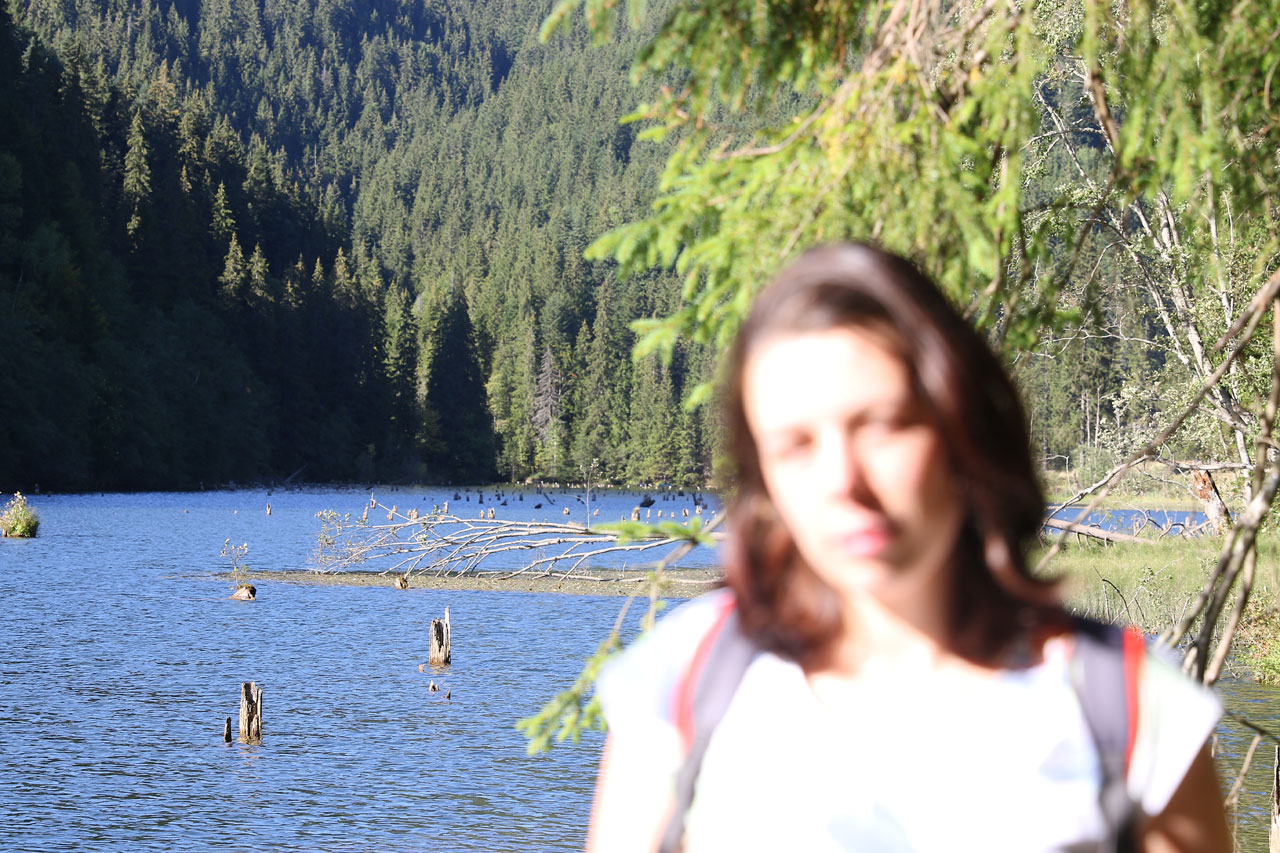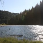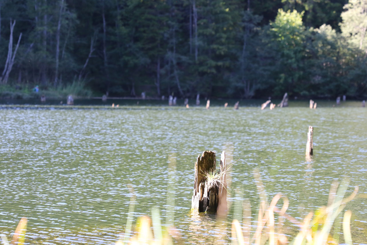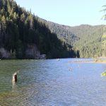 Le reste de la route ne fut que du serpentin montagnard sur un revêtement plus ou moins aléatoire. Avec le soleil de face, les ombres des arbres créaient des contre-jours assez pénible pour Aurélie qui a été prise en défaut juste une fois dans un virage. Elle a parfaitement géré ça mais ça nous a surpris. Un peu plus loin nous stopperons le long du lac rouge et profiterons un peu du calme de l’endroit. J’avoue qu’une maison là ne serait pas déplaisant.