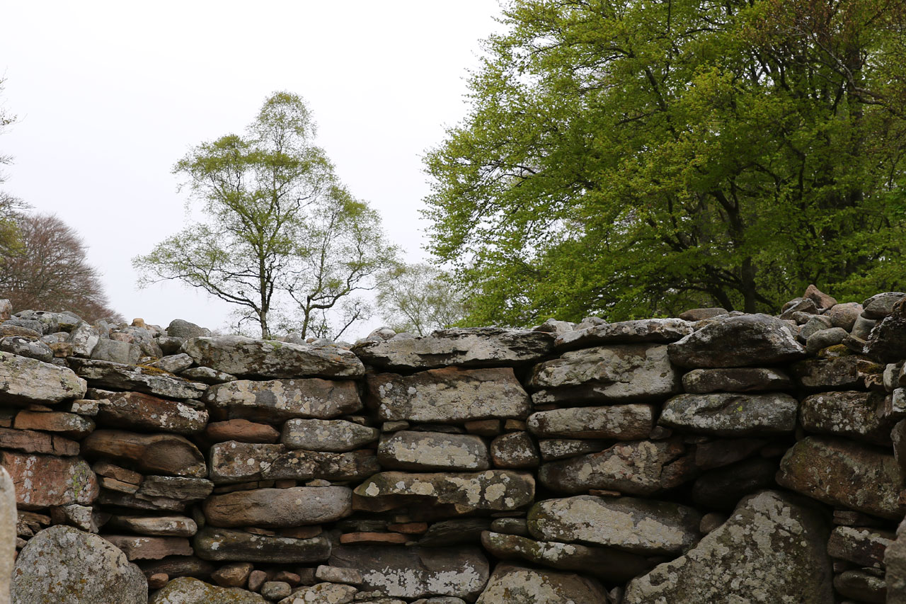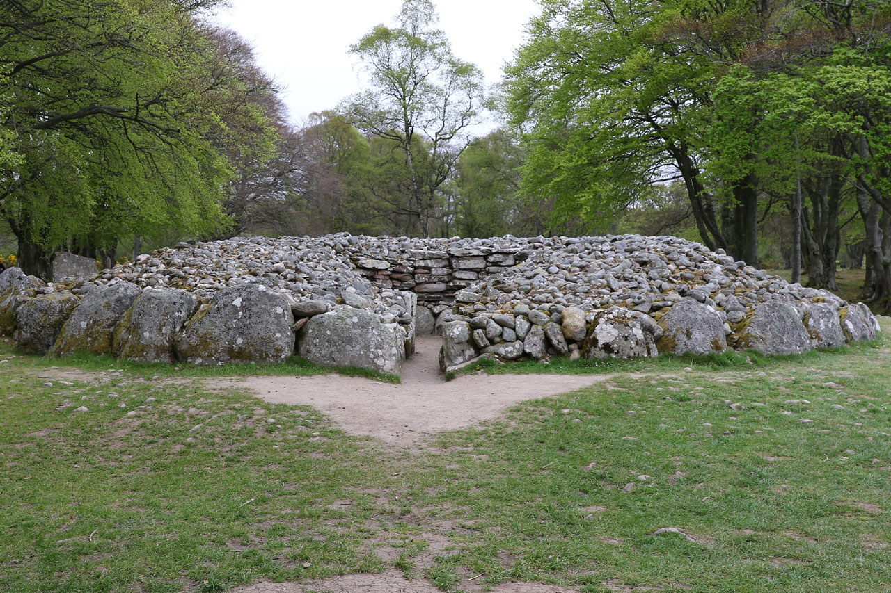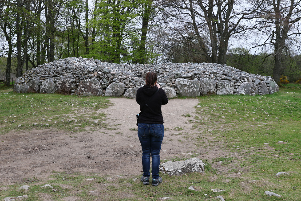 Les oeufs brouillés de ce matin n’ont malheureusement pas concurrencés ceux de la veille, n’empêche qu’ils ont fait ce qu’ils avaient à faire. Le saumon local aussi. C’est donc après un petit déj’ copieux que nous partons au nord-est d’Inverness pour voir des cairns. En gros des tas de cailloux du néolithiques ou paléolithique, nous ne sommes pas à 1000 ans près. Contrairement à ceux vu en Irlande qui ont été restauré, ceux là sont dans leur jus. Et puis il faut savoir qu’ils sont là. Là où l’Irlande était une usine à touristes, ici il faut quitter la nationale, quitter la départementale, tourner à droite après le chêne, passer le pont, contourner le mur de pierre et après la ferme on y est. Et j’exagère à peine. C’était au moins la garantie de ne pas tomber sur une armée de touristes. Ceci dit, ils ont un point commun avec les irlandais: leur orientation plein Est pour que le soleil du solstice d’été puisse rentrer à l’intérieur. Coïncidence? Je ne crois pas.