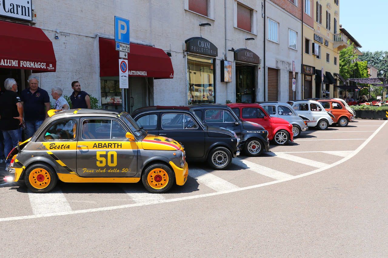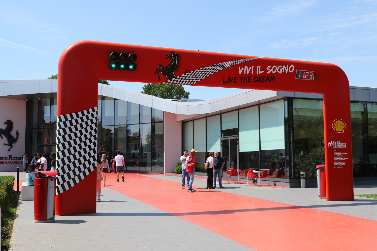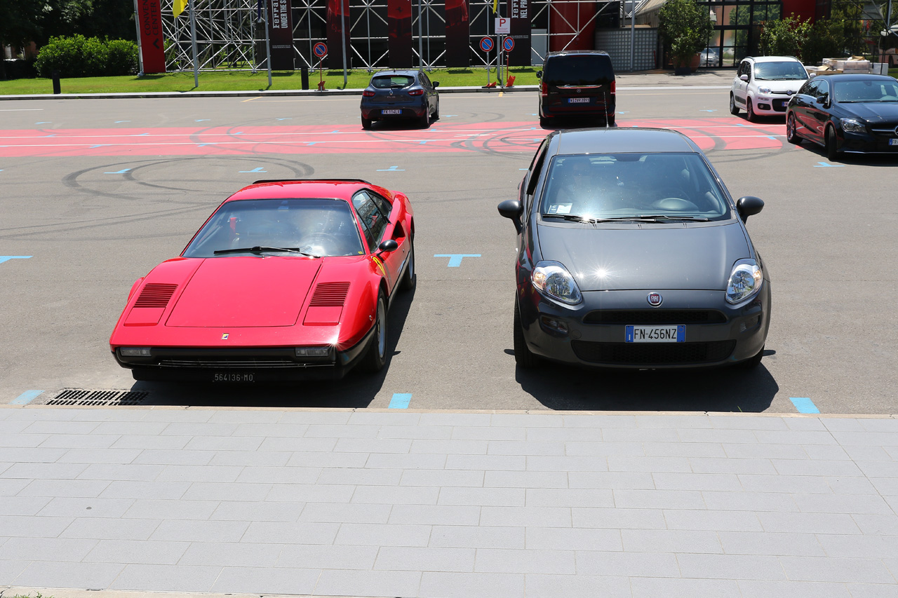 Malgré la chaleur nous décidons de partir en vadrouille dans les rues de la ville. Comme c’est dimanche, c’est peu de dire que c’est mort. Les seules animations dans les rues sont les gogols qui ont loué une Ferrari dans une des boutiques présentes autour du musée et qui font hurler la chiotte – mais trop quand même. Ce qui est drôle c’est qu’on voit autant de Ferrari autour du musée que dans le musée. Bref, nous voila sur la « grande » place de Maranello où il y a un peu de vie! Et pour cause, il y a un rassemblement de Fiat 500 – des vraies hein, pas les daubes qu’on vend aux bobos aujourd’hui. C’est rigolo et il y en a pour tous les goûts. Une fois de retour à la voiture, nous constatons avec plaisir que le pif de la place était gagnant car elle était à l’ombre, ce qui est une bonne chose vu qu’il faisait dans les 33°. Pour la forme nous passerons devant l’entrée du circuit de Fiorano – à 300 mètres du musée – qui est le circuit privé de Ferrari où les voitures sont testés à leur sortie d’usine – usine attenante au circuit.