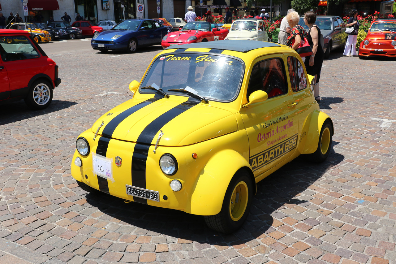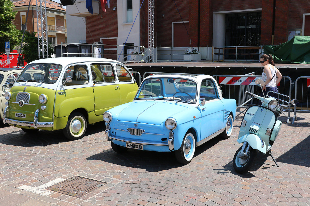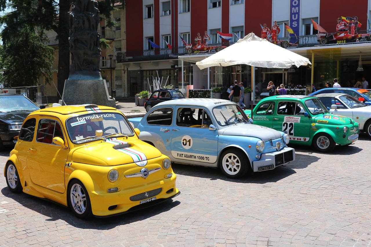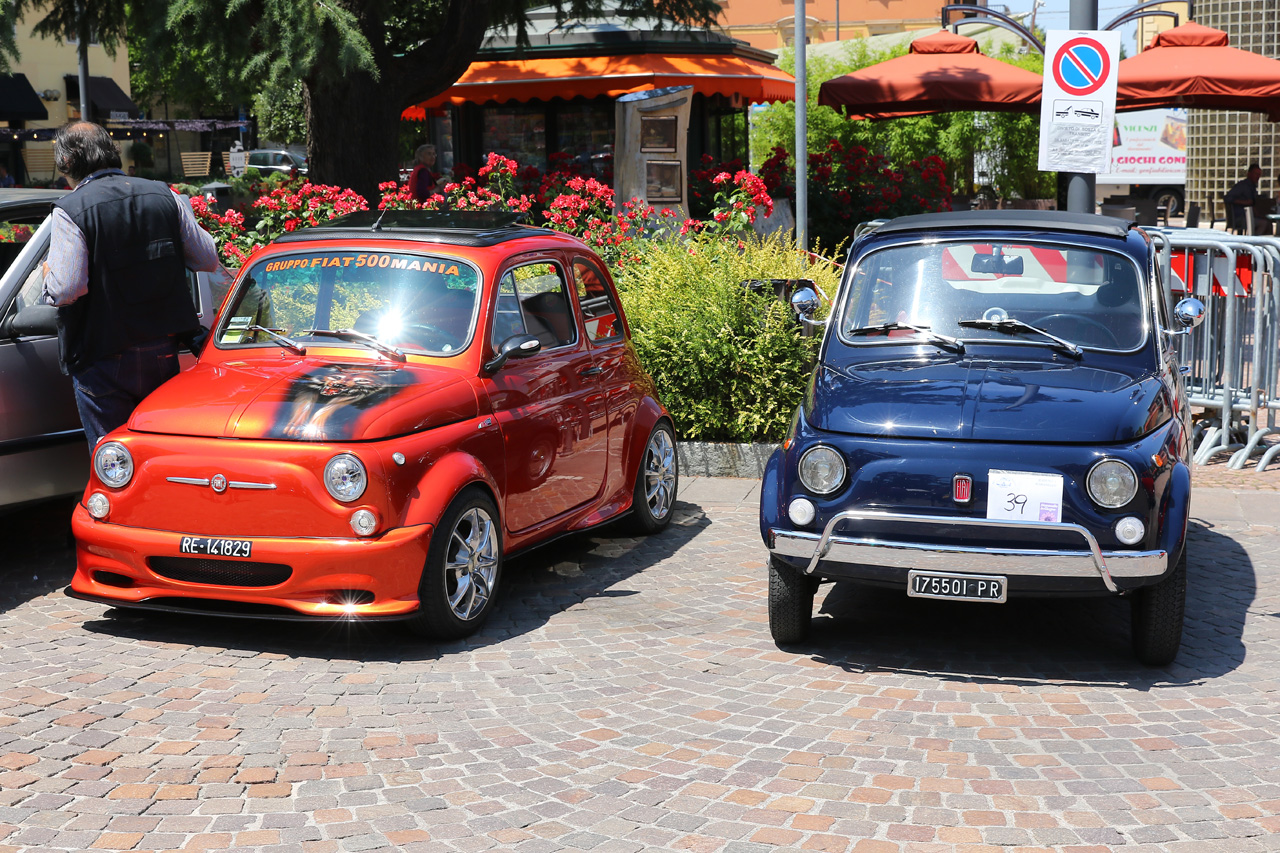 Malgré la chaleur nous décidons de partir en vadrouille dans les rues de la ville. Comme c’est dimanche, c’est peu de dire que c’est mort. Les seules animations dans les rues sont les gogols qui ont loué une Ferrari dans une des boutiques présentes autour du musée et qui font hurler la chiotte – mais trop quand même. Ce qui est drôle c’est qu’on voit autant de Ferrari autour du musée que dans le musée. Bref, nous voila sur la « grande » place de Maranello où il y a un peu de vie! Et pour cause, il y a un rassemblement de Fiat 500 – des vraies hein, pas les daubes qu’on vend aux bobos aujourd’hui. C’est rigolo et il y en a pour tous les goûts. Une fois de retour à la voiture, nous constatons avec plaisir que le pif de la place était gagnant car elle était à l’ombre, ce qui est une bonne chose vu qu’il faisait dans les 33°. Pour la forme nous passerons devant l’entrée du circuit de Fiorano – à 300 mètres du musée – qui est le circuit privé de Ferrari où les voitures sont testés à leur sortie d’usine – usine attenante au circuit.