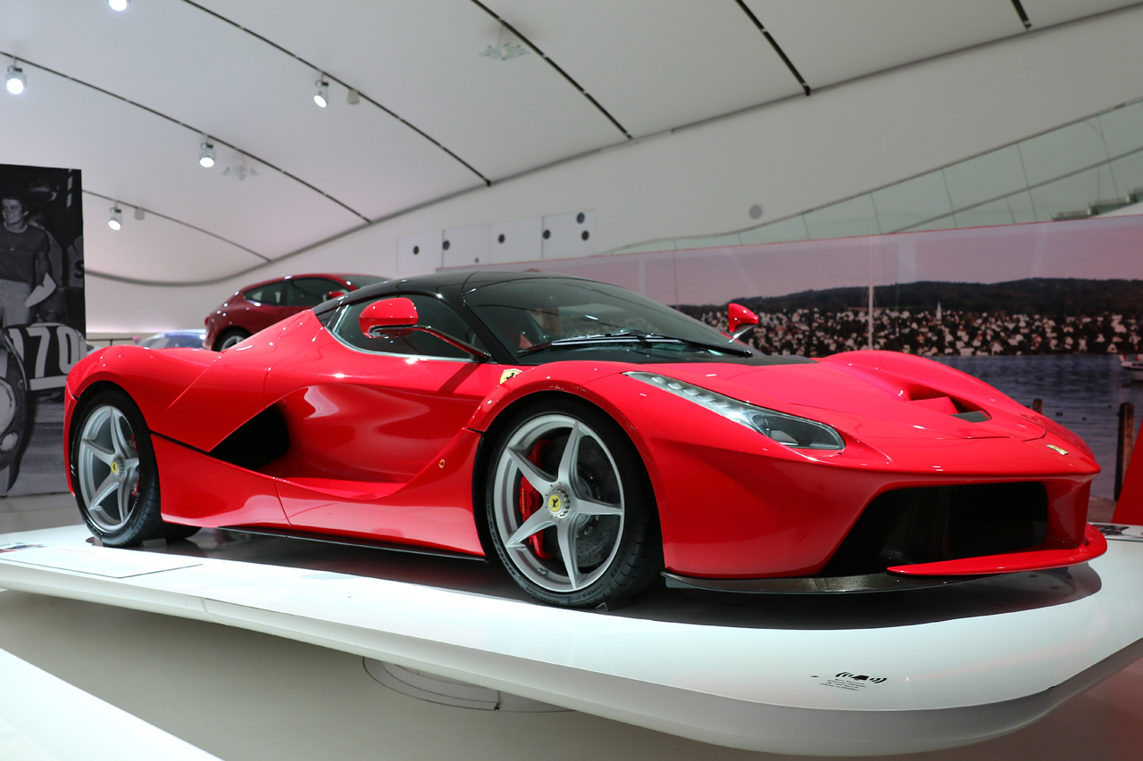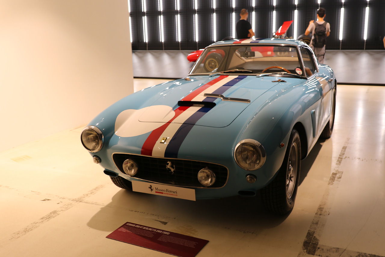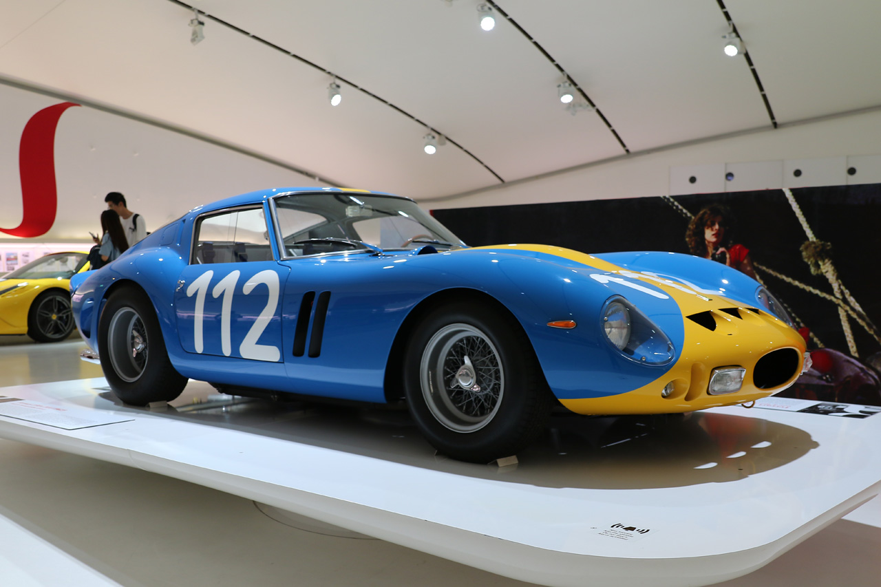 Une fois les bases de la mécanique assimilée, direction le bâtiment principal qui abrite une exposition temporaire. Bien entendu ça tourne toujours autour de Ferrari et des voitures. L’expo du moment est donc dédiée aux femmes et Ferrari – l’idée étant de montrer des modèles Ferrari appartenant ou ayant appartenu à des femmes célèbres – je vous avoue que je n’ai retenu que le nom de Donna Karan. Et là, LA on a retrouvé une partie des joyaux de la couronne. Autant je vous avouerai que la 458 Spétchiaaalé de Donna je m’en battais un peu les reins (c’était la troisième de la journée #blasé) autant le rarissime spyder 250 California de 1957 m’a fait baver. Et que dire de sa copine de 1962, la sublime 250 GTO dans une livrée bleu ciel/jaune tout à fait exquise? Juste WHOW. Et parce qu’il fallait quand même qu’elle se montre, il y avait une LaFerrari! ENFIN! Mais ils l’ont mise dans un recoin pour je ne sais quelle raison. Pas fan plus que ça des lignes de l’engin, c’est quand même plaisant de pouvoir approcher d’aussi près une telle machine. Notre petite visite ne sera interrompu que par un film projeté directement dans la grande salle du musée totalement à la gloire du « commandatore » Enzo Ferrari. Soit.