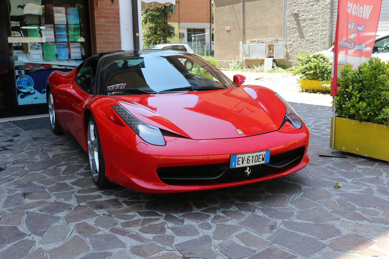 Nous arrivons à Maranello autour de midi et prenons la direction la fabrique Barilla du musée Ferrari. Si vous êtes des habitués du blog, vous savez que nous sommes des champions du parking. Voyant que le parking du musée est payant, on se dit « no way » et décidons d’aller nous garer dans une rue pas loin. Nous y trouvons effectivement un parking, gratuit de surcroît mais limité dans le temps grace à un disque. Notre Punto de loc’ est pourvu d’un disque donc c’est tout bon. Et je pif une place près de l’entrée pas loin d’un arbre prenant le pari que la voiture sera à l’ombre à notre retour.