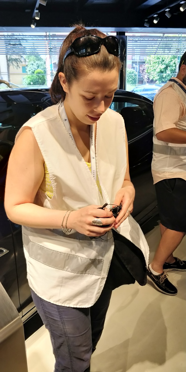 Nous ressortons de là au bout d’une heure. Pas forcément mécontent que se soit fini vu que la guide avait du mal avec son anglais. Nous rendons nos superbes chasubles en échange de quoi on nous remet un bon de réduction de 30% sur la boutique du showroom. C’est gentil mais ça ira. Par contre Maserati fait cadeau des badges visiteurs, une petite attention qui fait plaisir et qu’il n’y a pas eu chez les autres. Nous referons un tour dans le showroom. Aurélie testera la Gran Cabrio. Comme je l’ai dit plus haut, elle valide tout sauf la longueur du capot et les sièges baquets, trop profond à son goût. Si il n’y a que ça…