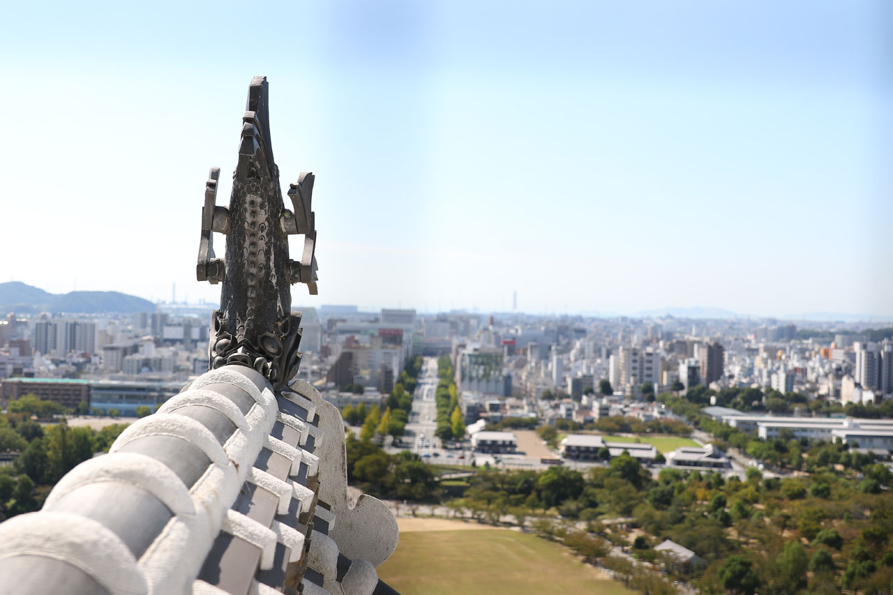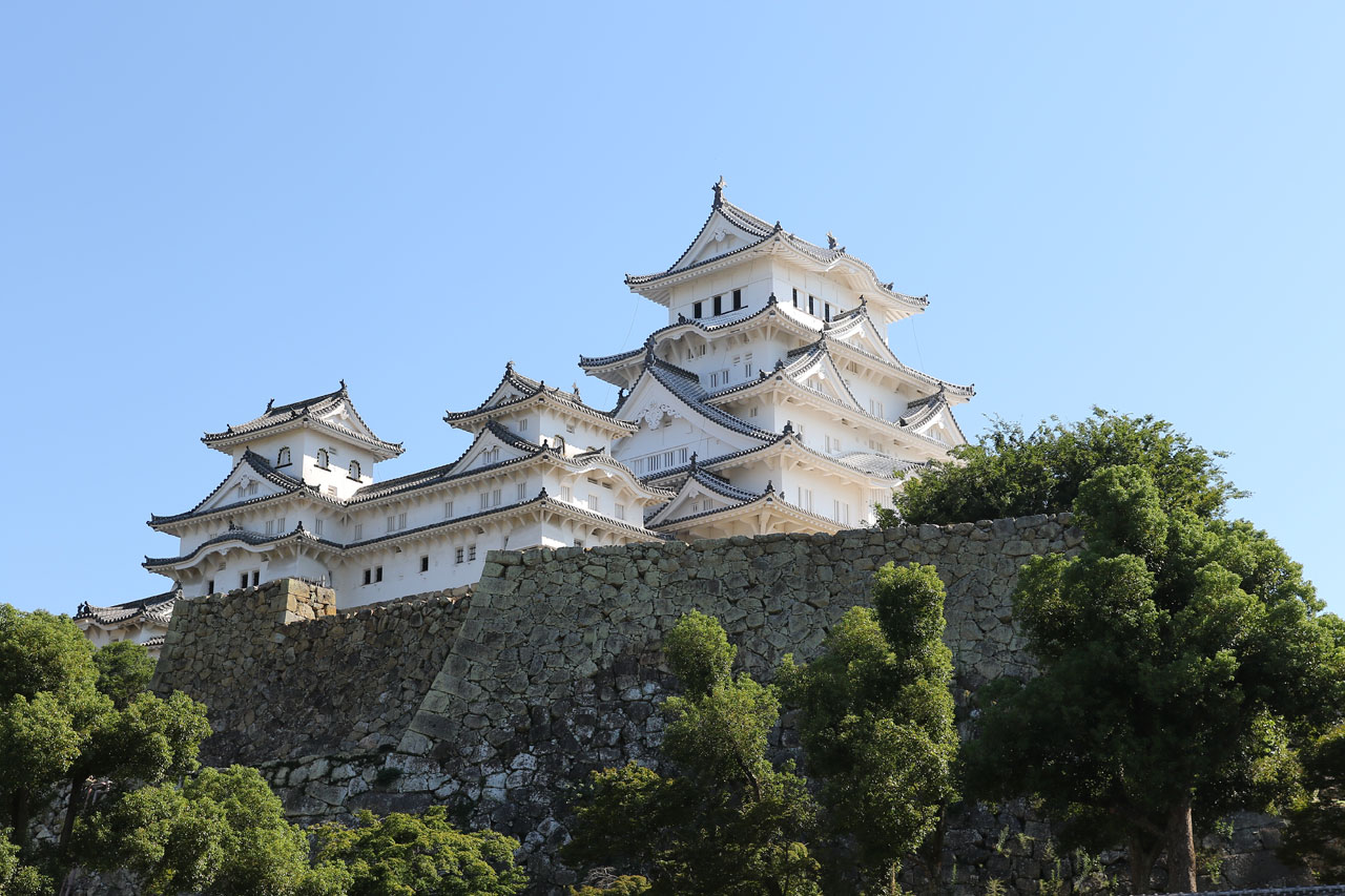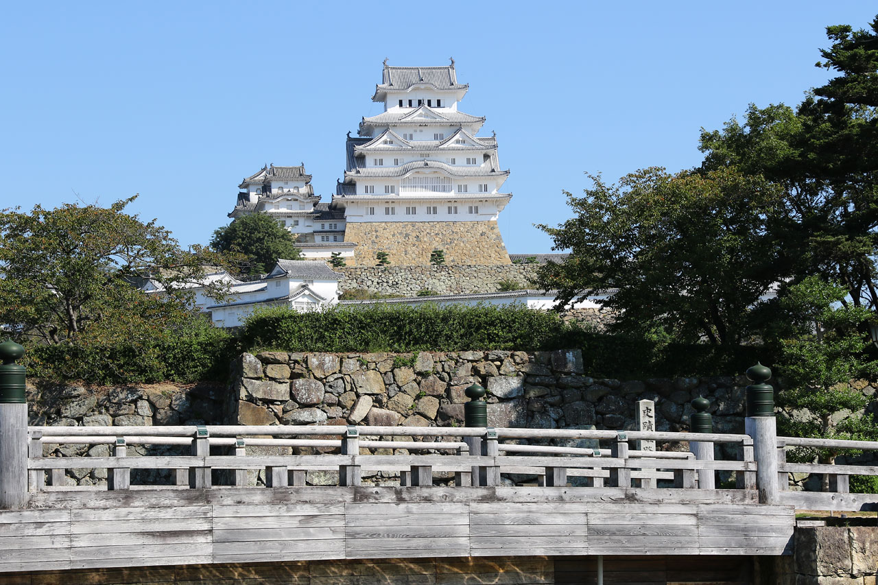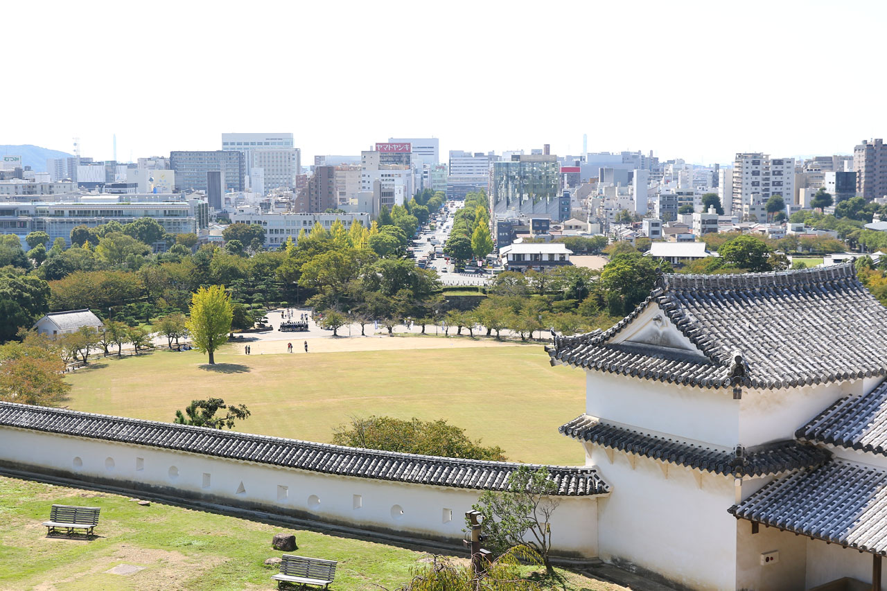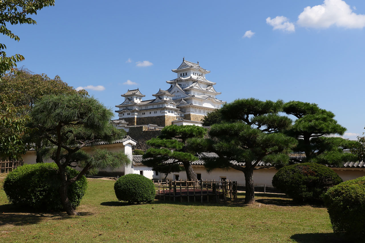 Nous débarquons à Himeji sous un grand soleil. Quant au château, il n’attend que nous et est difficilement manquable. Déjà parce qu’on le voit de la gare, ensuite parce que c’est au bout de la rue.