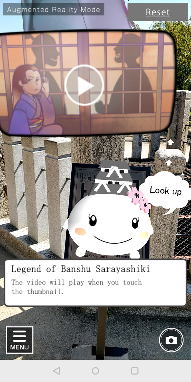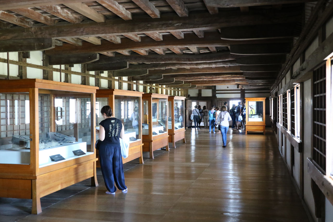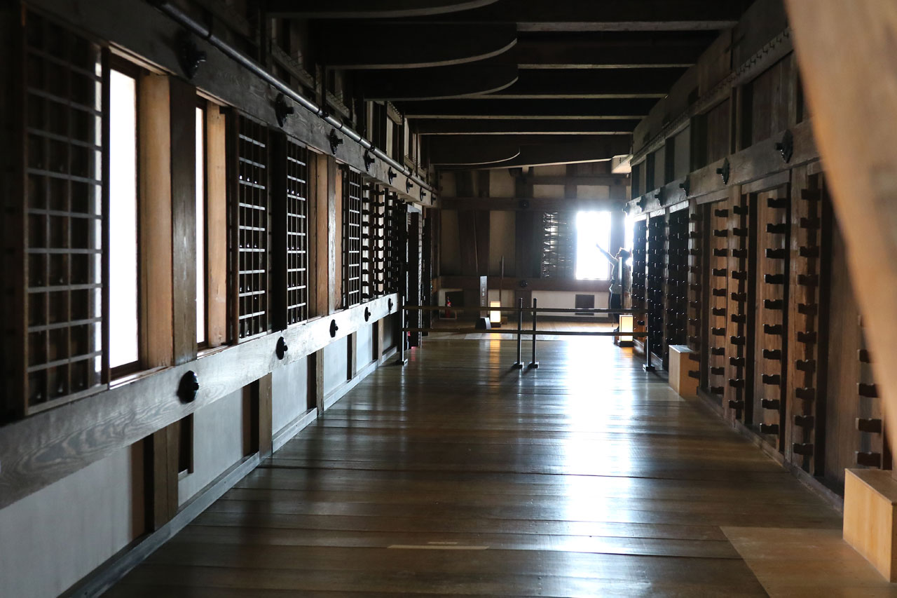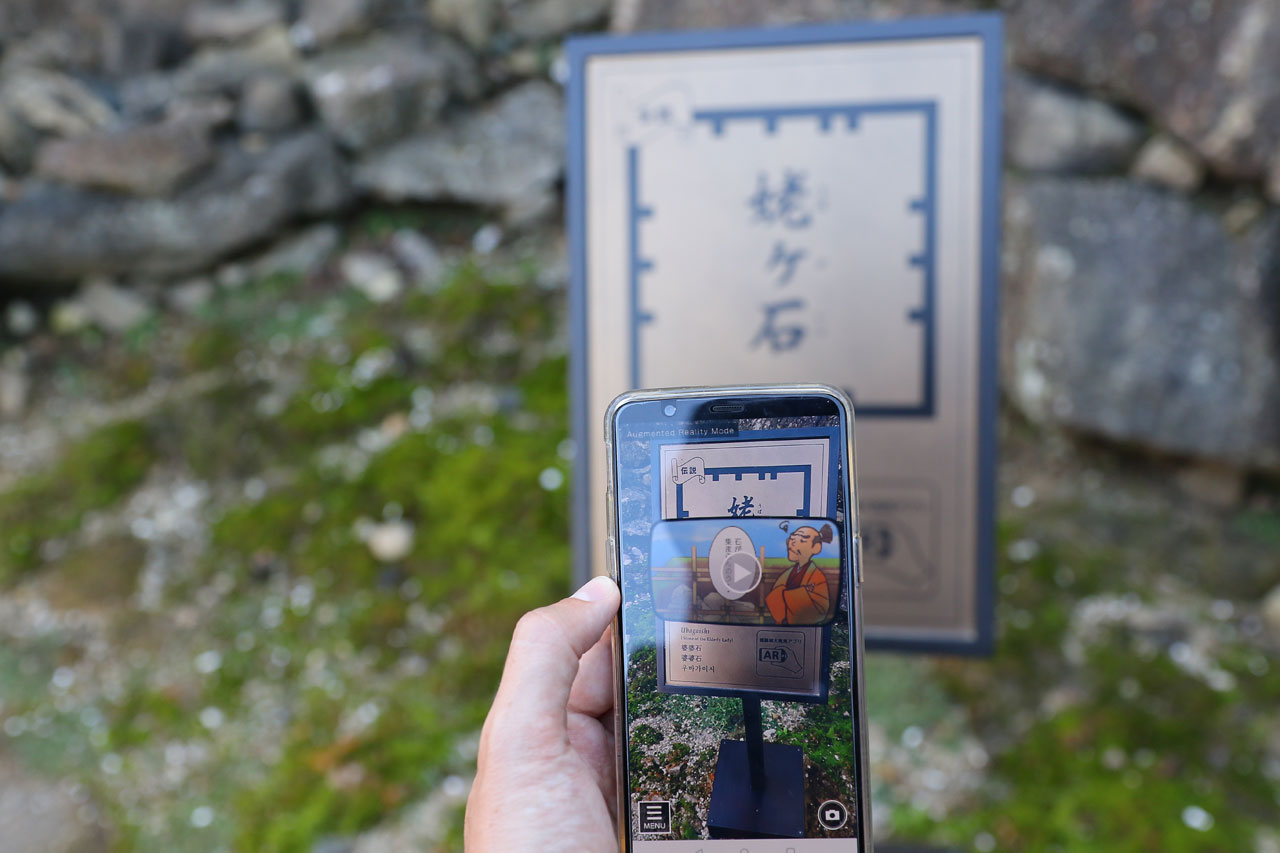 Pour rentrer dans le château il faut contourner les murs d’enceintes, passer dans la grande cour puis commence l’ascension. Car ce petit con a le bon goût d’être construit sur une colline. Une fois dedans, comme d’habitude, il faut retirer ses pompes et se les trimbaler. Pour ce qui est de l’intérieur, c’est un château japonais je vous le rappelle donc C’EST VIDE. Heureusement, pour rendre la visite un peu plus ludique, la ville d’Himeji a fait développer une application mobile utilisant la réalité augmentée afin d’agrémenter certains endroits de compléments d’information en lieu et place des traditionnels panneaux à lire qui sont chiants comme la mort. Le fonctionnement est simple, une fois l’appli installée sur votre téléphone, il suffit de la lancer et de pointer l’appareil photo en direction de bornes disséminées un peu partout. Sur votre écran de mobile apparaît alors un petit encart indiquant qu’il y a une vidéo explicative à visionner ou bien la mascotte du château vous donne une action à faire pour profiter d’une interaction comme voir en temps réel sur l’écran du téléphone la structure en bois du château. Comme c’est japonais, il y a bien entendu les trucs totalement inutile et donc rigoureusement indispensable comme faire apparaître la mascotte sur n’importe quelle photo prise avec le téléphone. Encore une fois je vous renvoie à la galerie pour voir de quoi il retourne.